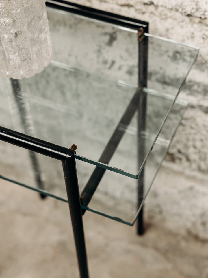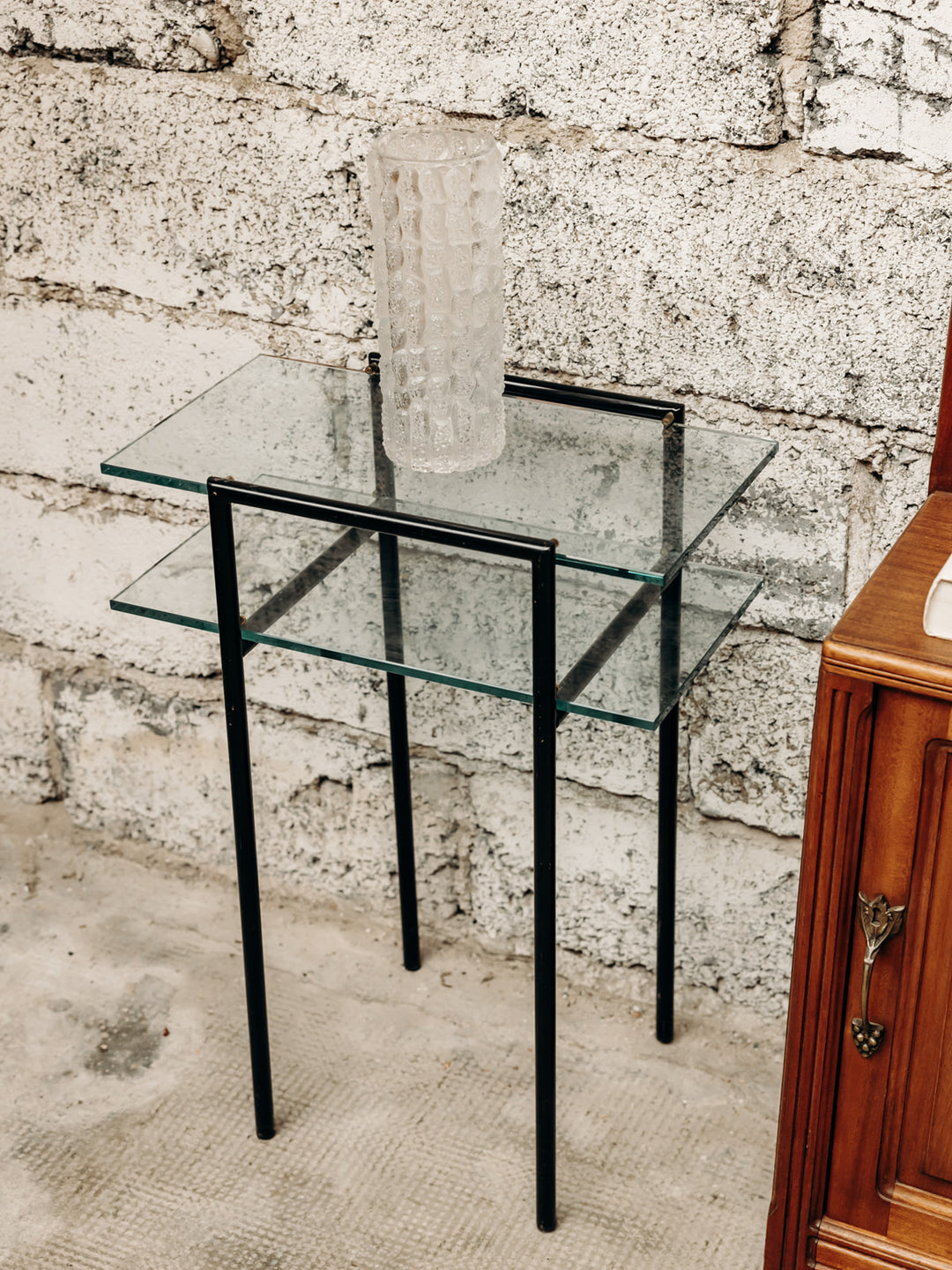 Add a contemporary touch to your home with this small glass and black metal side table. Its sleek, elegant design blends seamlessly with any decor style while also offering practical functionality. Ideal for placing a book, a cup of coffee, or displaying a plant, this table will easily fit into your living room, bedroom, or office. Its compact dimensions and durable materials make it a perfect choice for those seeking both aesthetics and practicality.
