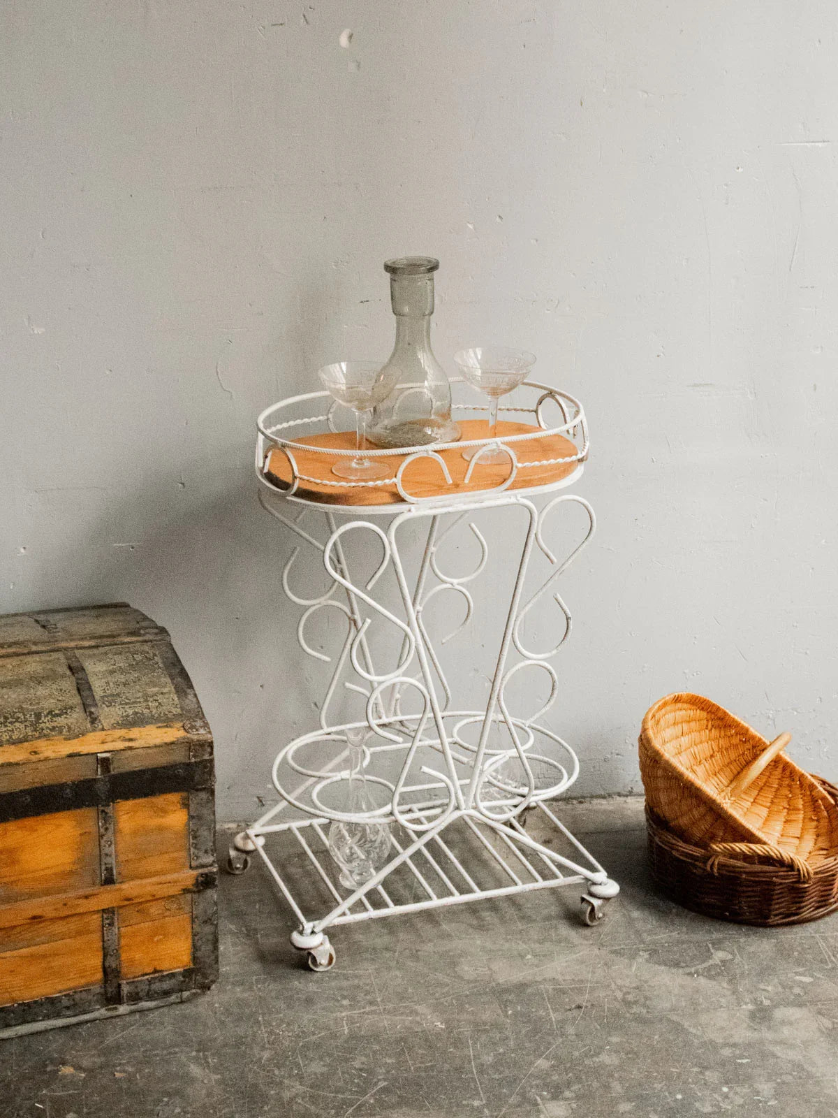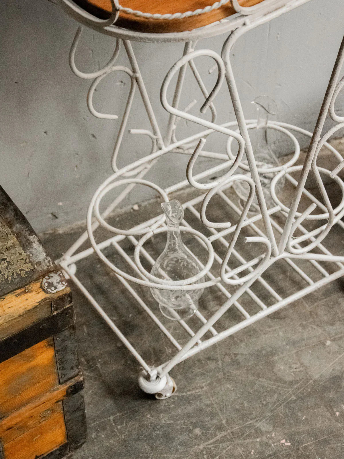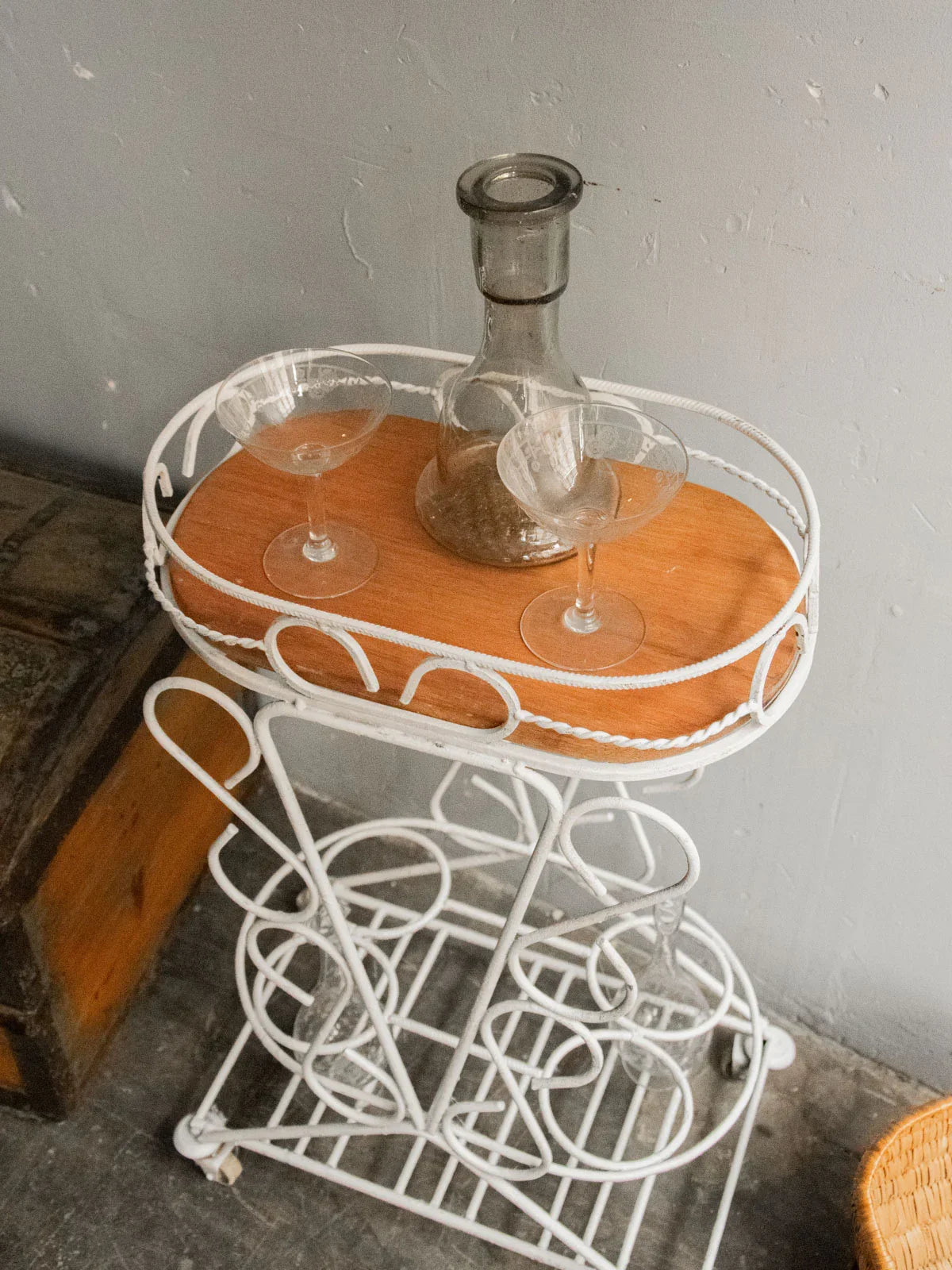 Choose this rolling serving cart with its delicate lines, combining a removable rounded wooden top with a forged metal frame for an elegant balance of warmth and sturdiness. Designed for a compact size, it holds four bottles in designated slots, rests on a lower shelf useful for glasses and accessories, and moves easily to streamline your gatherings. Ideal for casual drinks on a balcony or in a living room, it creates an intimate and sophisticated atmosphere.