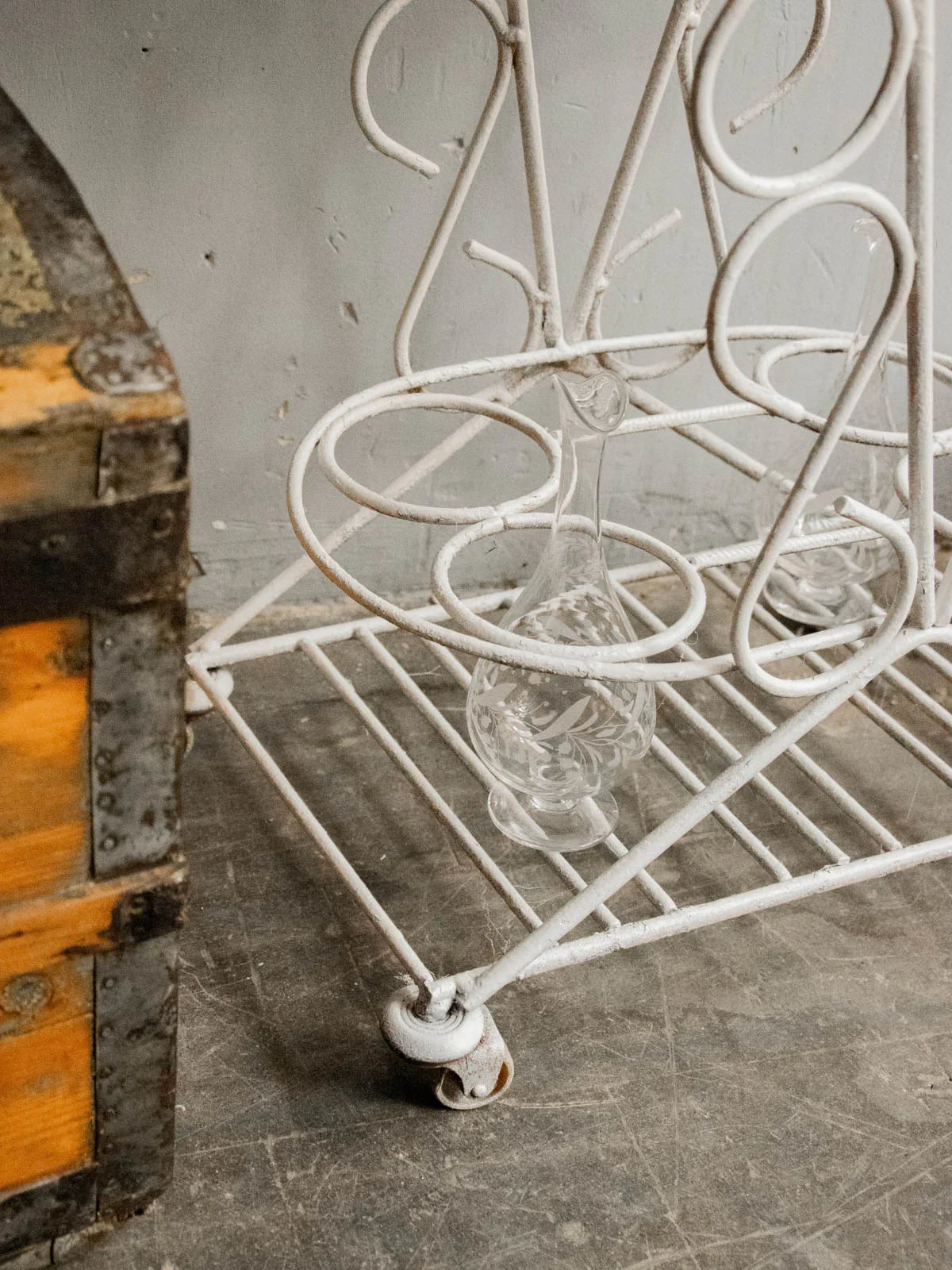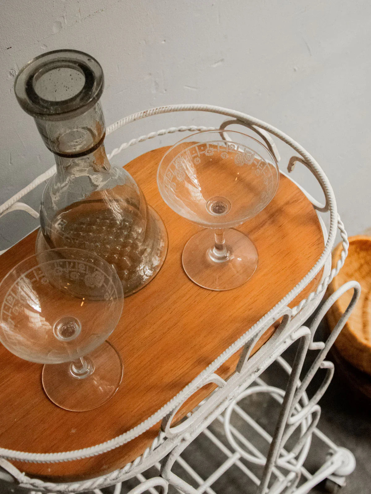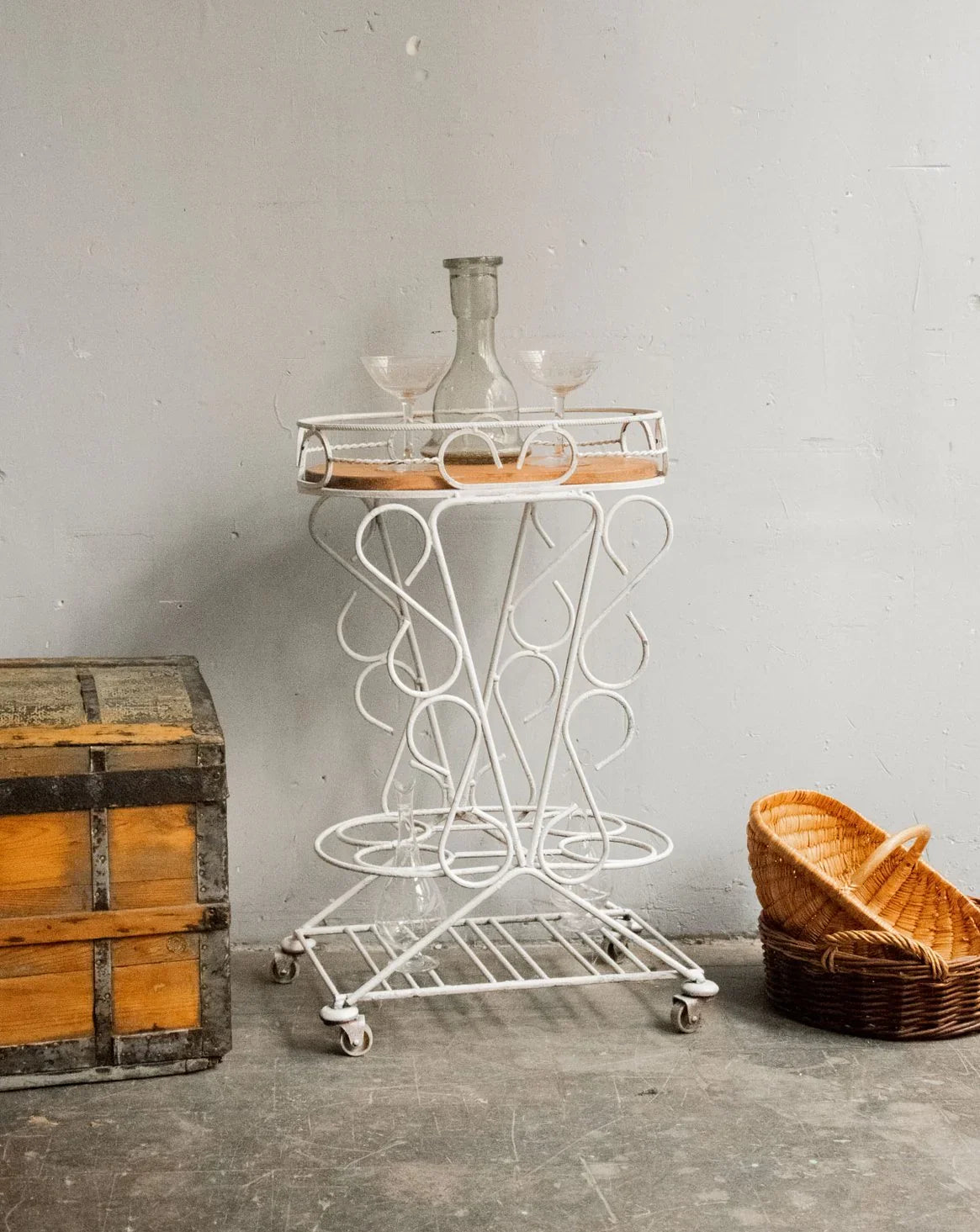 Choose this rolling serving cart with its delicate lines, combining a removable rounded wooden top with a forged metal frame for an elegant balance of warmth and sturdiness. Designed for a compact size, it holds four bottles in designated slots, rests on a lower shelf useful for glasses and accessories, and moves easily to streamline your gatherings. Ideal for casual drinks on a balcony or in a living room, it creates an intimate and sophisticated atmosphere.