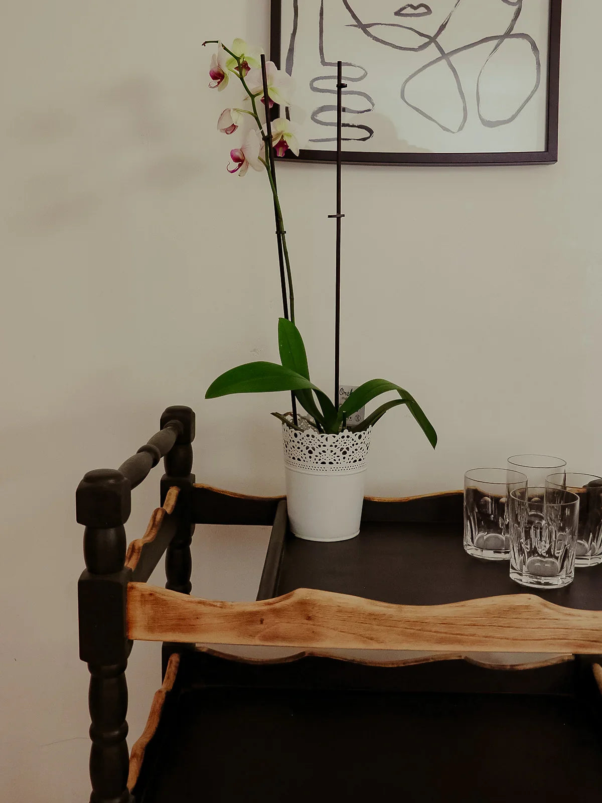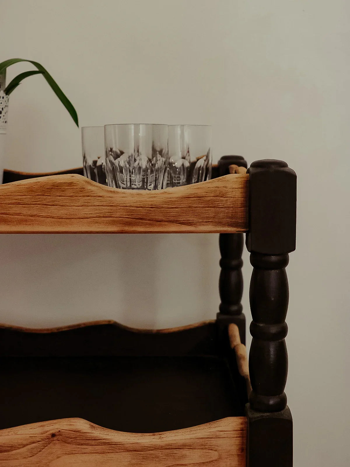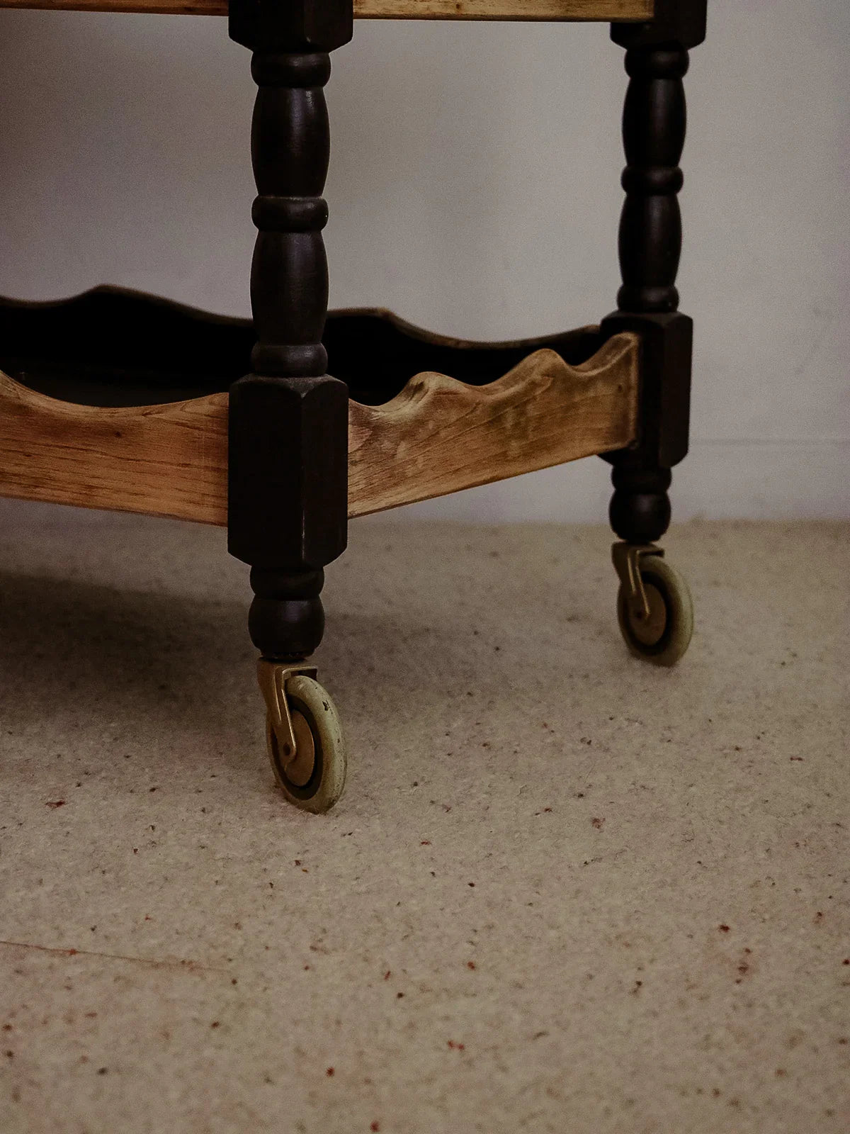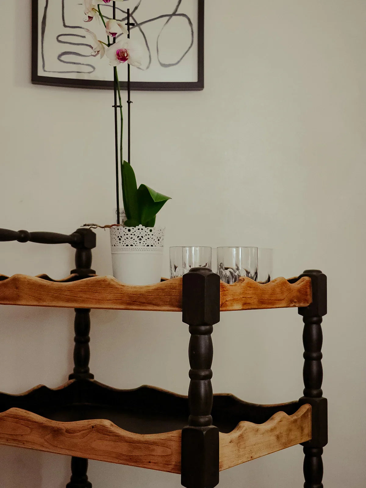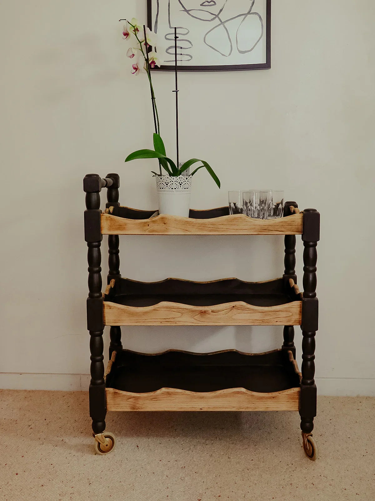 Choose this oak serving cart with its striking black and light wood contrast. Its compact size and four functional casters make it easy to move between the kitchen and dining room while providing a practical surface for dishes, plants, or a coffee maker. The warmth of the oak combined with the black finish creates an elegant and inviting atmosphere, perfect for a coffee corner or as an extra serving surface.