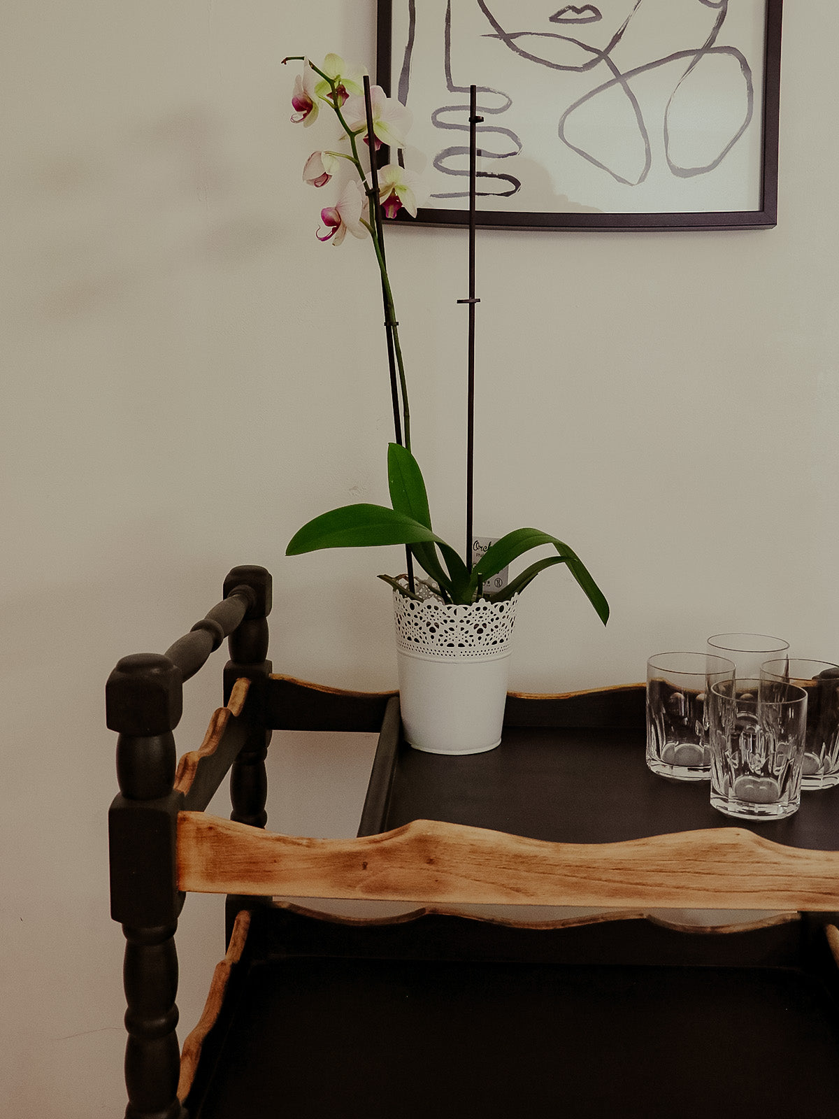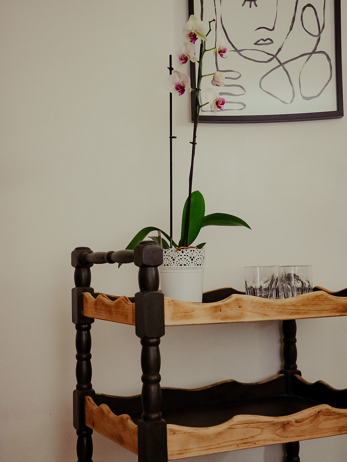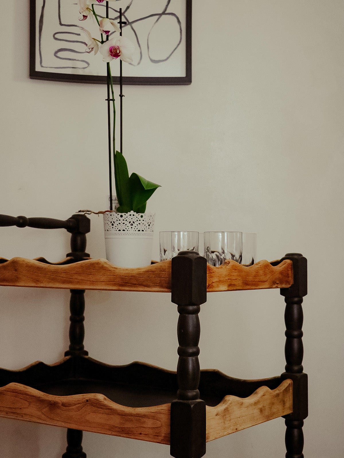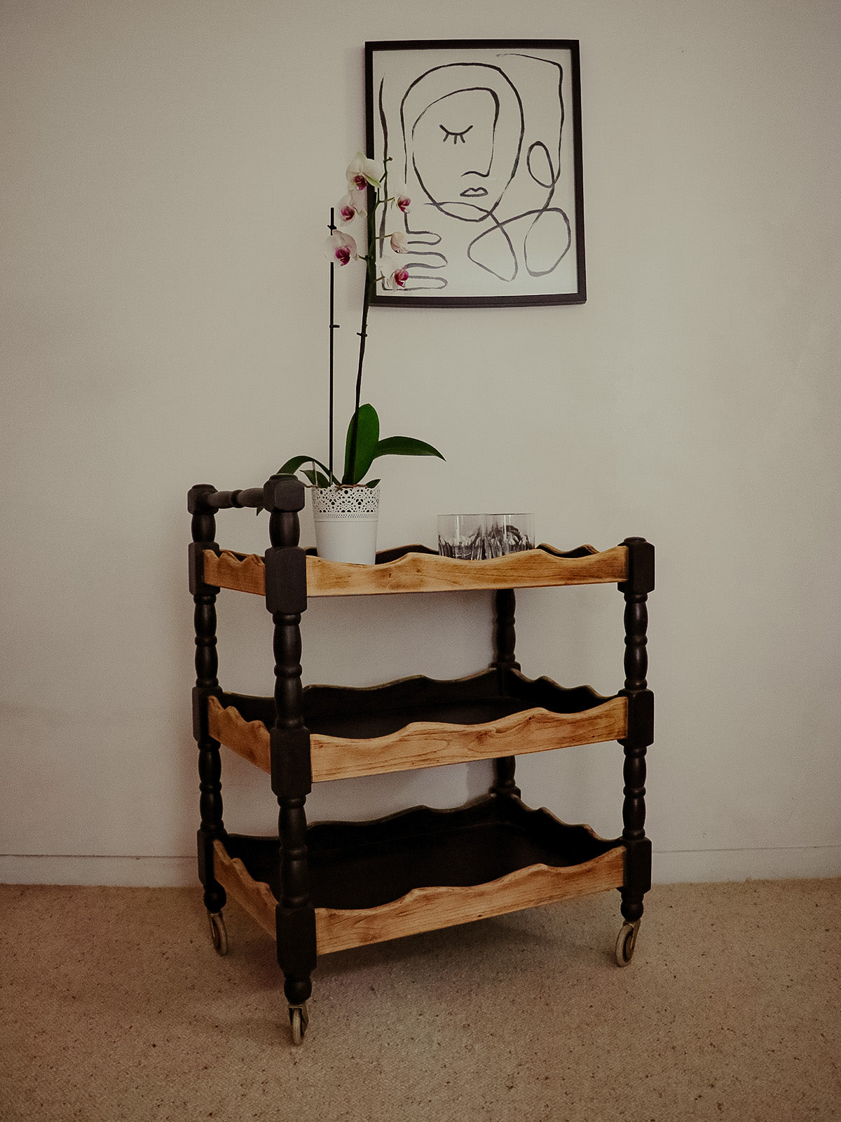 Adoptez cette desserte en chêne au contraste noir et bois clair. Son format compact et ses quatre roulettes fonctionnelles facilitent les déplacements entre cuisine et salle à manger tout en offrant une surface pratique pour poser vaisselle, plante ou cafetière. La chaleur du chêne associée à la teinte noire crée une ambiance élégante et conviviale, parfaite pour un coin café ou un service d'appoint.