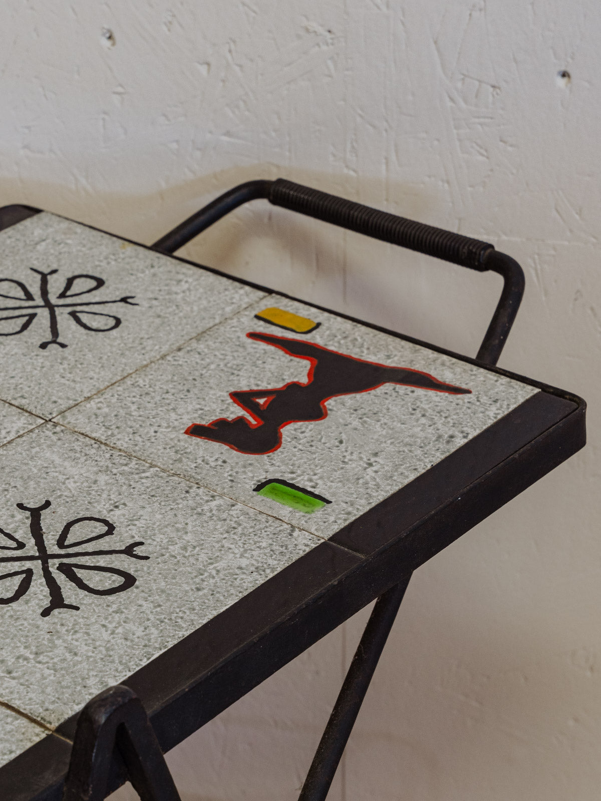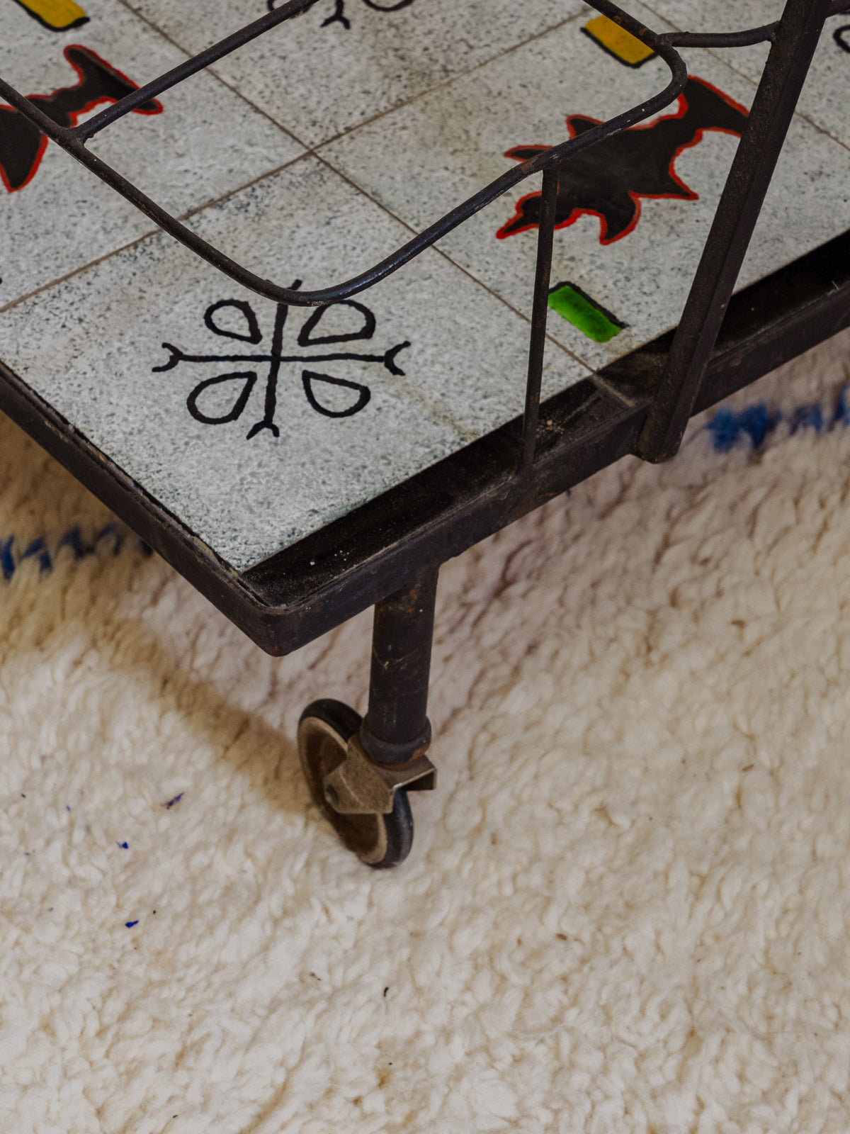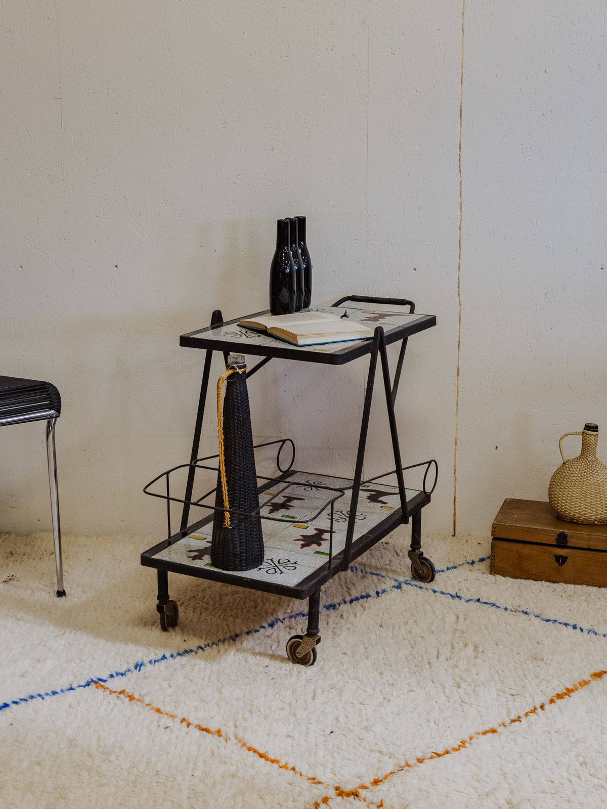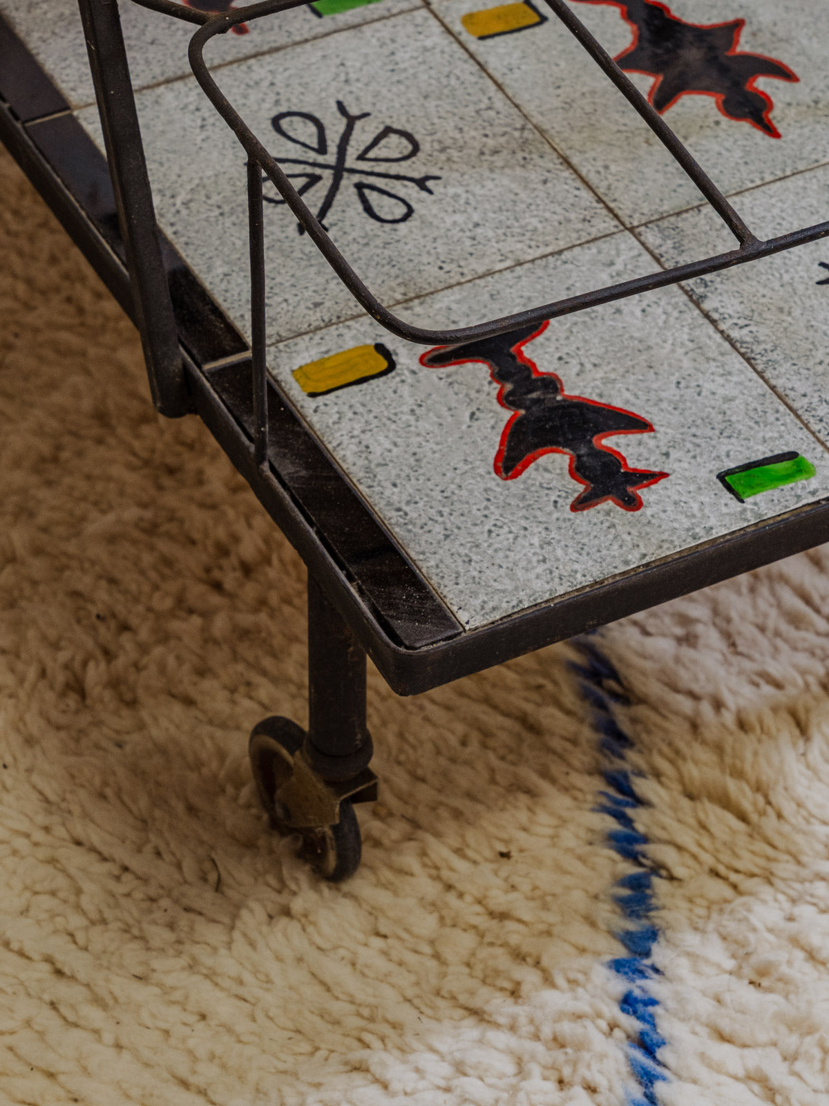 Embrace this 1960s serving cart with its black iron frame and gray ceramic shelves adorned with colorful patterns, adding a vintage and graphic touch to your interior. Two tiers and mounted on casters make serving and moving easy, while its three side compartments provide space for bottles and accessories, keeping your bar area organized. Its sleek silhouette fits perfectly in a kitchen or a cozy living room. Some signs of age are present.