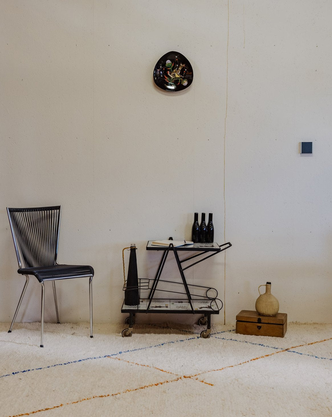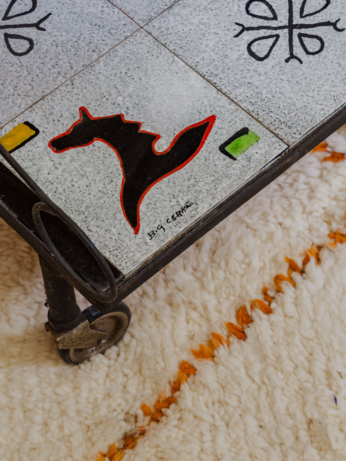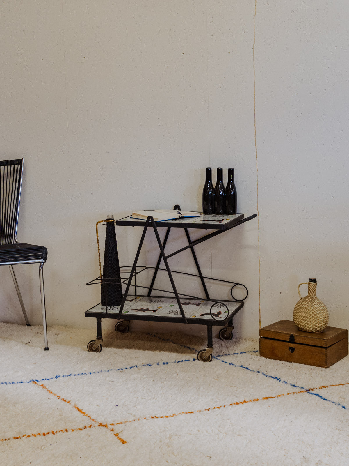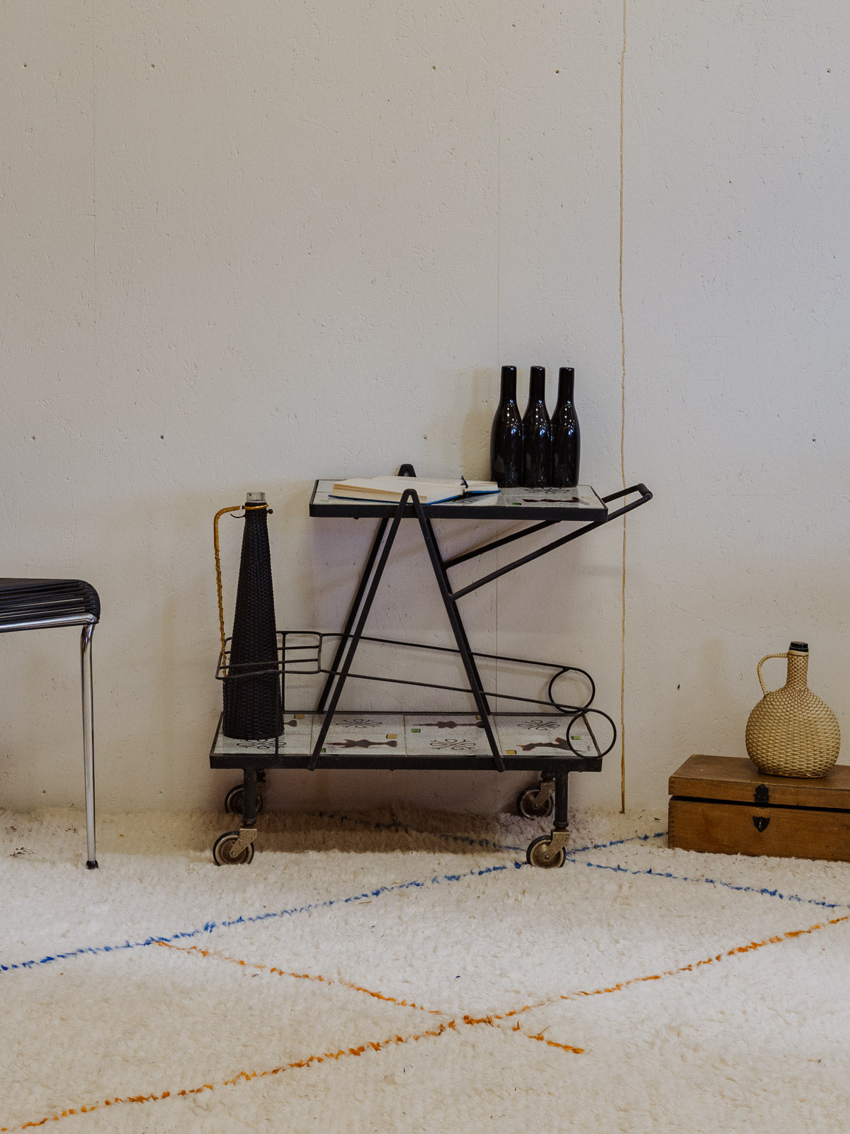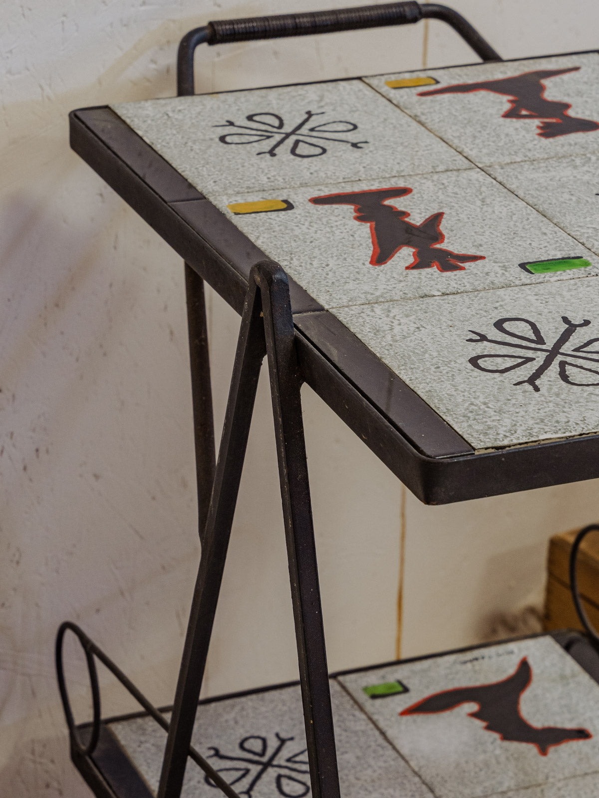 Embrace this 1960s serving cart with its black iron frame and gray ceramic shelves adorned with colorful patterns, adding a vintage and graphic touch to your interior. Two tiers and mounted on casters make serving and moving easy, while its three side compartments provide space for bottles and accessories, keeping your bar area organized. Its sleek silhouette fits perfectly in a kitchen or a cozy living room. Some signs of age are present.