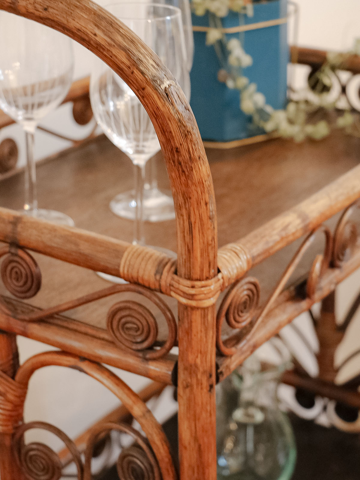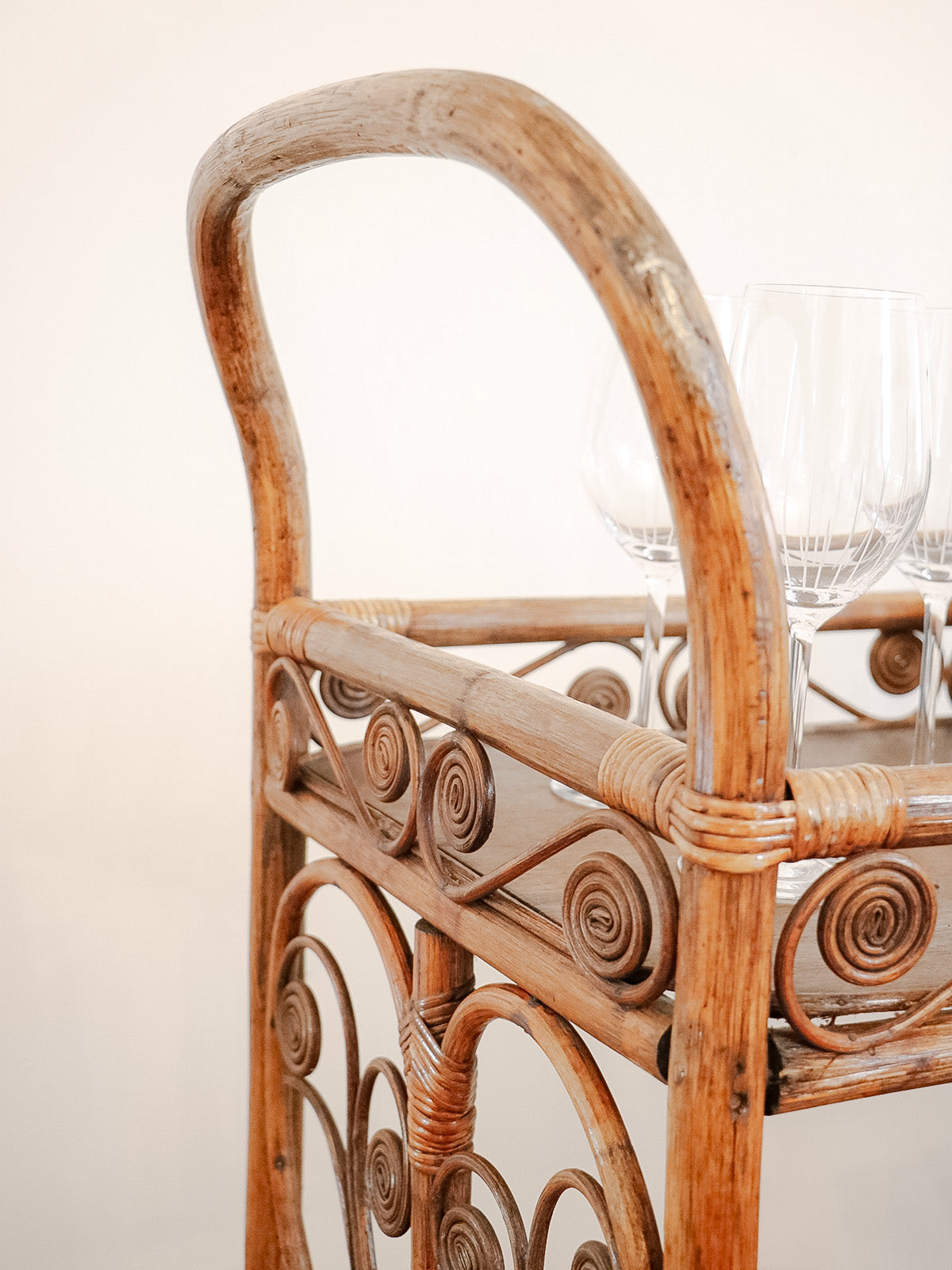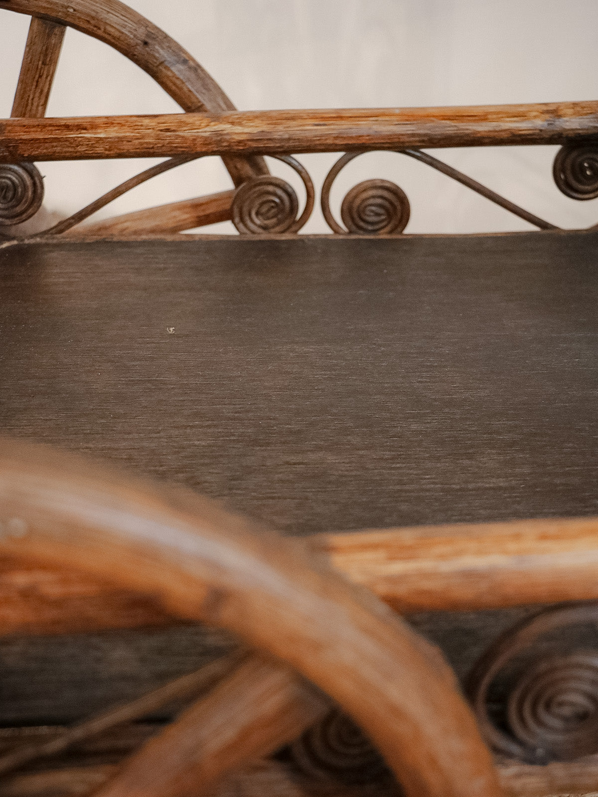 Elevate your interior with this 1960s rattan side table, where the swirling peacock-style scrolls create a refined and graphic silhouette. Its slender frame and two well-spaced shelves offer a discreet display for plants, books, or decorative objects. One small flaw: a missing swirl.