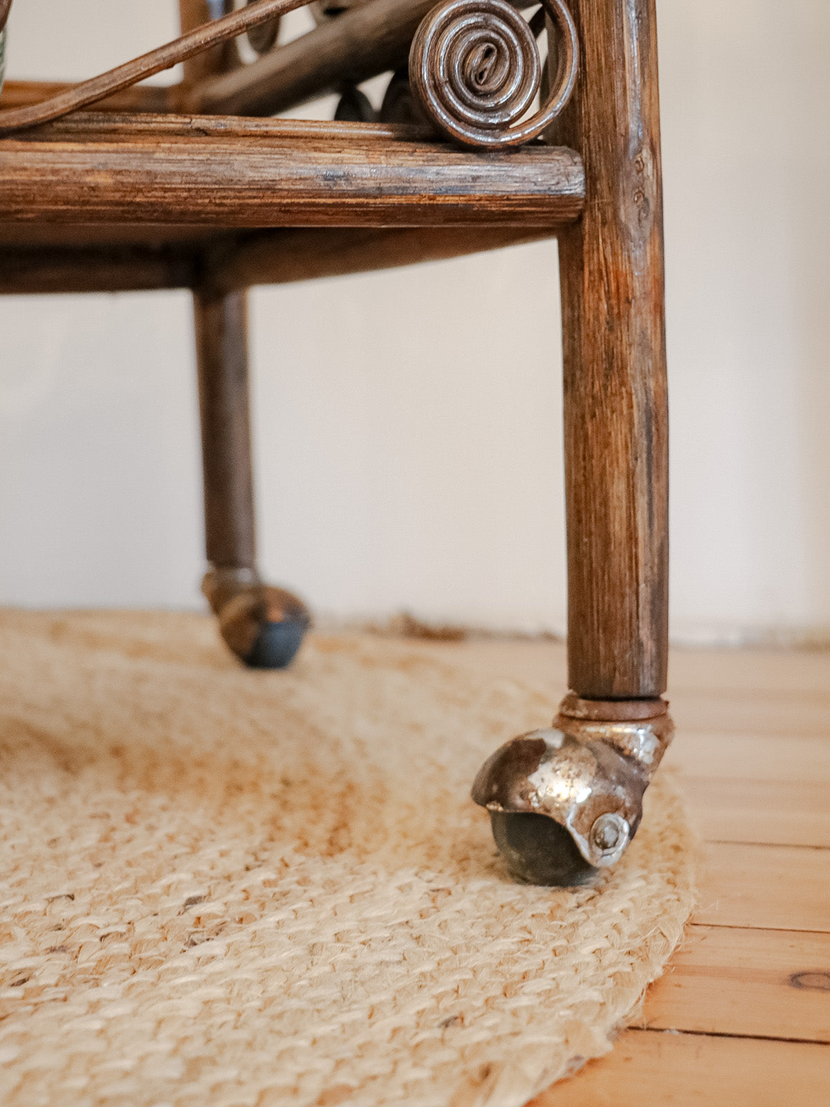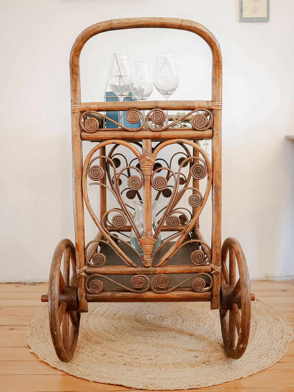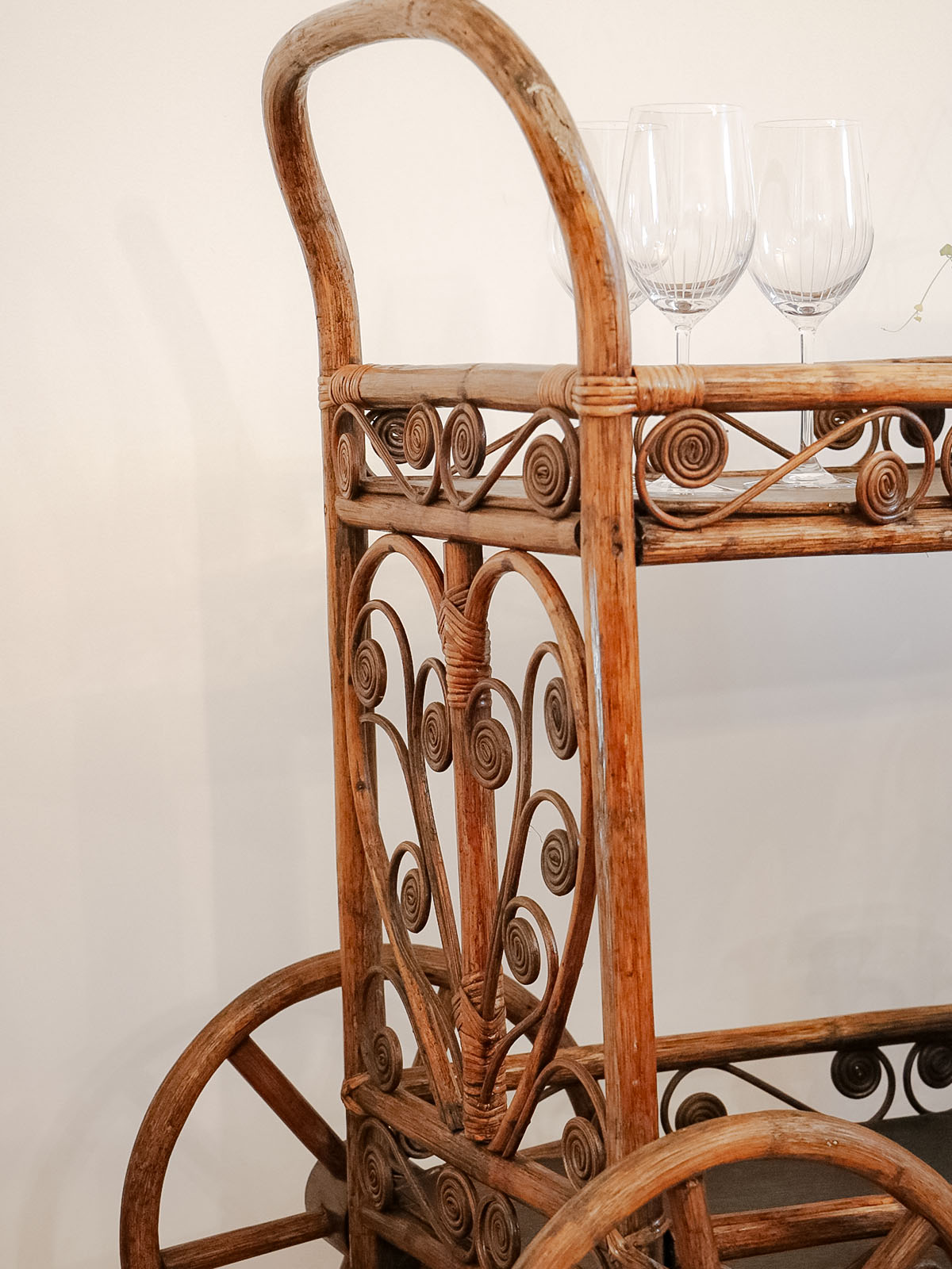 Elevate your interior with this 1960s rattan side table, where the swirling peacock-style scrolls create a refined and graphic silhouette. Its slender frame and two well-spaced shelves offer a discreet display for plants, books, or decorative objects. One small flaw: a missing swirl.