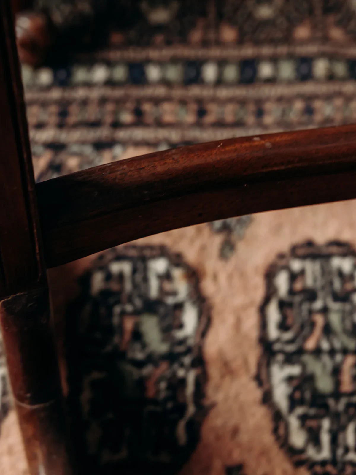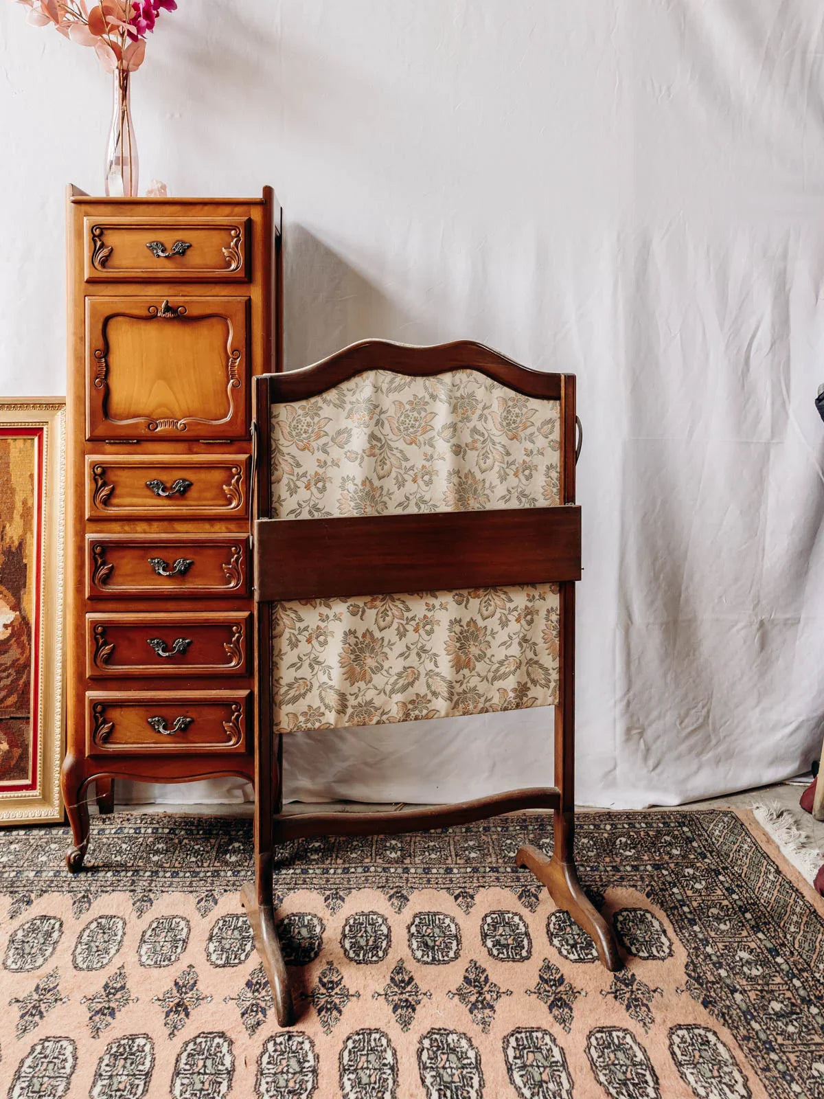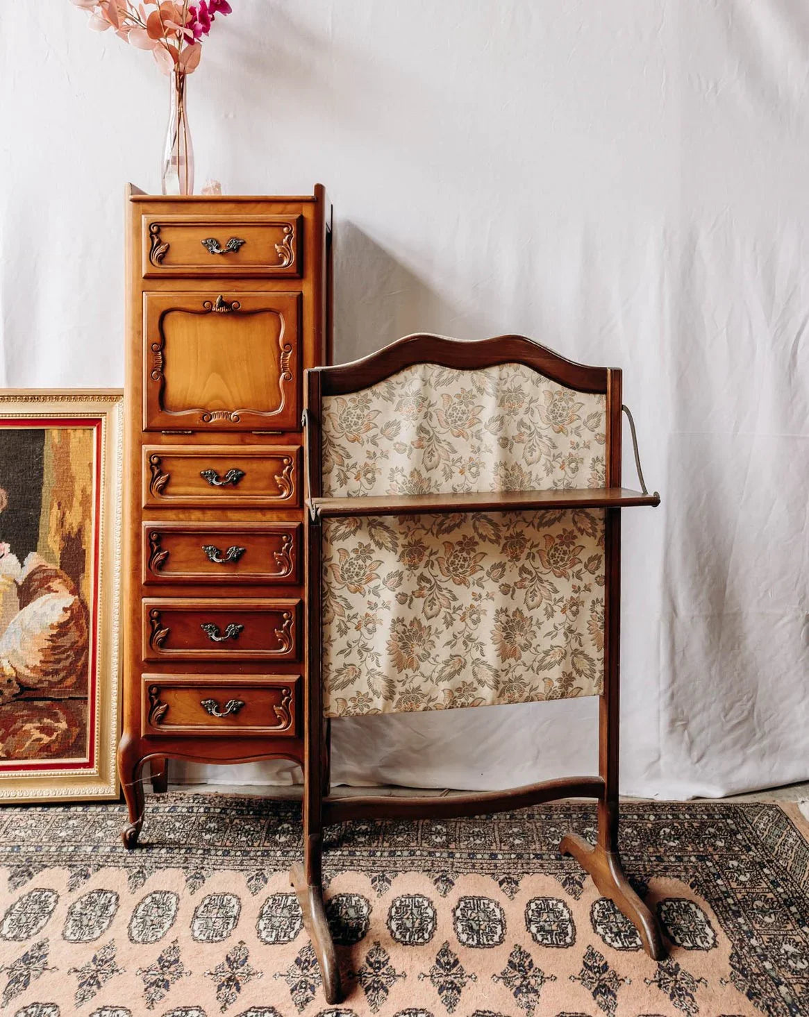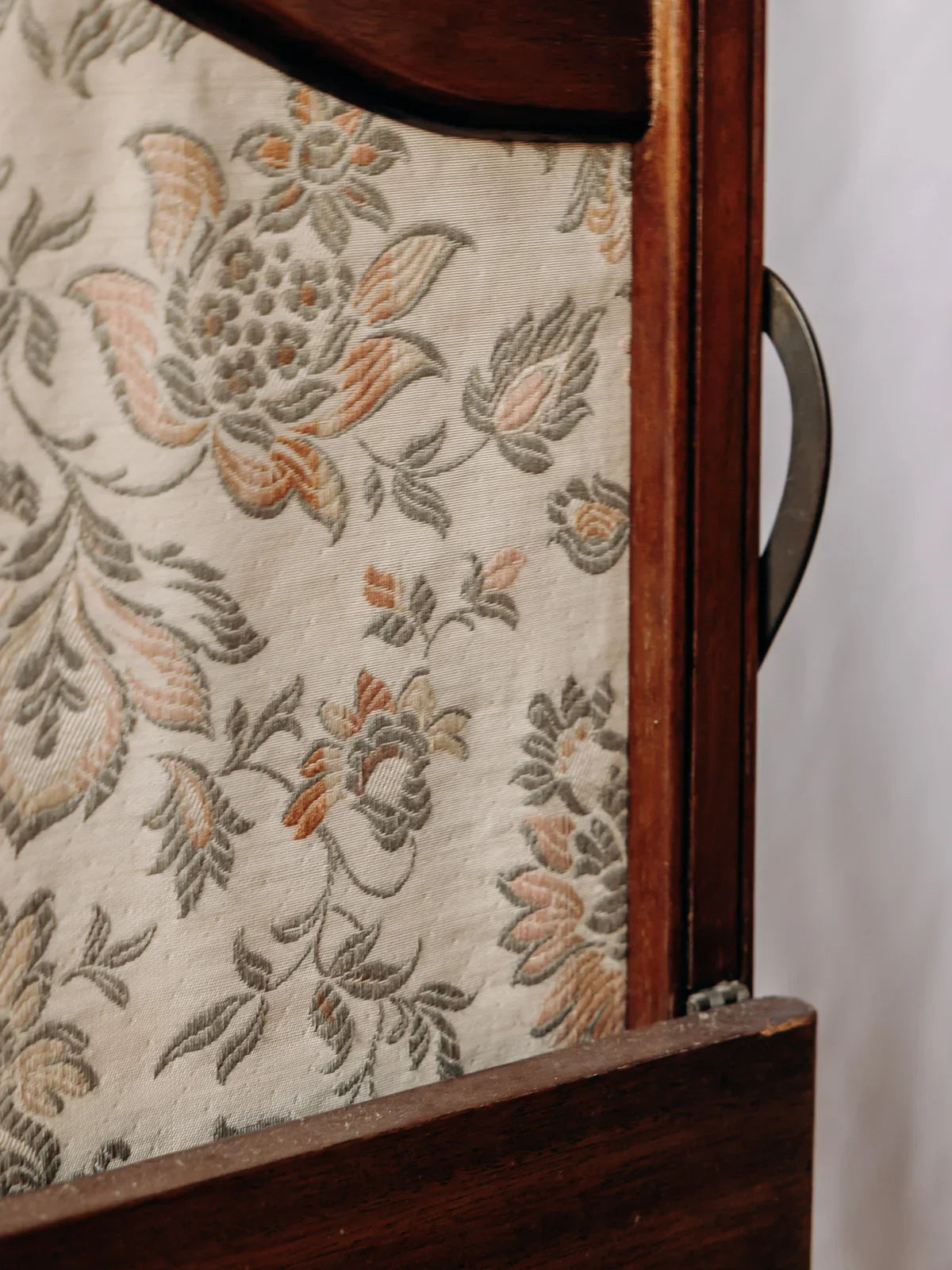 Enhance your fireplace with this dark wood fire screen, featuring a simple curve and a panel upholstered in a floral fabric that adds a warm, retro touch. Its splayed legs ensure stability in front of the hearth, while the small folding shelf and integrated hooks offer a convenient space for a cup, a utensil, or an accessory. Ideal for creating a welcoming atmosphere in a living room or conservatory, it combines functionality with traditional elegance.