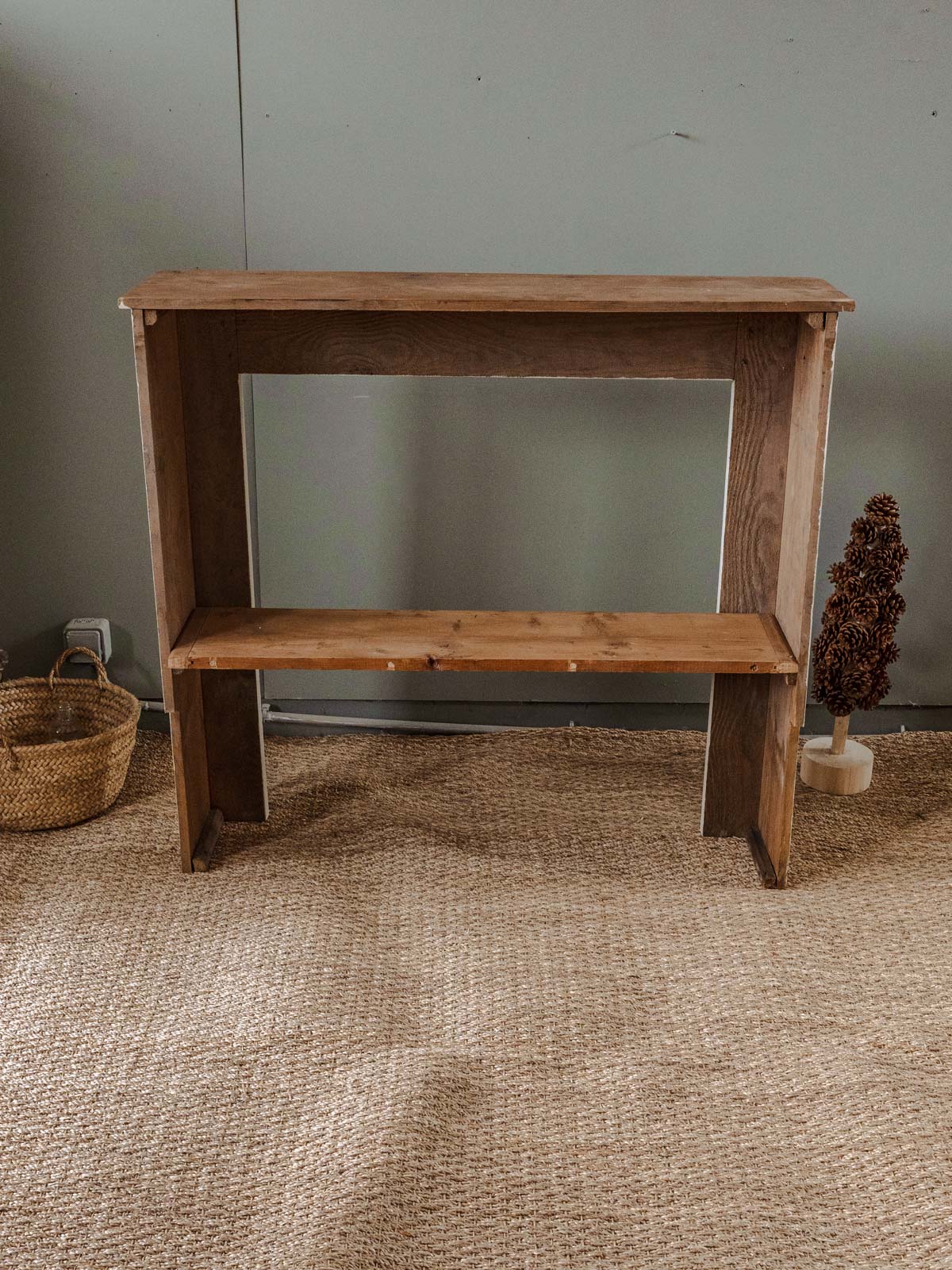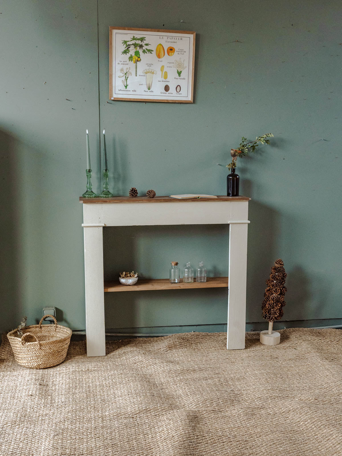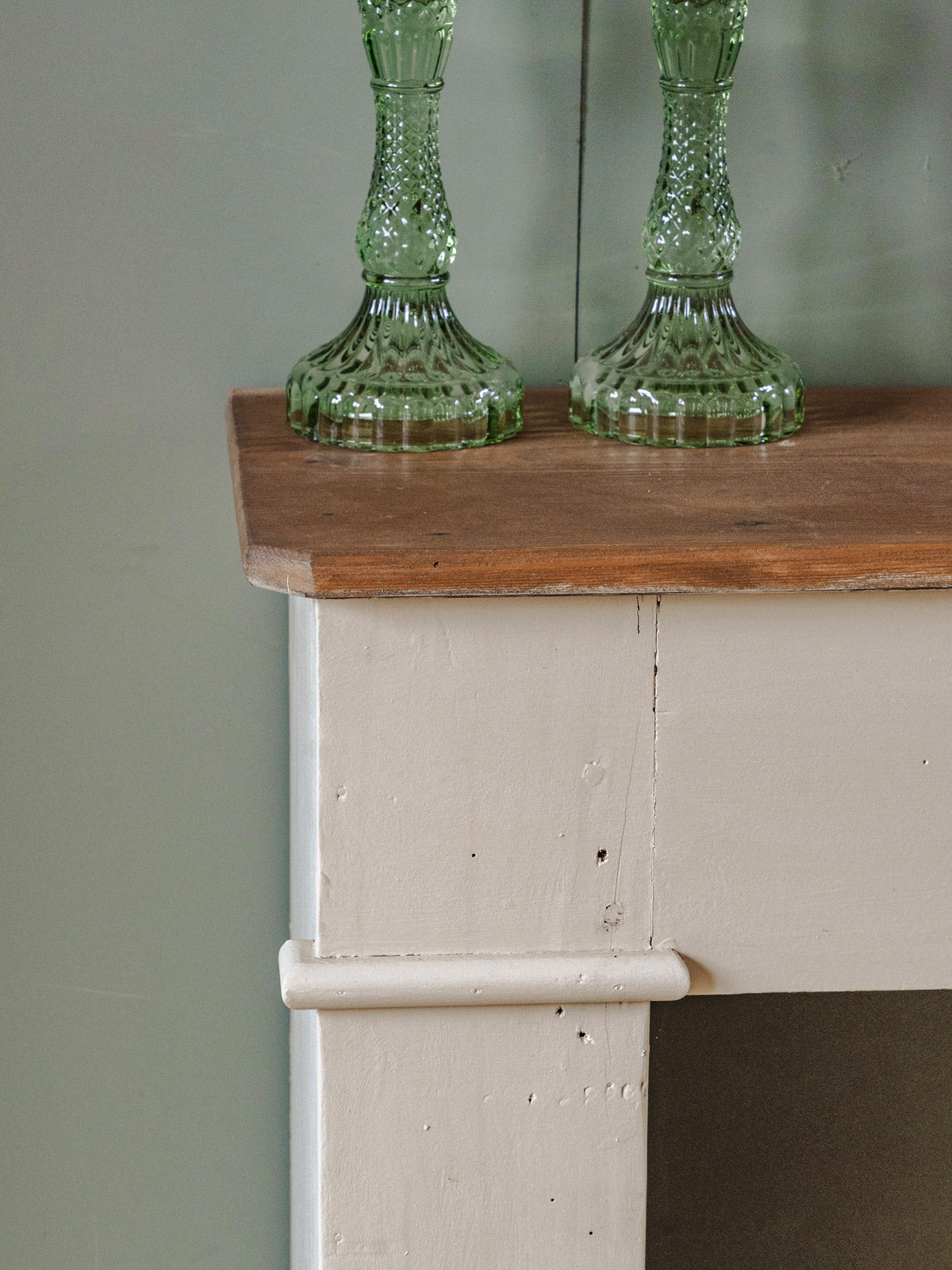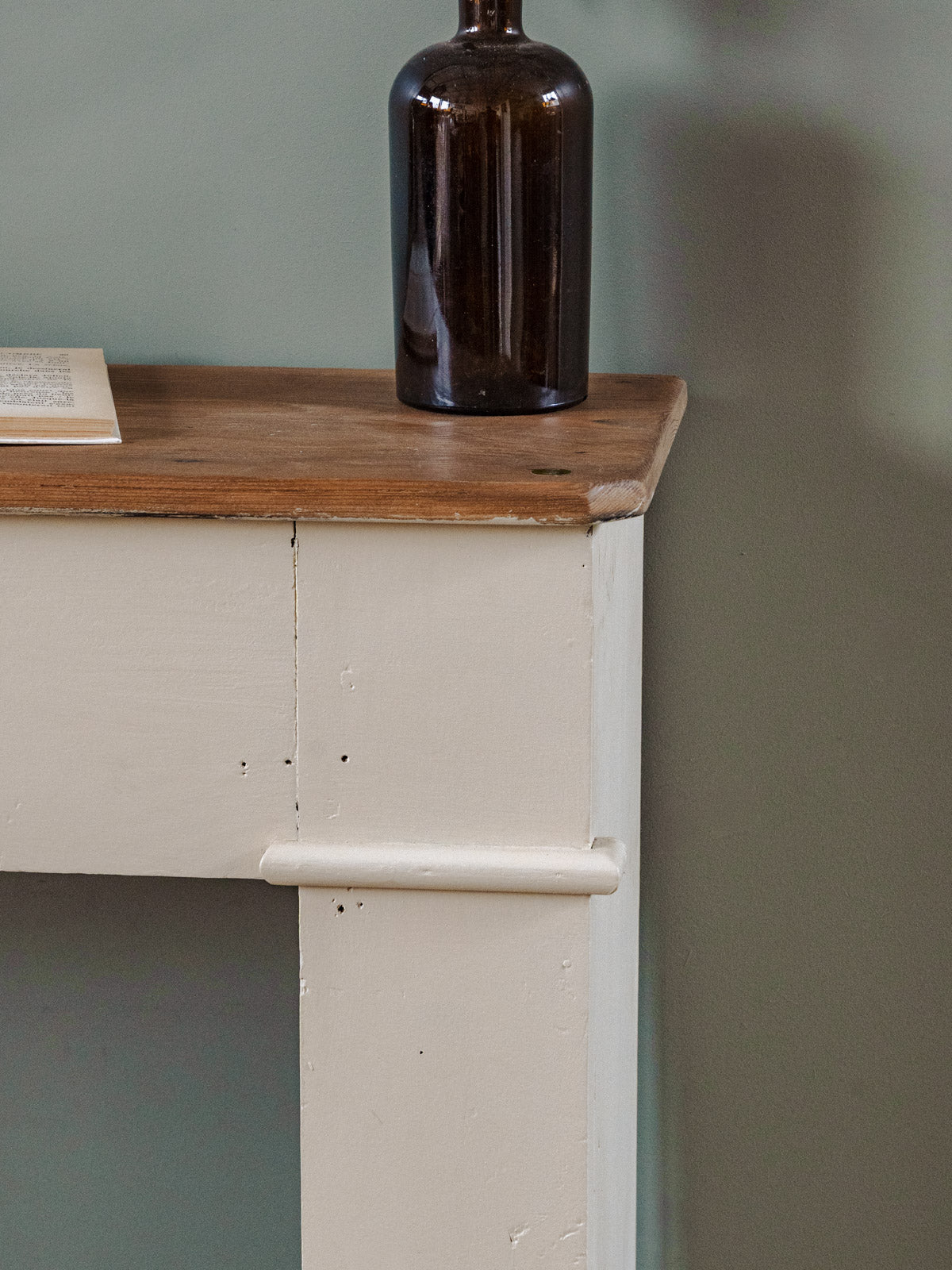 Enhance your interior with this wooden fireplace mantel, its body repainted in an off-white beige, offering a warm and understated aesthetic. Its shelf and niche provide space for displaying candles, picture frames, and small decorative objects, while its proportions make it equally suitable for a living room or entryway. The soft patina of the paint highlights the wood, creating an inspiring and elegant atmosphere. Minor signs of age are present.
