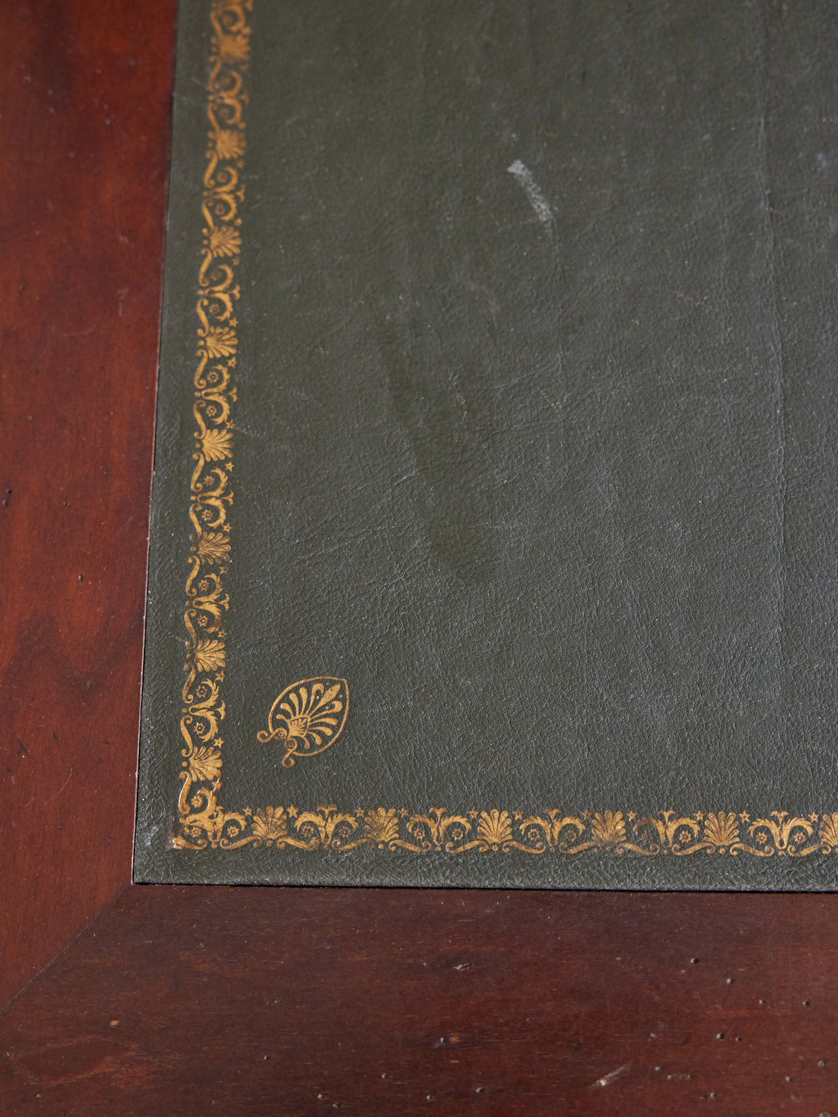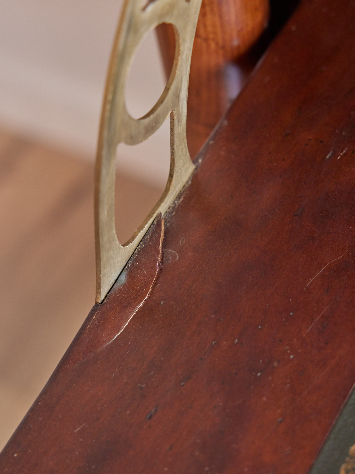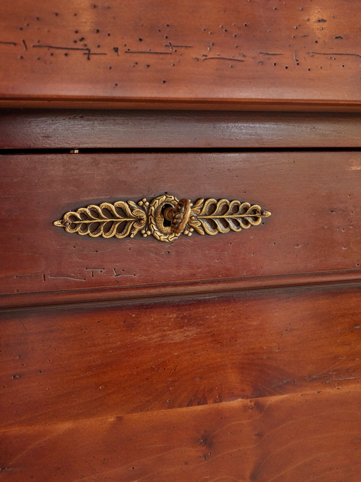 Elevate your workspace with this solid wood Empire-style secretary desk, where the distinctive columns accentuate its majestic silhouette. The lower section, featuring three large drawers, offers neat storage, while the upper section, with its five smaller drawers and three open shelves, provides space for organizing correspondence and small items. The original leather top and gilt embellishments lend a refined finish and a beautiful period patina. Perfect for an office, entryway, or reading nook, it brings a warm and classic atmosphere.