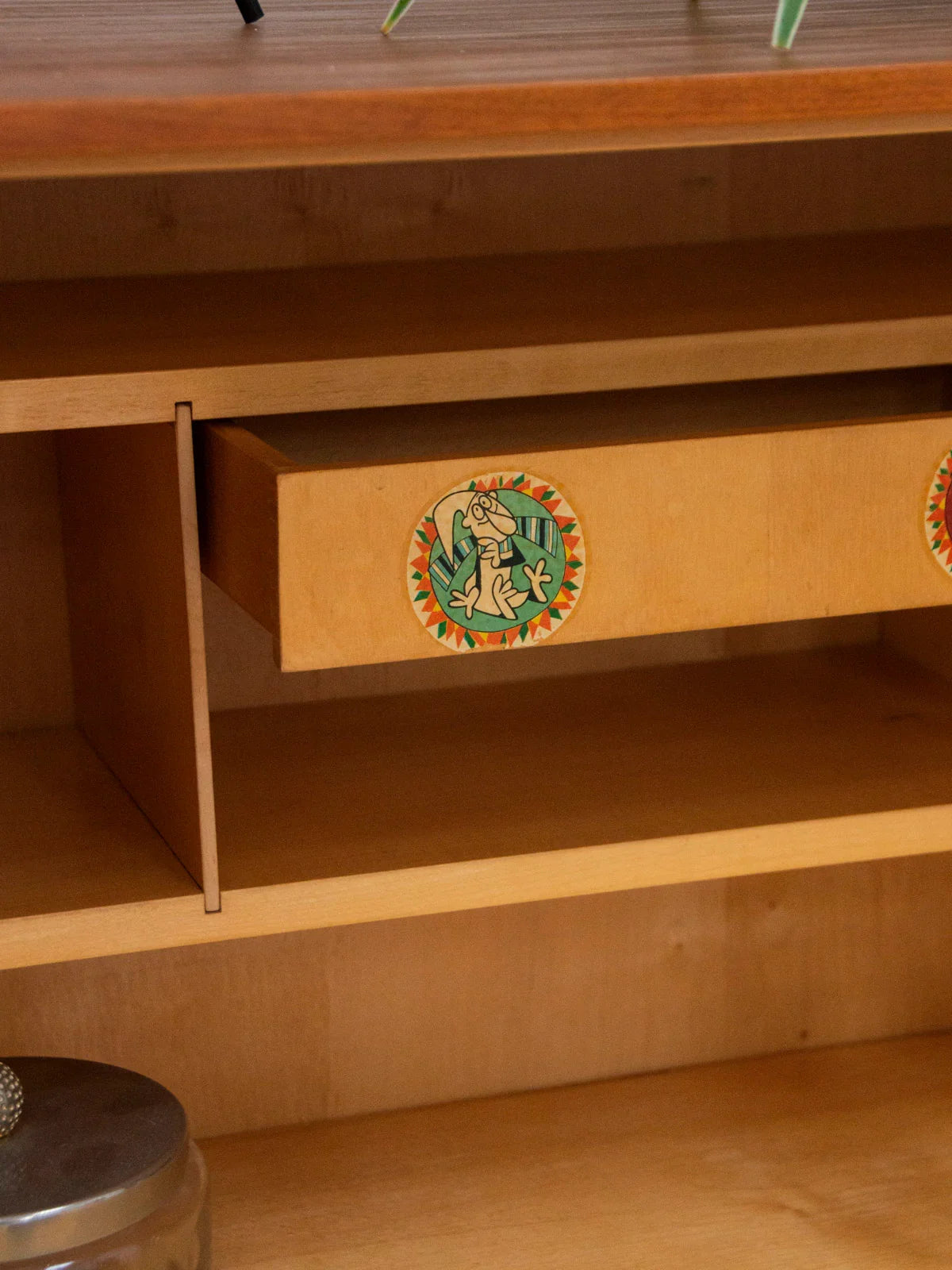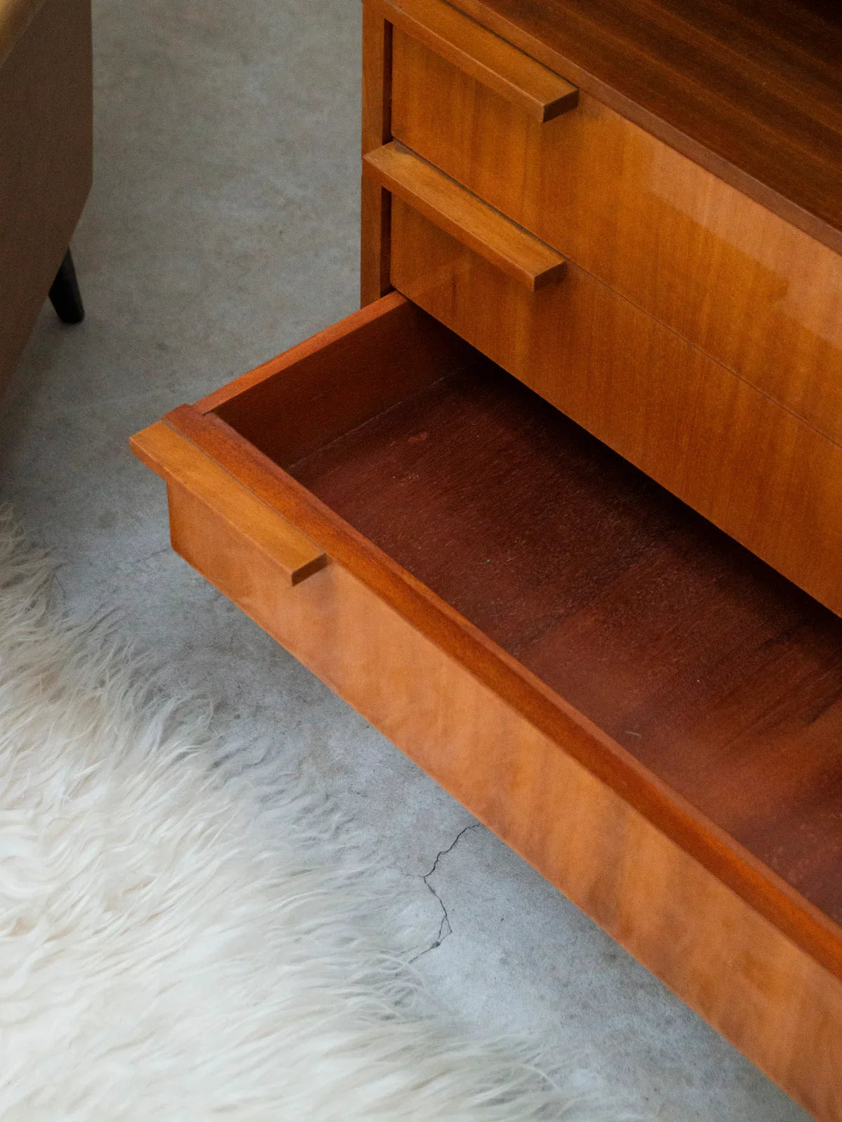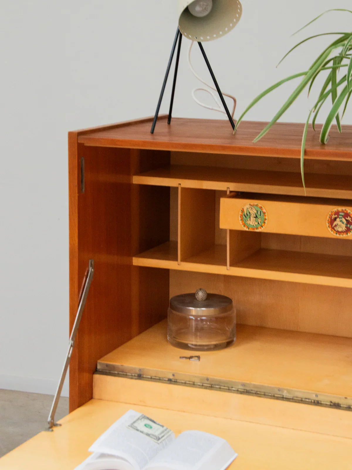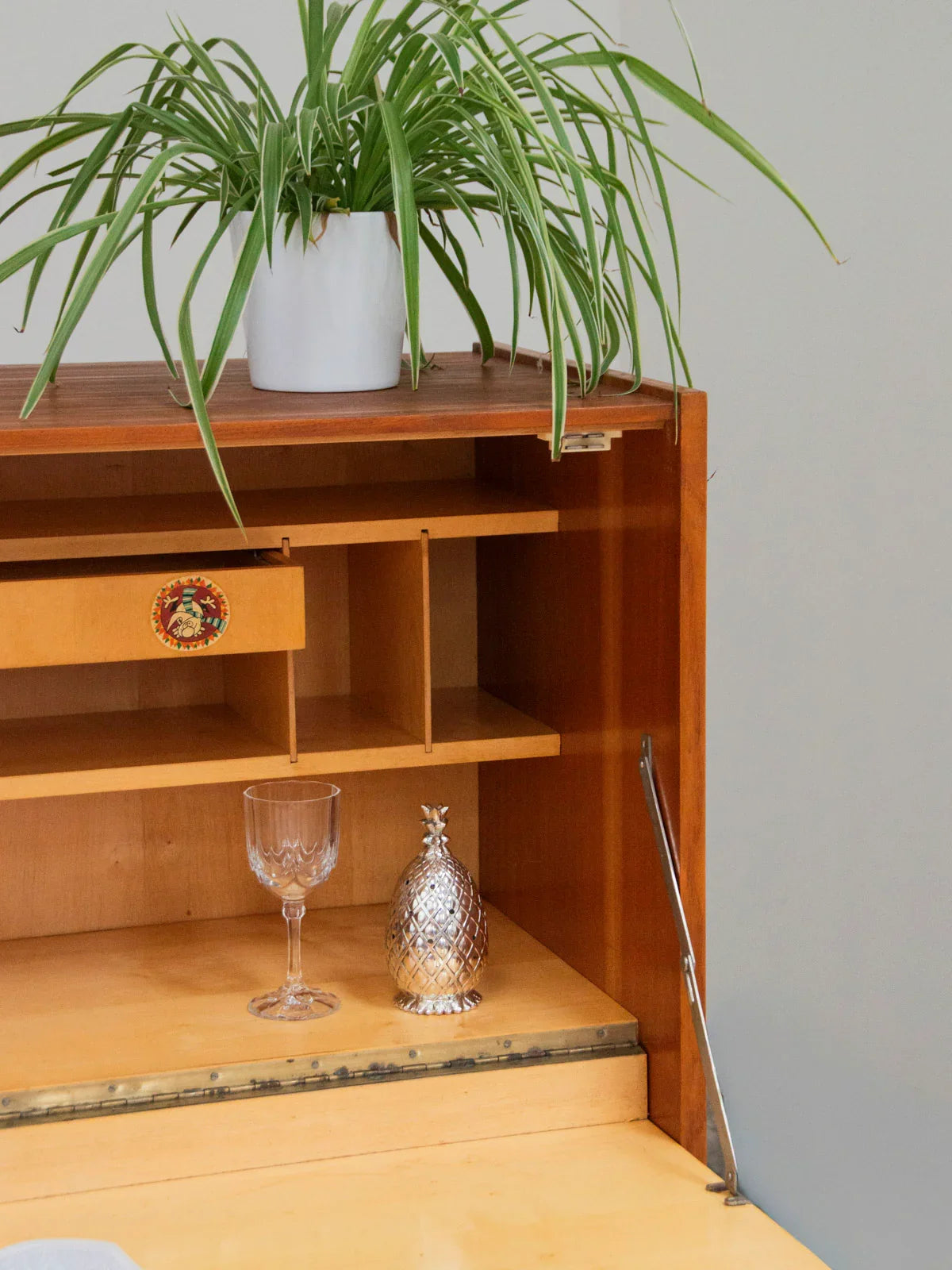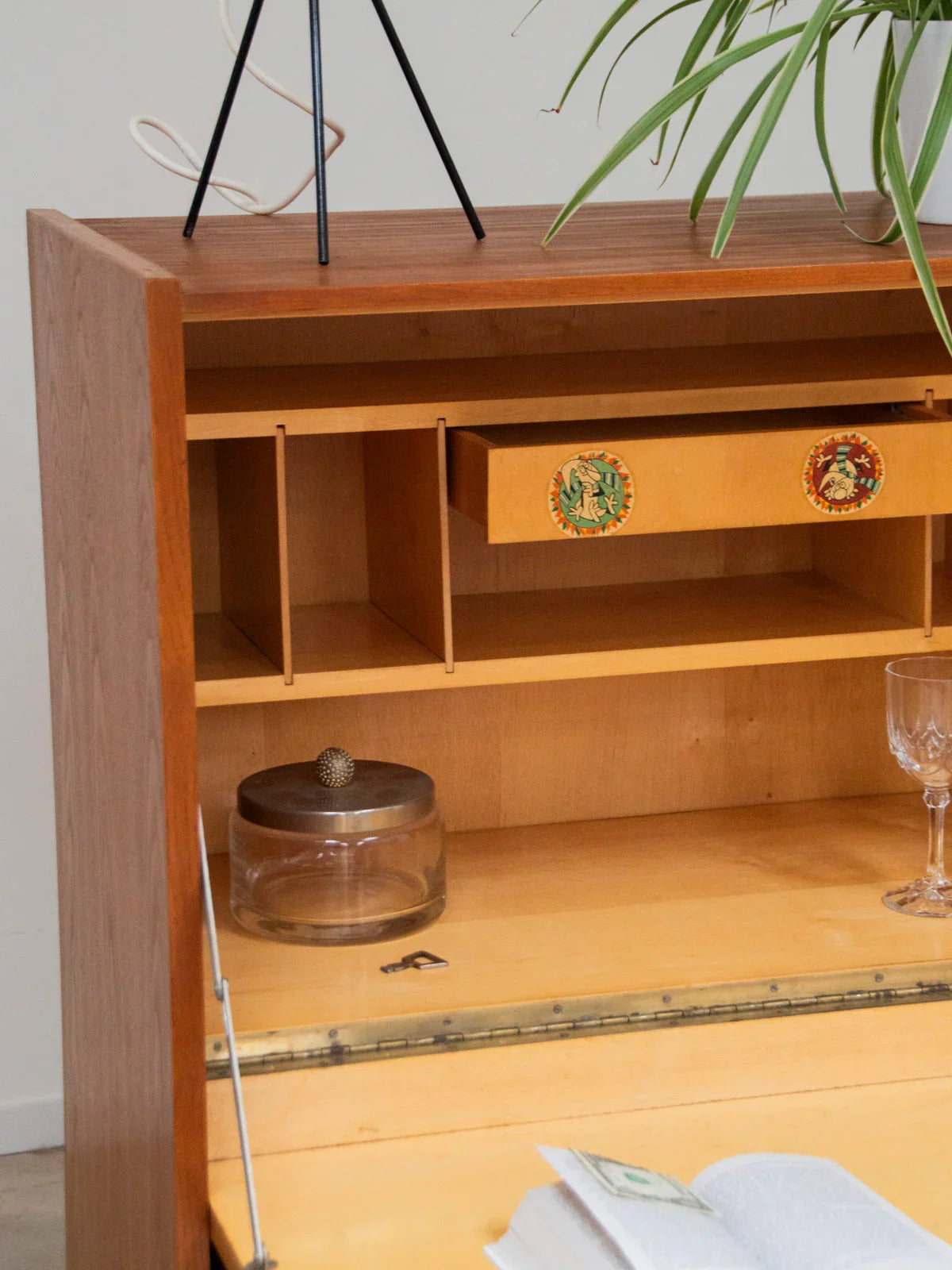 Discover this large Mezulanik secretary desk in light wood, featuring a bright design and generous proportions, ideal for a hallway, office, or bedroom where storage and a discreet work surface are needed. The lighter wood interior creates a beautiful contrast, while three lower drawers and a cubby offer practical organization, and the wooden handles add a warm touch. Its clean lines blend seamlessly into a contemporary and natural setting. Stickers included.