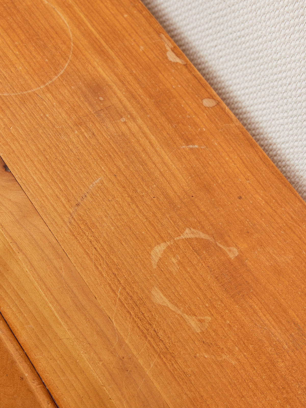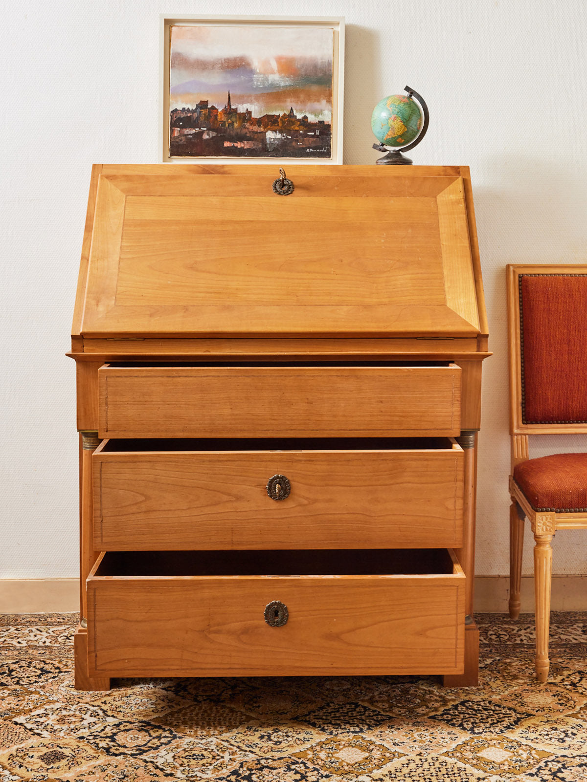 Choose this René Trotel secretary desk in white cherry wood, enhanced with brass handles and complete with its original key. Its balanced design and two large drawers offer ample storage and a discreet surface for writing or organizing your papers. The combination of light wood and metal brings warmth and understated elegance to an entryway or home office, creating a stylish and inspiring atmosphere, perfect for both work and quiet contemplation.