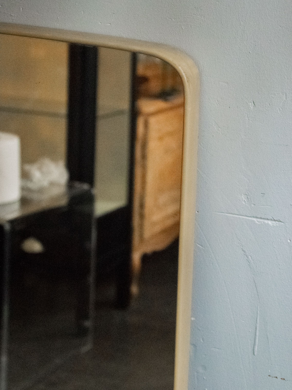 Discover this generously sized, beveled mirror, framed in beige wood with thin edges, which adds a delicate silhouette to the wall. Its finely beveled glass captures the light and elegantly highlights reflections, bringing depth and character to an entryway, bedroom, or living room. Its generous proportions make it a statement piece without overwhelming the space, ideal for visually enlarging a room and creating a soft, refined ambiance.