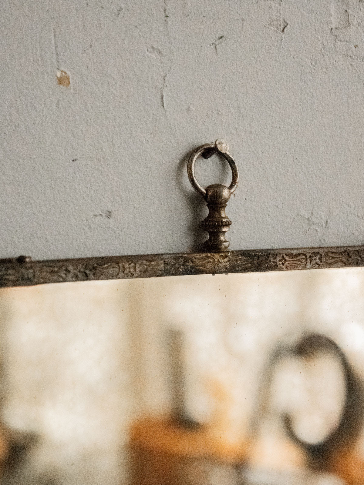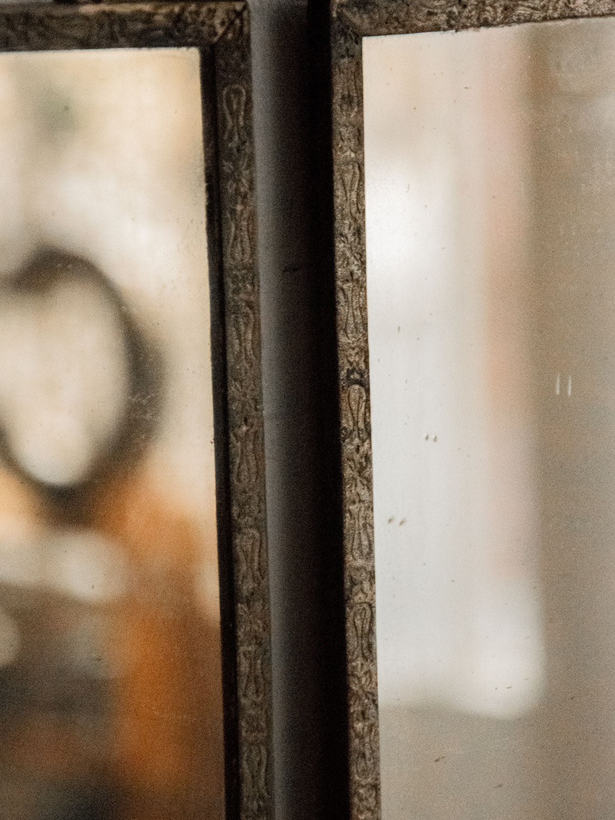 Discover this triptych mirror in metal and glass that folds completely flat for compact storage, ideal for small spaces or discreet dressing tables. Its three panels offer adjustable viewing angles for makeup and beauty routines, while the fabric with a small floral pattern adds a delicate, slightly retro touch. The contrast between the understated metal and the luminous glass creates a refined and inviting atmosphere, perfect for a bedroom or boudoir.