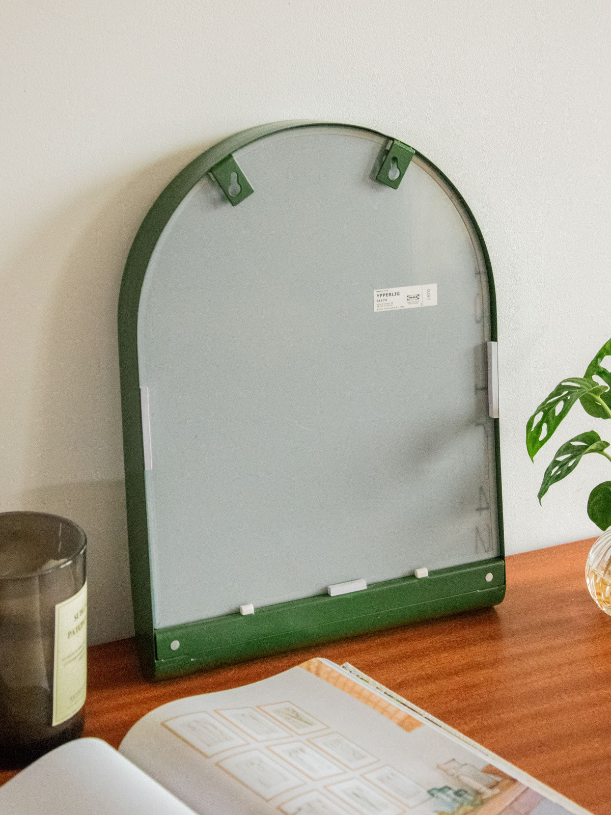 Enhance your interior with this vintage-style metallic green wall mirror from Ikea. Its deep-toned surface and metal frame create a refined, graphic aesthetic, ideal for an entryway, bathroom, or as a complement to a compact vanity. Its vertical, space-saving design plays with proportions to bring light and personality without overwhelming the space. Back mounting hardware is included for easy installation.