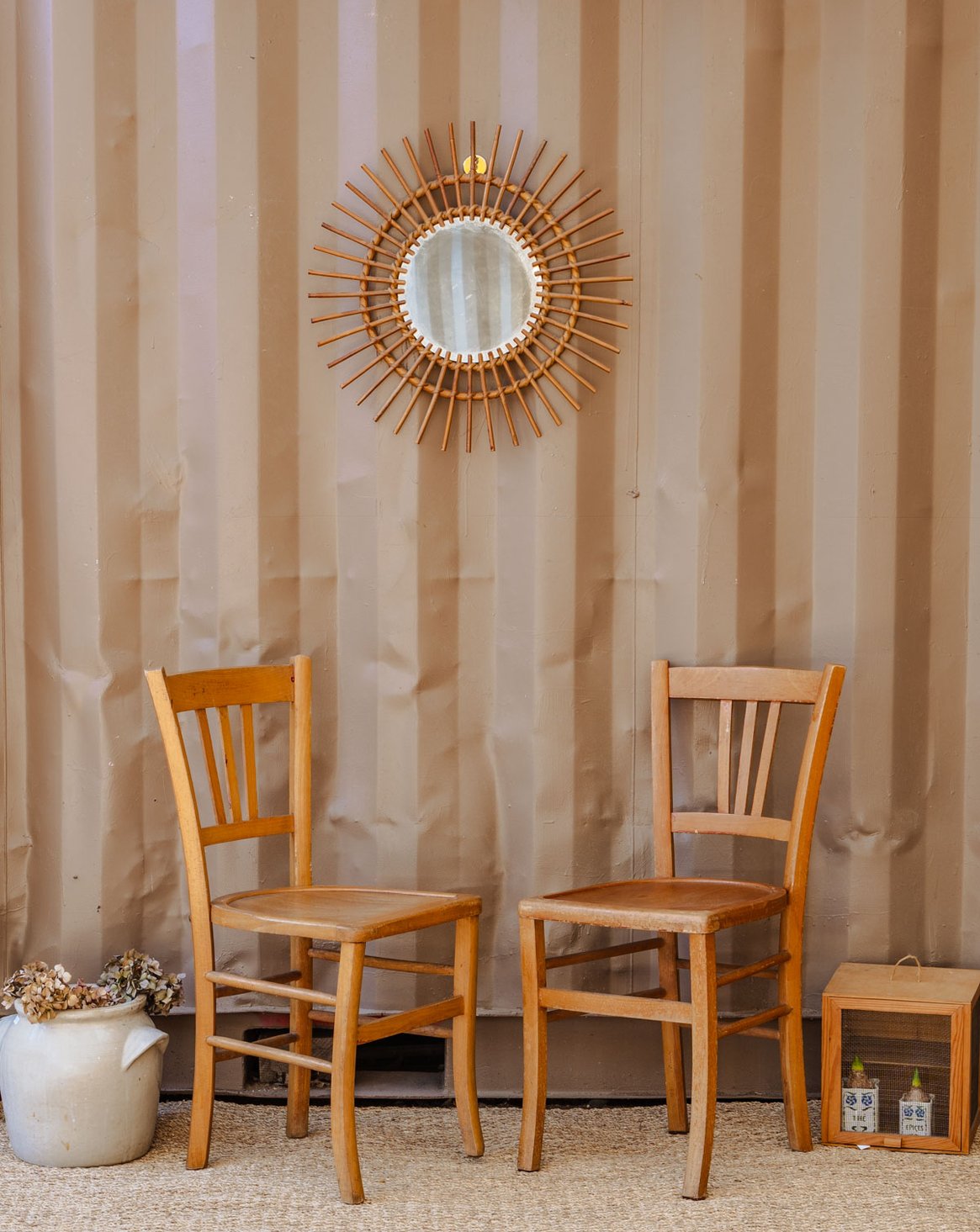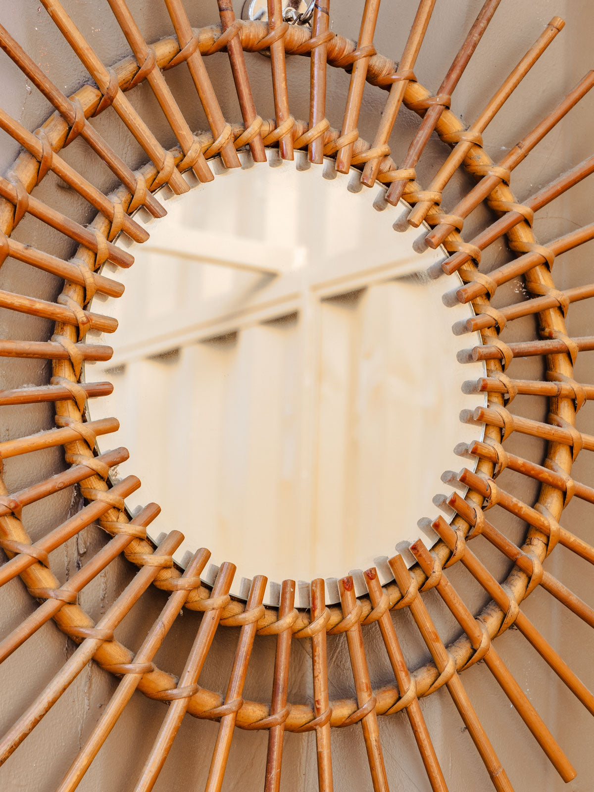 Enhance your interior with this rattan sunburst mirror, featuring a bohemian-chic, handcrafted design. Its radiating points frame a central round mirror, creating a striking wall presence that captures light and visually expands the space. Ideal above a console table, in an entryway, or a bedroom, it adds a natural and warm touch while remaining elegant and airy.