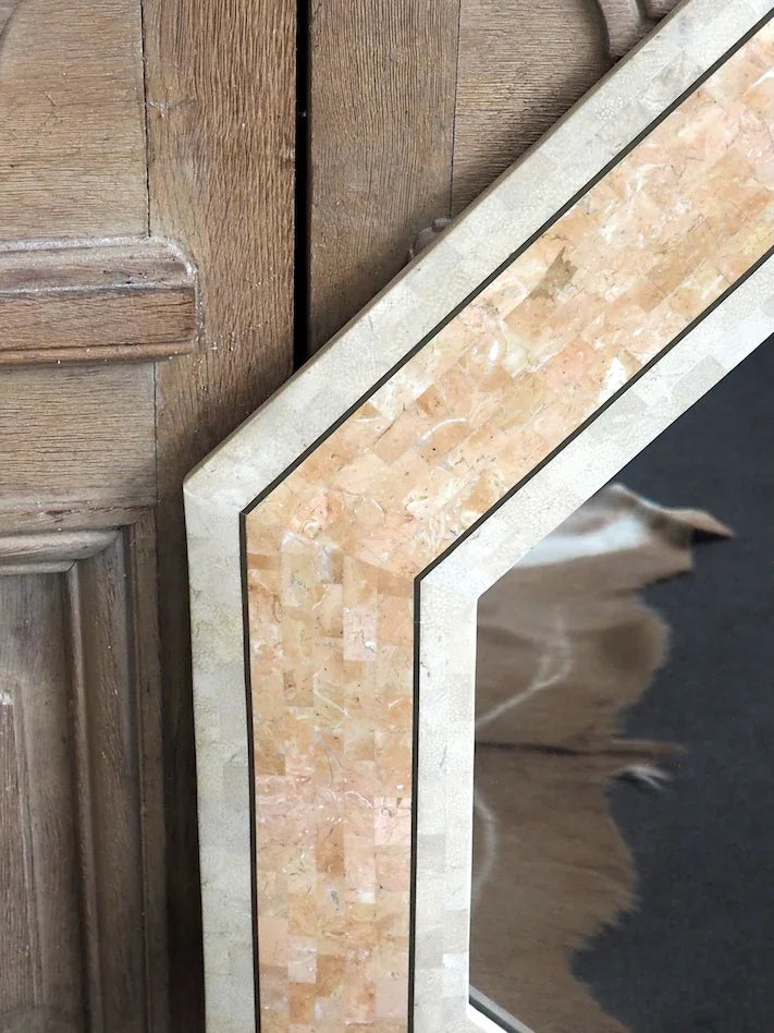 Elevate your interior with this vintage octagonal mirror from the 1970s-1980s by Maitland Smith, which brings a refined and characterful presence. The pink marble frame offers a soft, mineral feel, while a delicate brass trim elegantly highlights the interplay of light. Travertine panels add texture to the composition, creating a tactile and warm effect, ideal above a console table or in an entryway. Its proportions make it a striking and luminous accent piece.