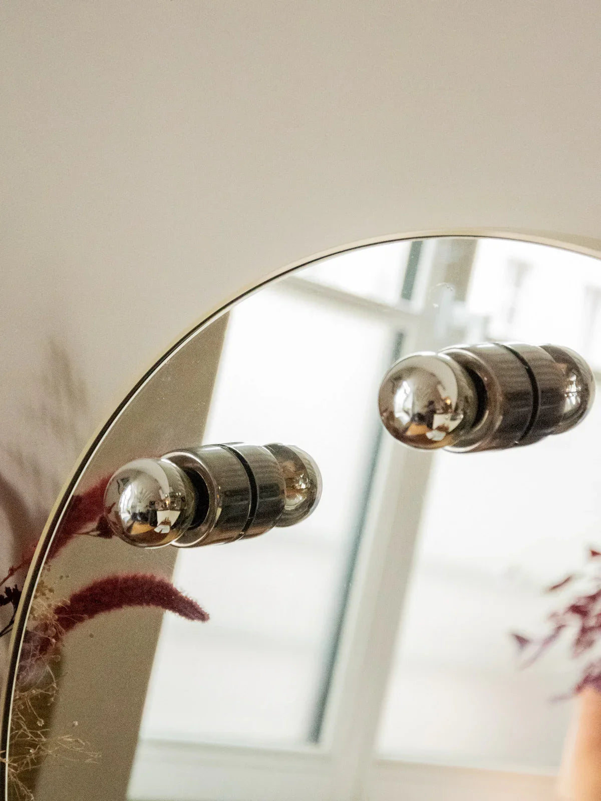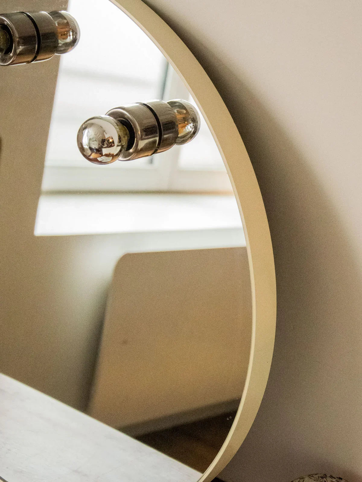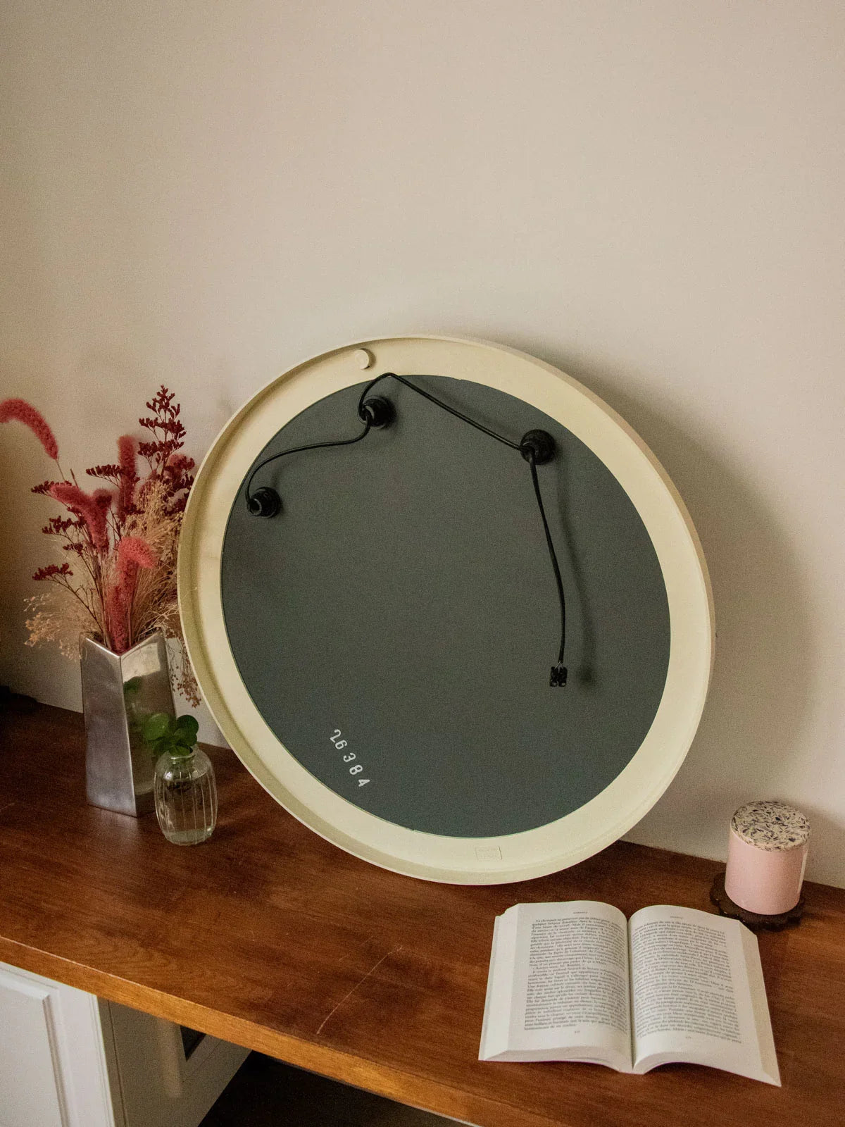 Discover this circular mirror from the 1970s, attributed to Makio Hasuike for Gedy. Its mercury glass and ivory polypropylene frame create a unique space-age style. Three integrated bulbs and beige sockets, echoing the frame, provide ideal accent lighting for a bathroom, entryway, or living room seeking a touch of the 1970s with an unconventional flair. Labeled and stamped on the back, its compact size also makes it suitable for a bedroom or hallway. In perfect condition.