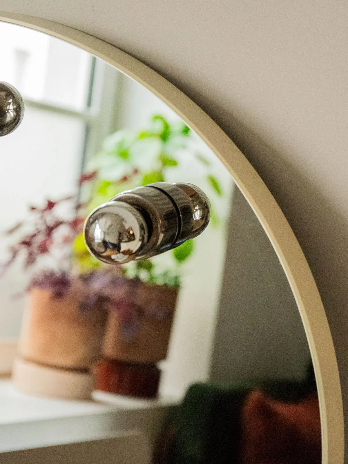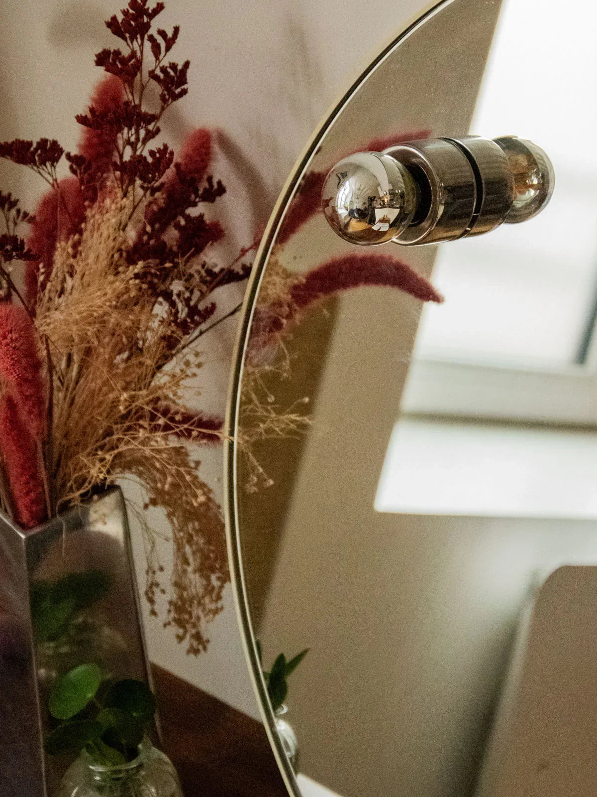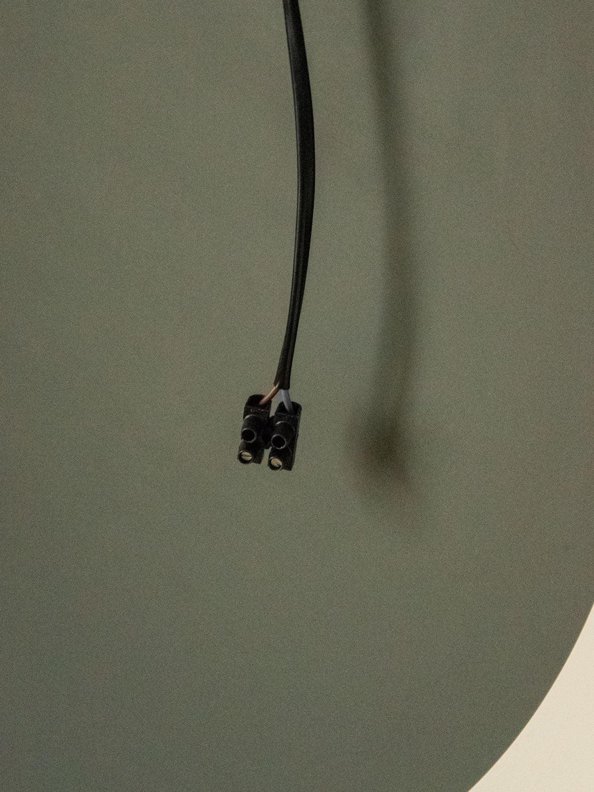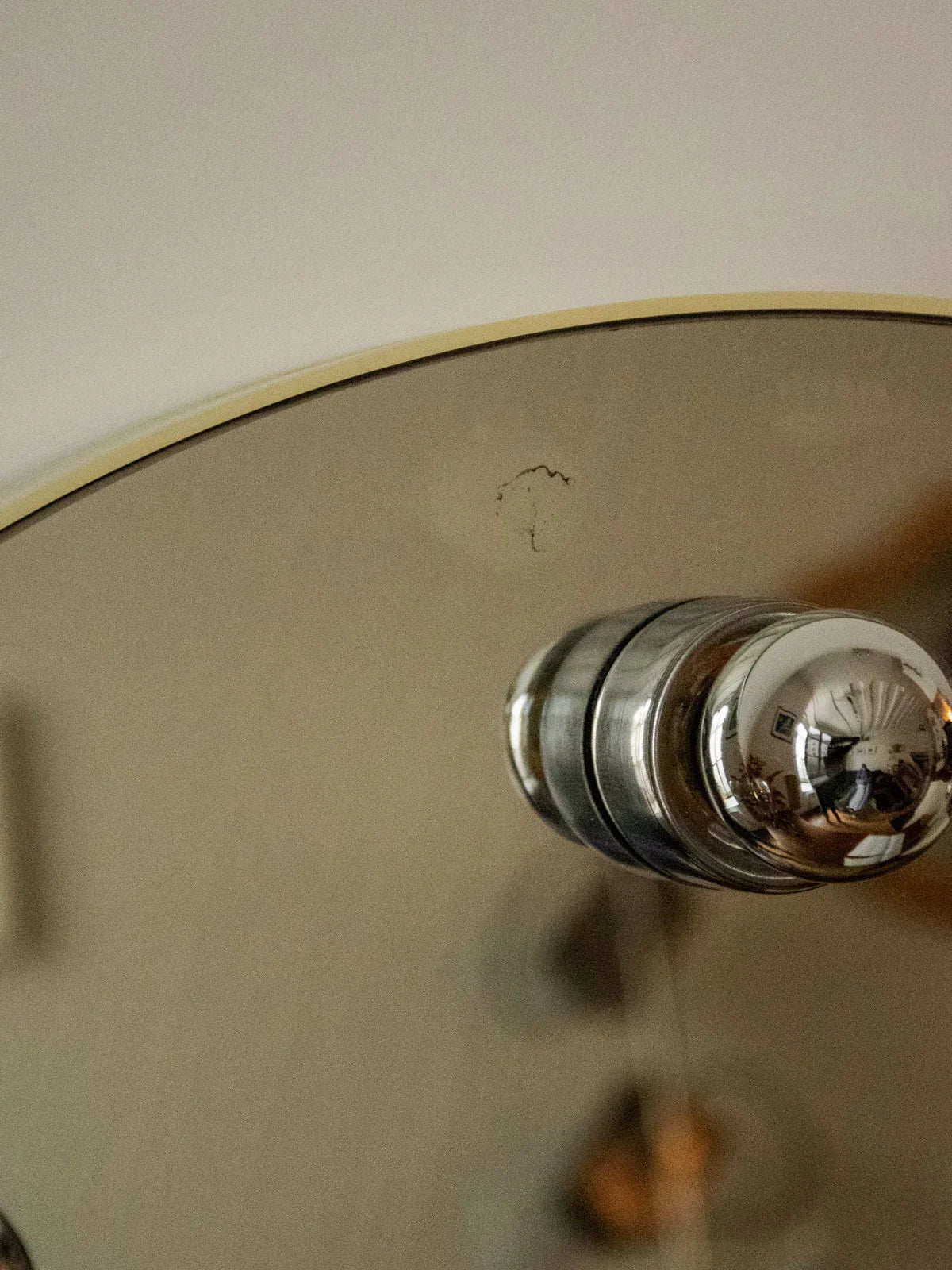 Discover this circular mirror from the 1970s, attributed to Makio Hasuike for Gedy. Its mercury glass and ivory polypropylene frame create a unique space-age style. Three integrated bulbs and beige sockets, echoing the frame, provide ideal accent lighting for a bathroom, entryway, or living room seeking a touch of the 1970s with an unconventional flair. Labeled and stamped on the back, its compact size also makes it suitable for a bedroom or hallway. In perfect condition.