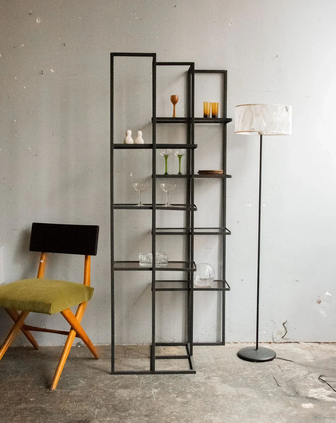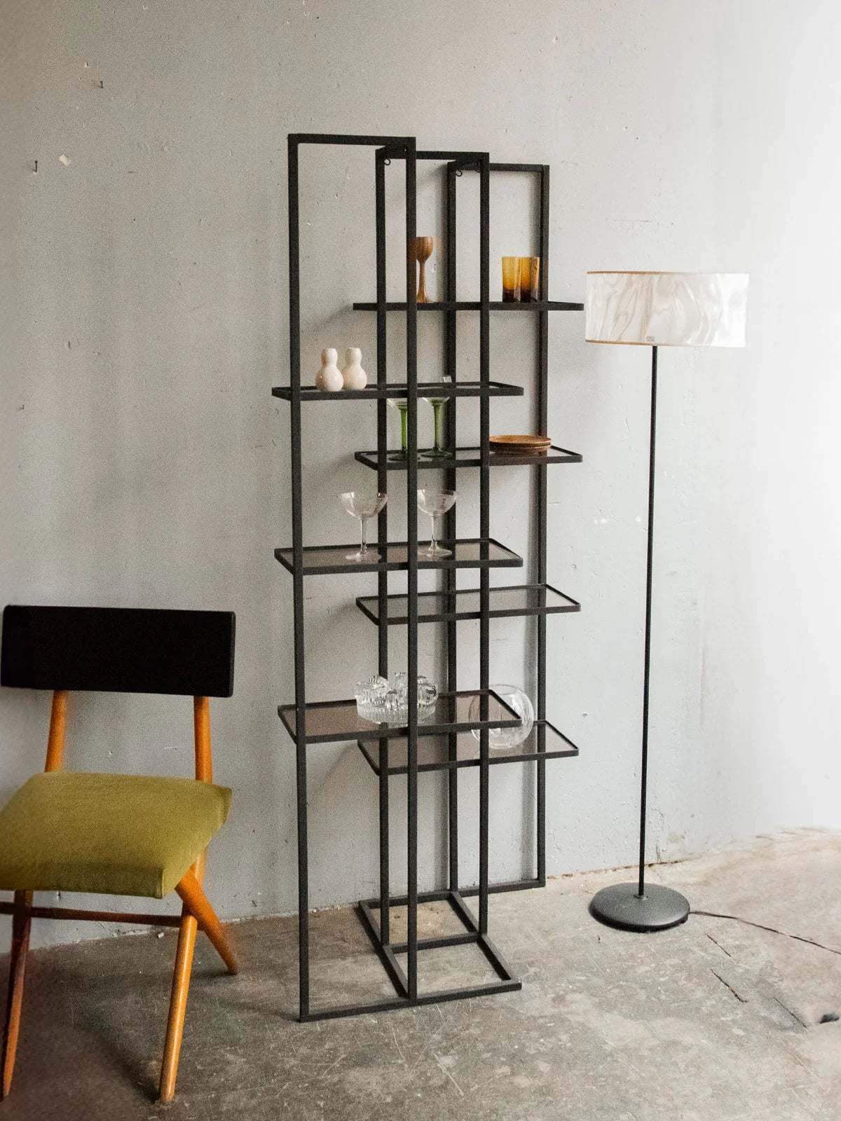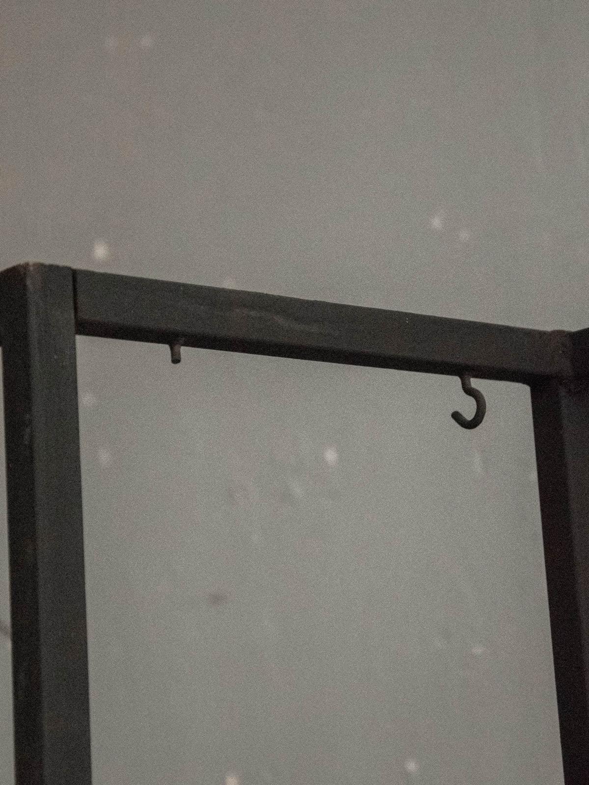 Discover this graphic metal shelf, combining a beautiful, sturdy frame with small, smoked plexiglass shelves that subtly play with the light. Its slender silhouette and compact footprint make it the perfect vertical storage solution for organizing and displaying objects, books, and plants, while three hooks provide space for coats or bags. Its geometric style adds a contemporary and refined touch to an entryway, kitchen, or bathroom, creating a tidy and bright atmosphere. One small hook is missing.