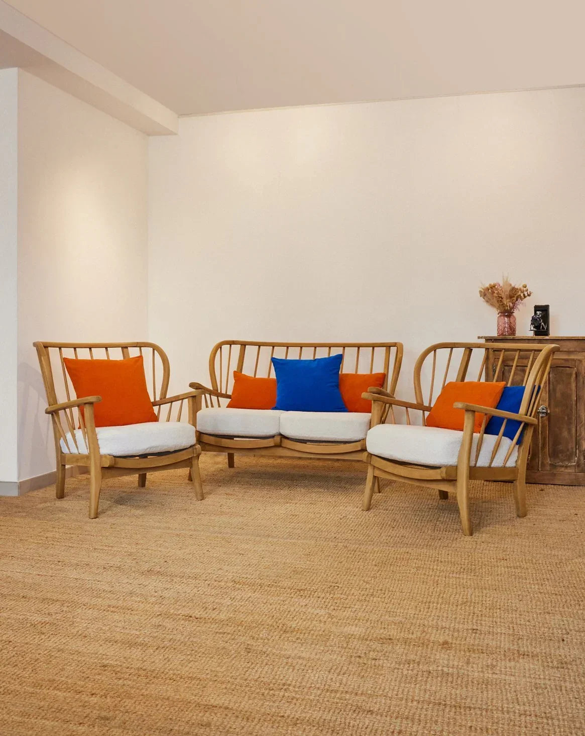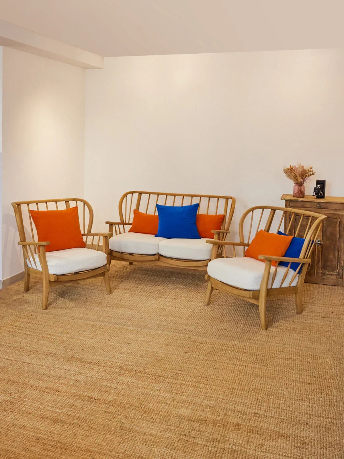 Embrace this refurbished Joynson Holland sofa and armchair set, where a restored wooden frame complements cushions upholstered in fresh new fabric. The generously sized sofa and matching armchairs offer ideal seating comfort for the living room, while the clean lines and woodwork lend a touch of understated elegance. Perfect for creating a warm and inviting atmosphere, this set brings character and conviviality to contemporary interiors.