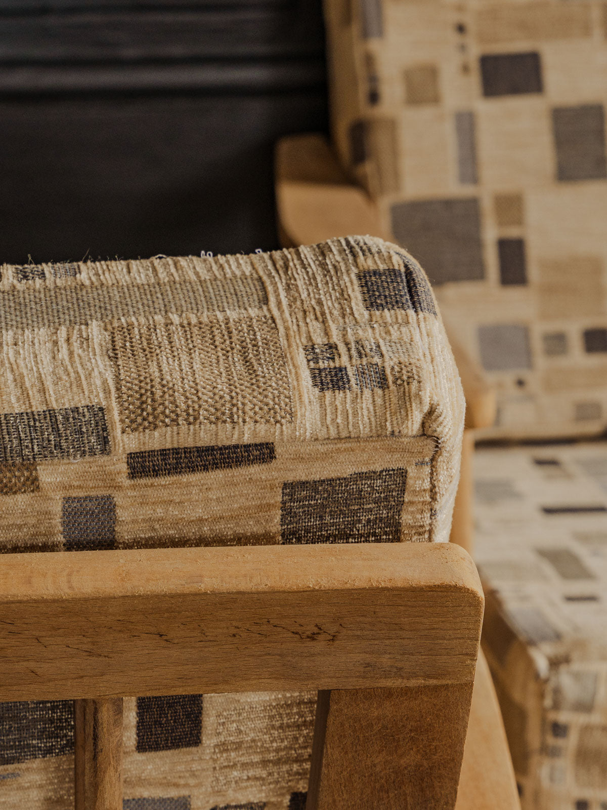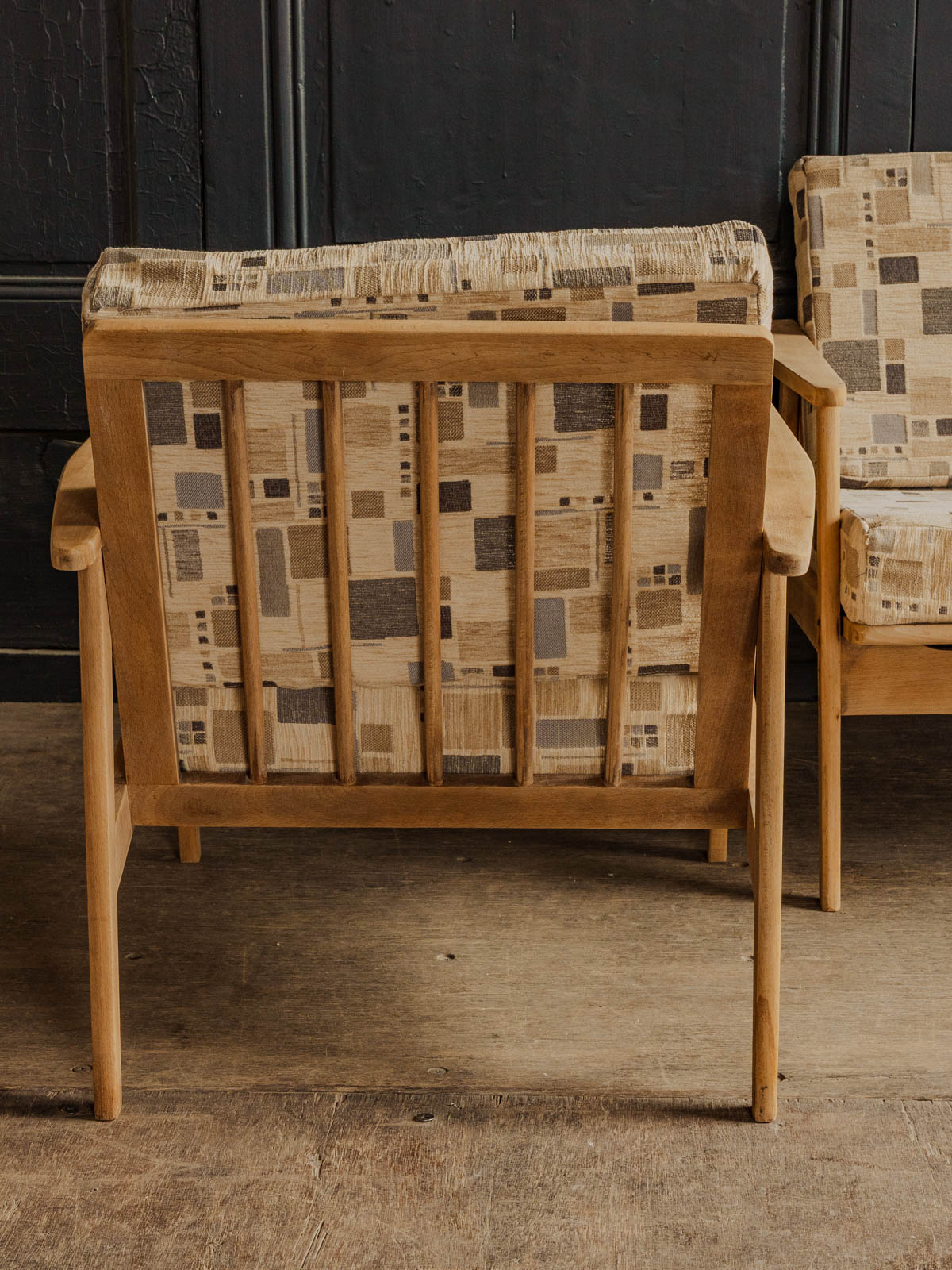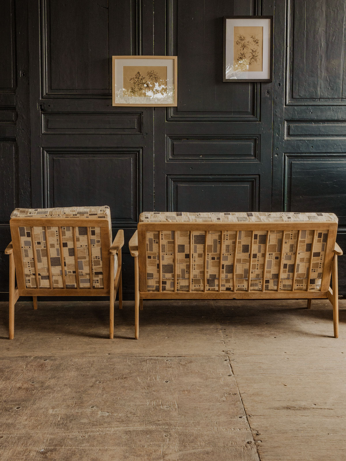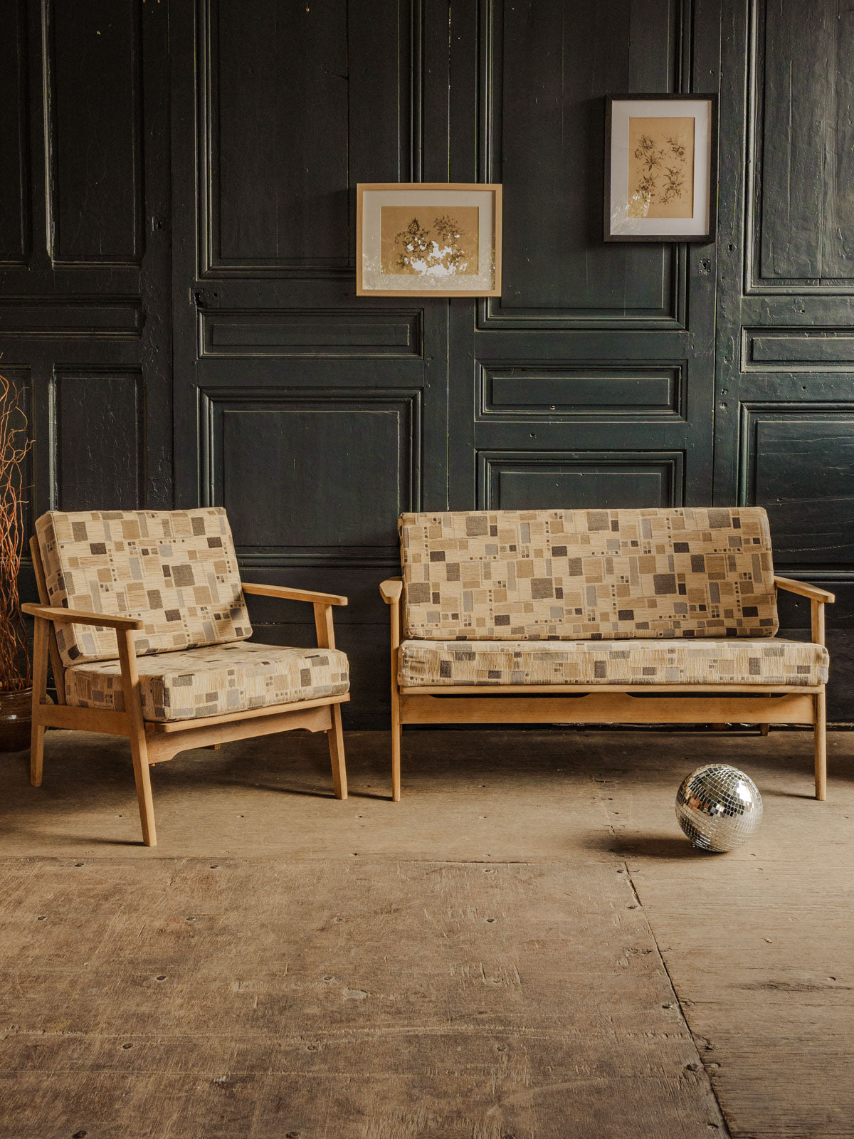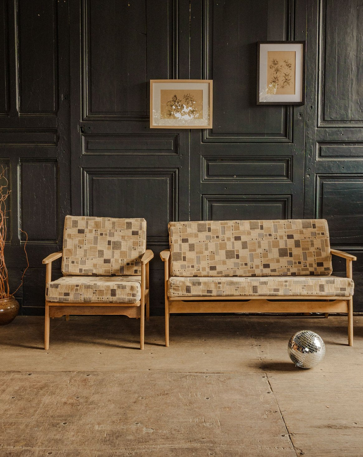 Discover this matching sofa and armchair set from the 1960s, upholstered in a patterned fabric that adds character and softness. The wooden armrests and legs emphasize the retro style while providing structured seating suitable for everyday living spaces. Ideal for a cozy living room or reading nook, this set exudes understated elegance and warmth. Slight signs of wear add to its charm.