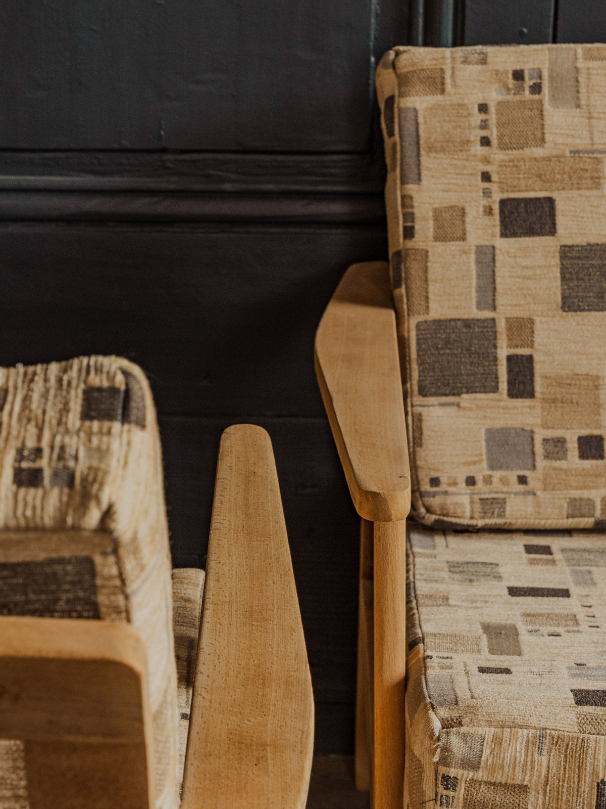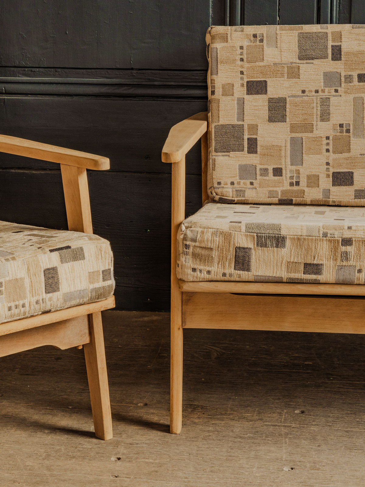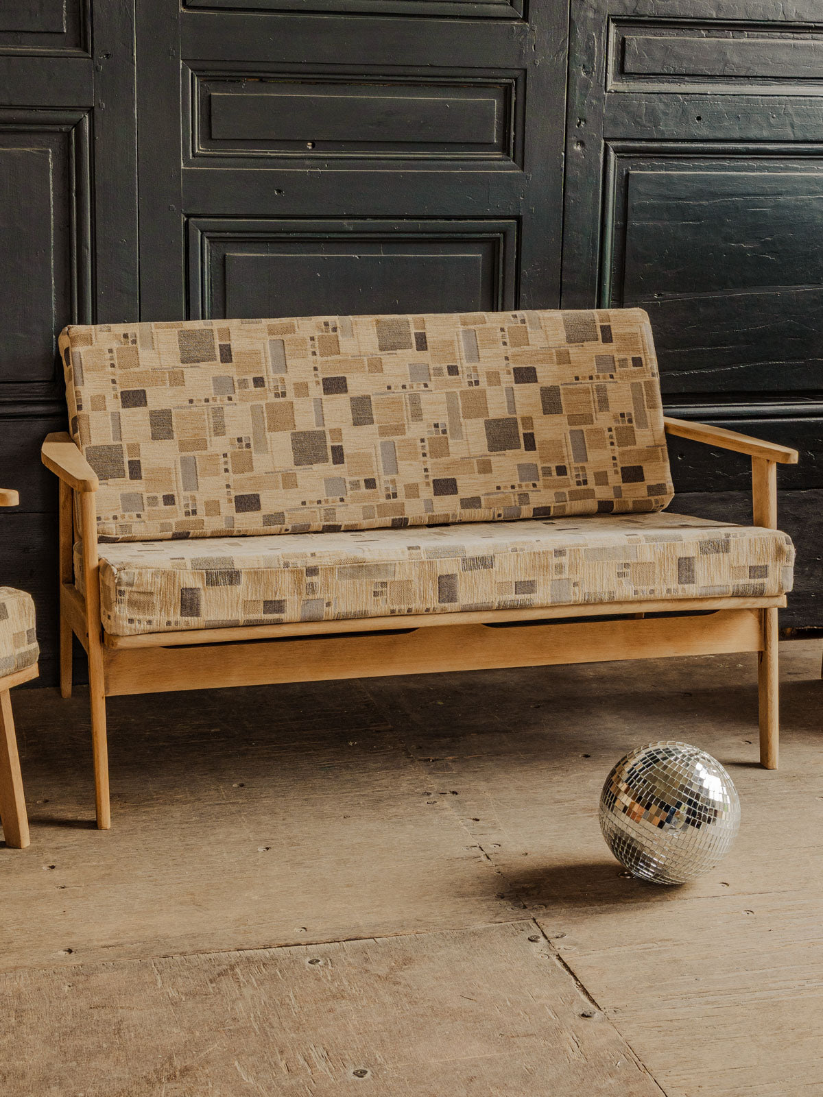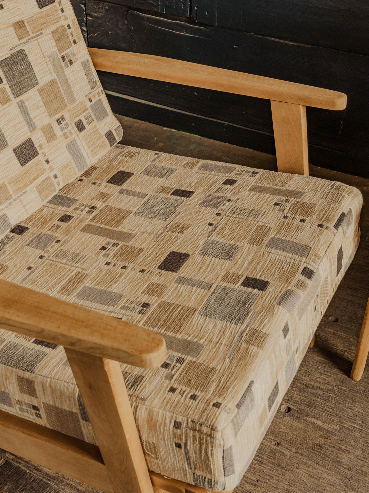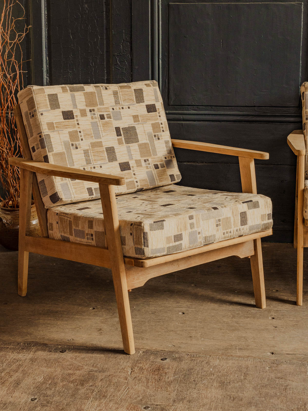 Discover this matching sofa and armchair set from the 1960s, upholstered in a patterned fabric that adds character and softness. The wooden armrests and legs emphasize the retro style while providing structured seating suitable for everyday living spaces. Ideal for a cozy living room or reading nook, this set exudes understated elegance and warmth. Slight signs of wear add to its charm.