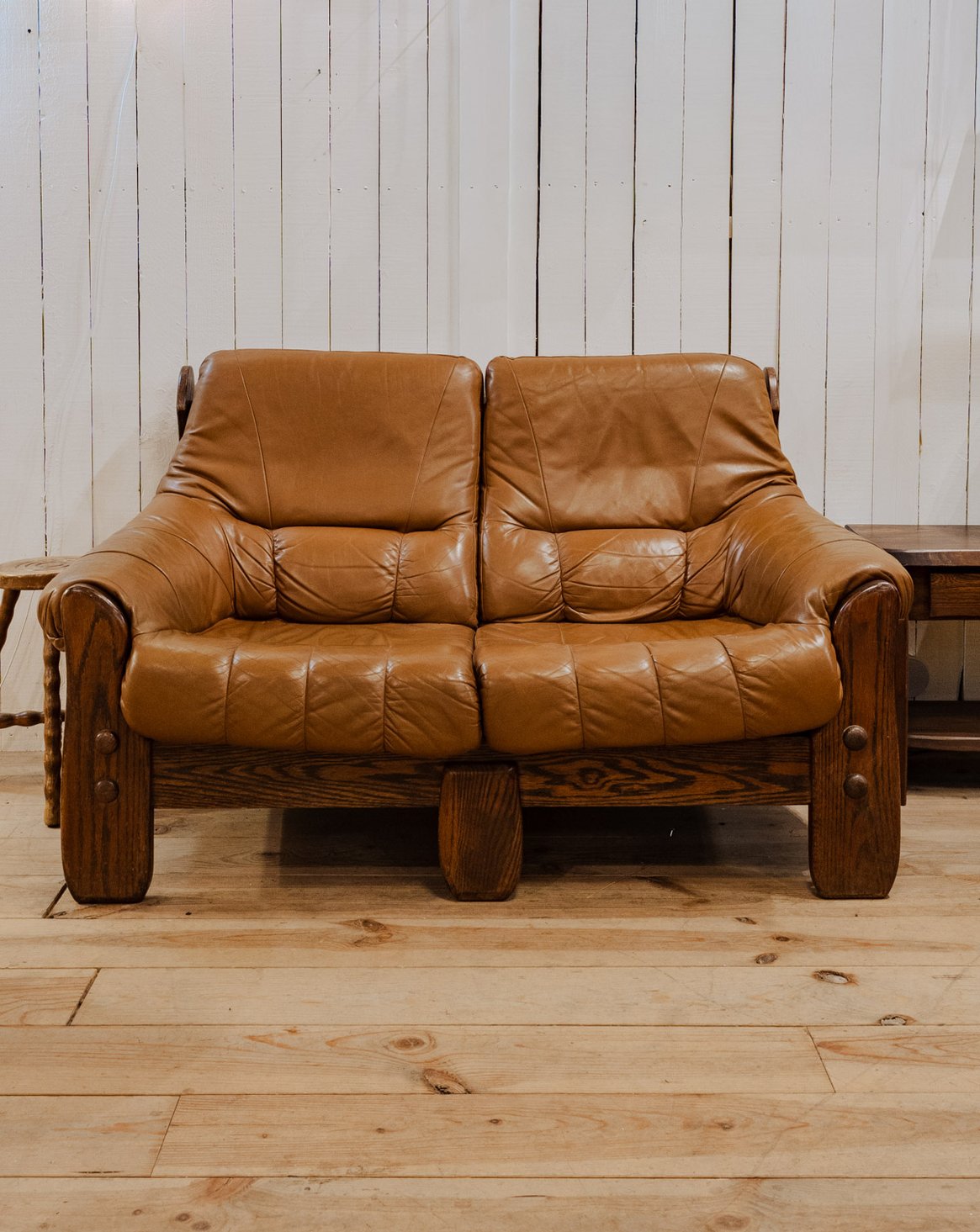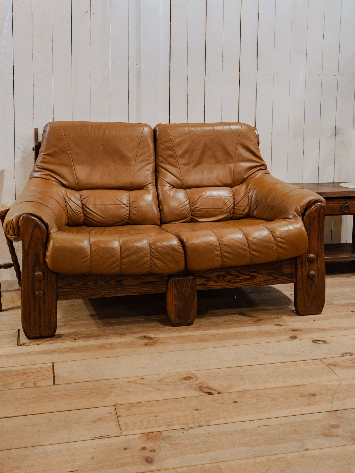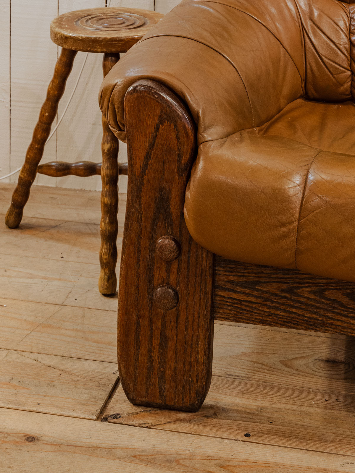 Embrace this Brazilian sofa from the 1970s with its solid wood frame, enhanced by a light brown leather seat that brings warmth and elegance to your living room. Its proportions and leather invite relaxation, offering a comfortable focal point for reading or conversation, while the dark wood accentuates a clean and inspiring silhouette. There are a few signs of wear and a stain on the seat.