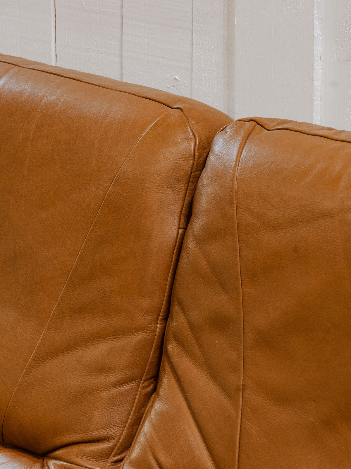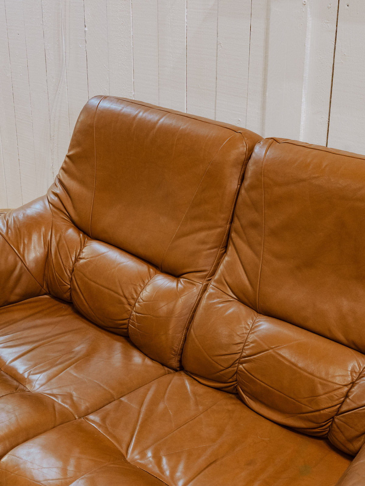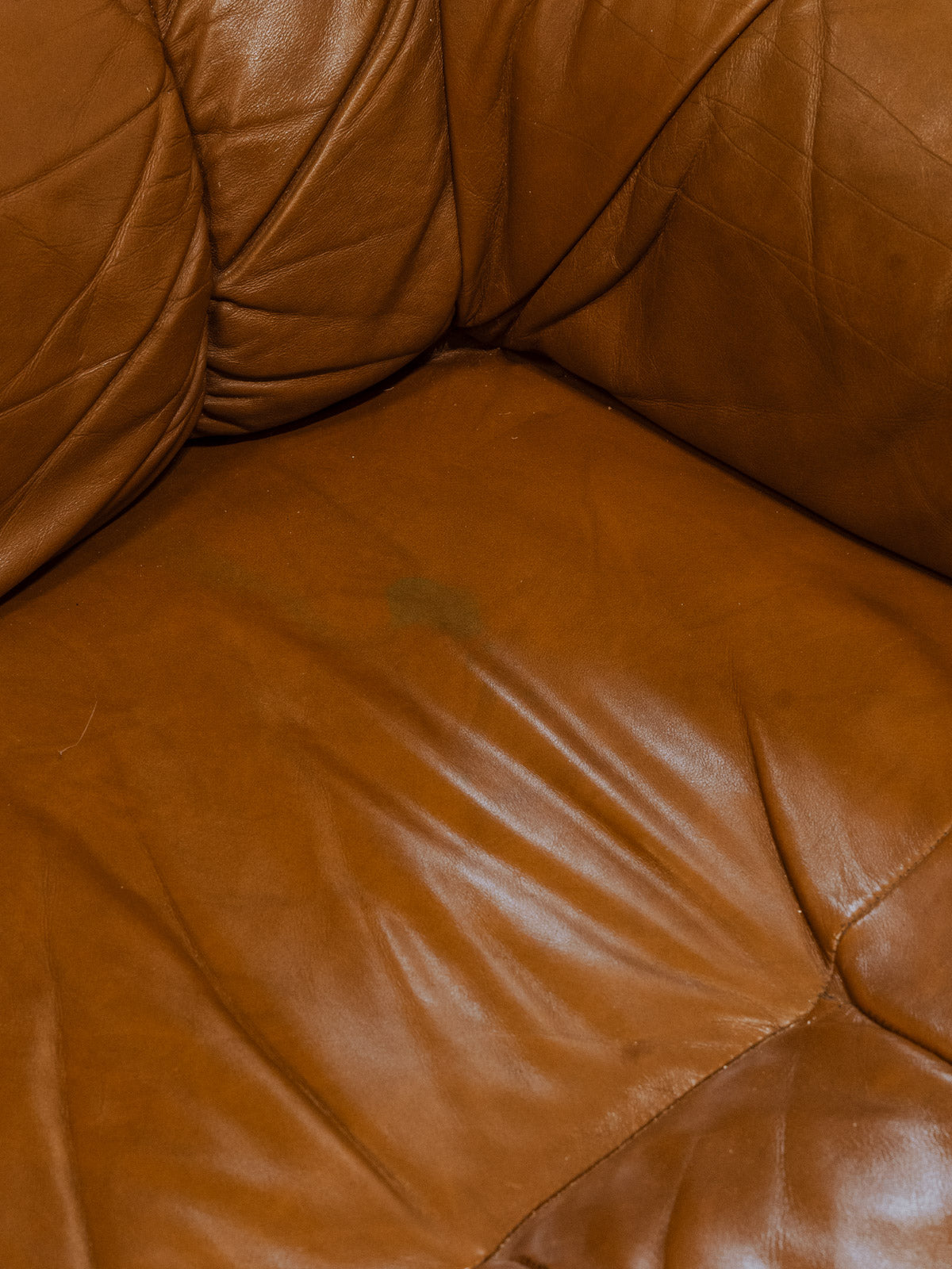 Embrace this Brazilian sofa from the 1970s with its solid wood frame, enhanced by a light brown leather seat that brings warmth and elegance to your living room. Its proportions and leather invite relaxation, offering a comfortable focal point for reading or conversation, while the dark wood accentuates a clean and inspiring silhouette. There are a few signs of wear and a stain on the seat.