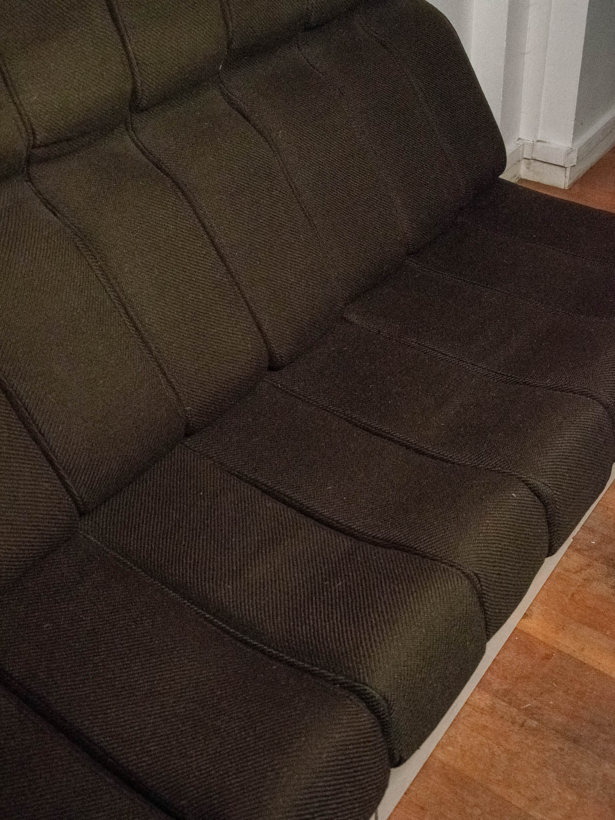 Embrace this 1970s sofa composed of three independent modules, which can be rearranged to suit your living room's proportions and create inviting configurations. Its undulating seat and dark brown wool fabric lend it a warm and inviting look. The movable armrest offers multiple uses, the top serves as a shelf, and the refurbished white melamine cabinets provide a contemporary and structured contrast. There is a small tear in the fabric of one module and minor wear visible in the photos.