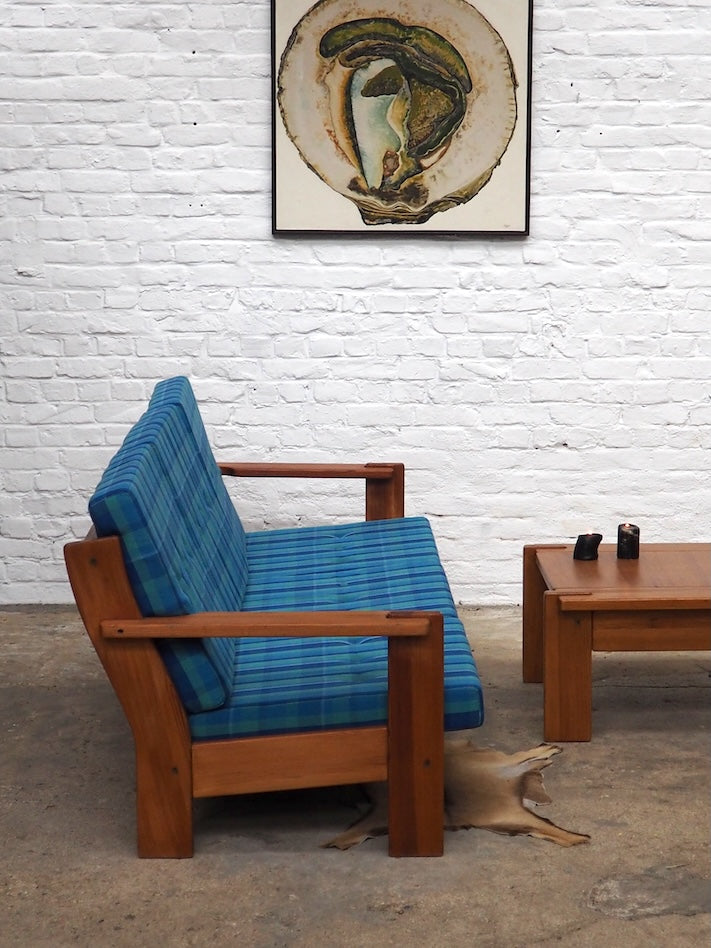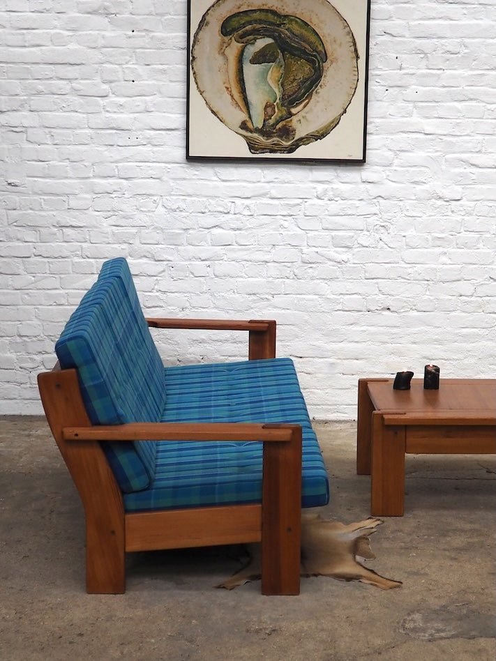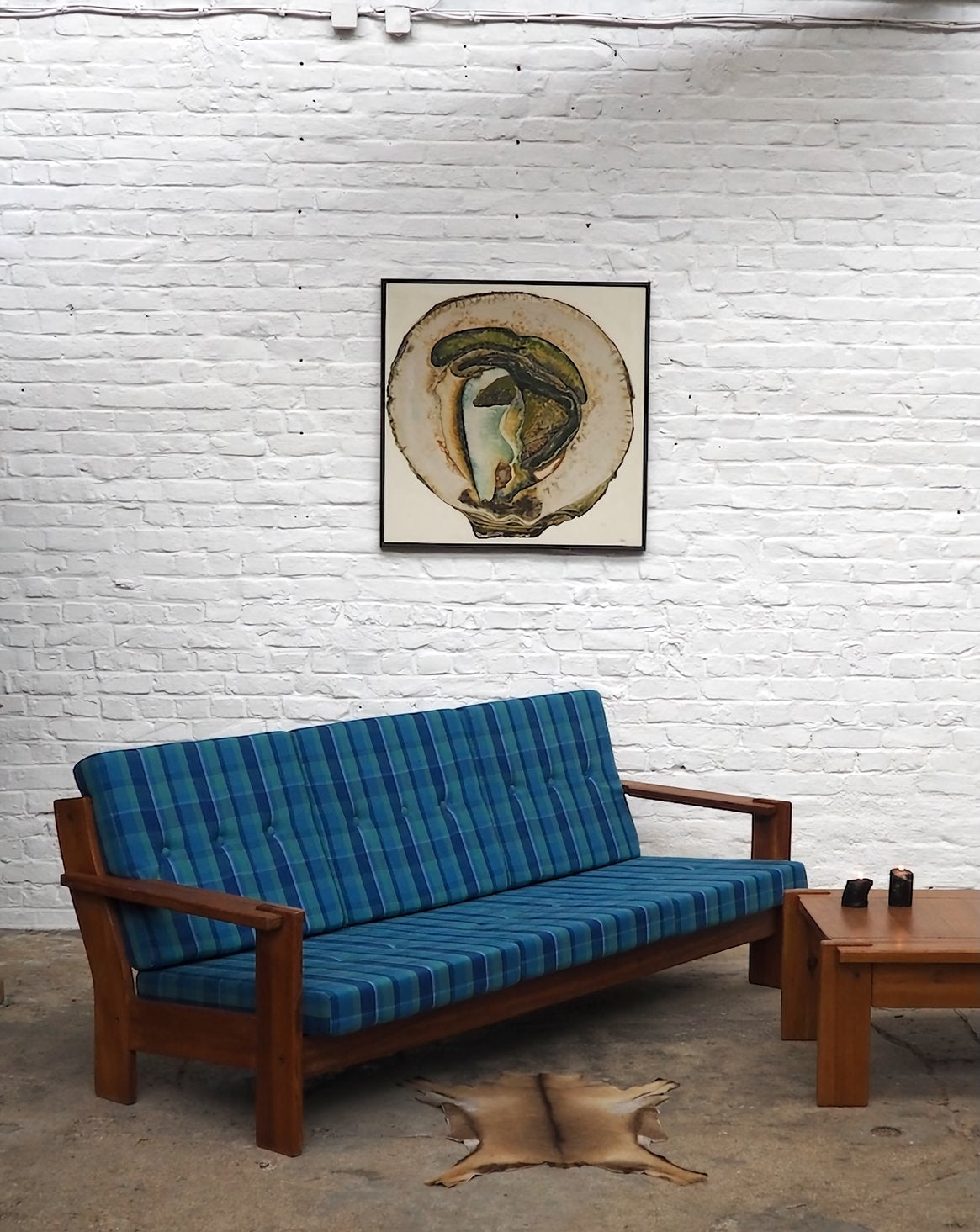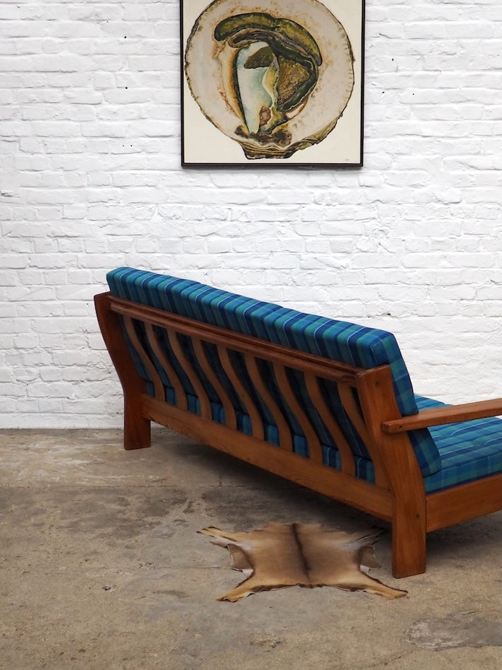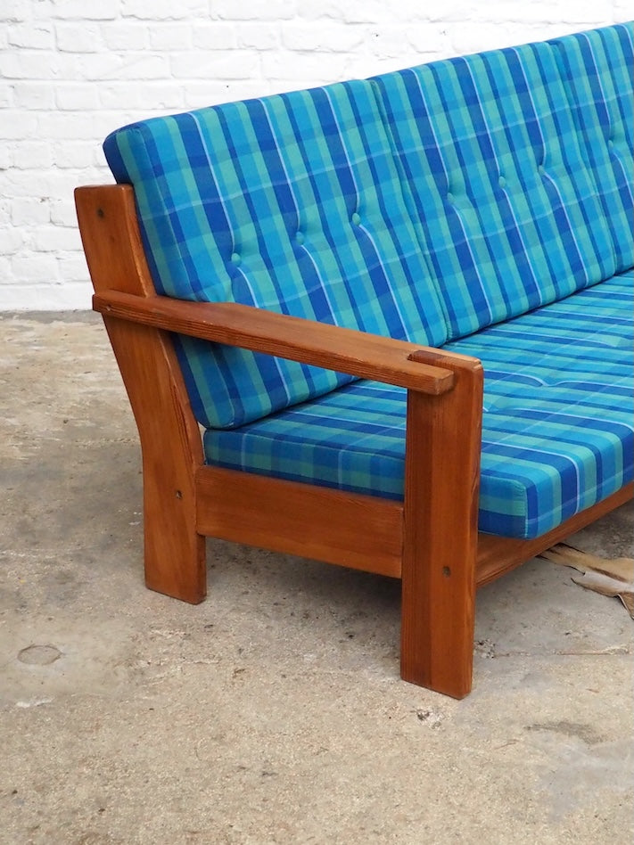 Embrace this 1970s sofa in pine and blue checkered fabric, exuding undeniable retro charm. Its generous size offers a deep and comfortable seat, ideal for entertaining or curling up on long evenings. The exposed pine wood creates a warm and natural style, while the original fabric adds an authentic and graphic touch. Perfect for a cozy living room or a bright conservatory, it creates a soft and inviting atmosphere.
