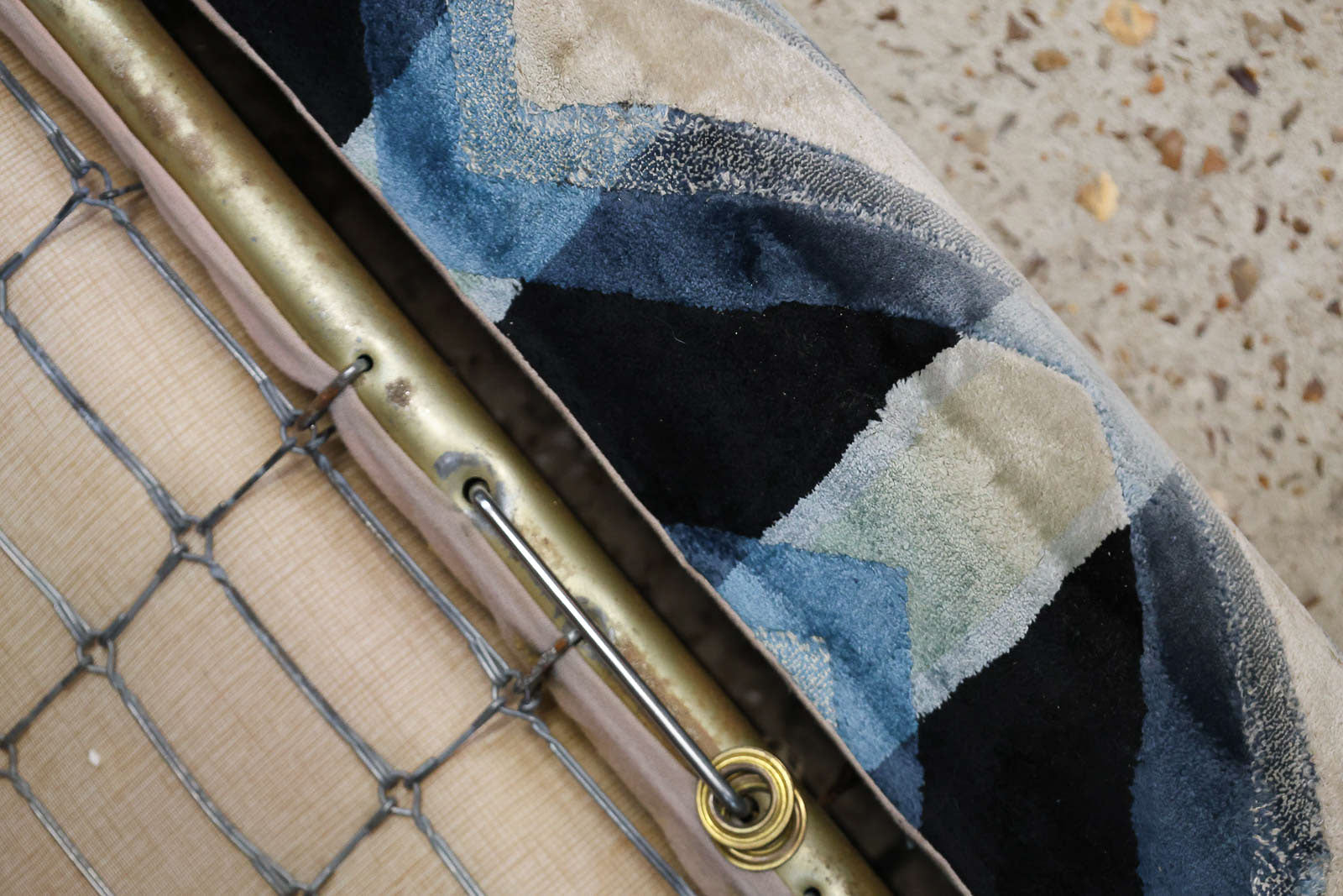 Embrace this 1970s velvet sofa by Gerard Guermonprez, with its black, blue, cream, and green hues that lend it a refined yet inviting look. Its metal frame mechanism unfolds to create a 120cm bed, ideal for accommodating occasional guests. With its generous seat and low back, it fits perfectly in a contemporary living room or a guest bedroom, creating a retro and elegant atmosphere.