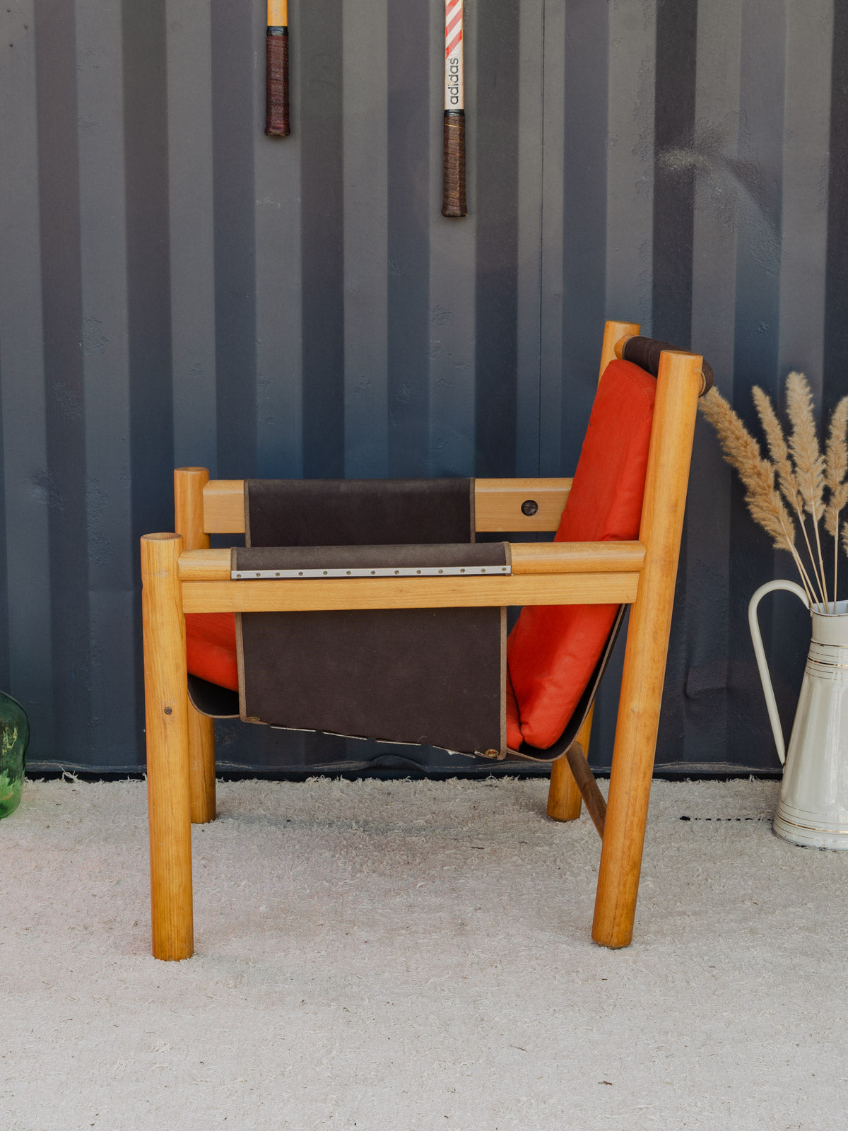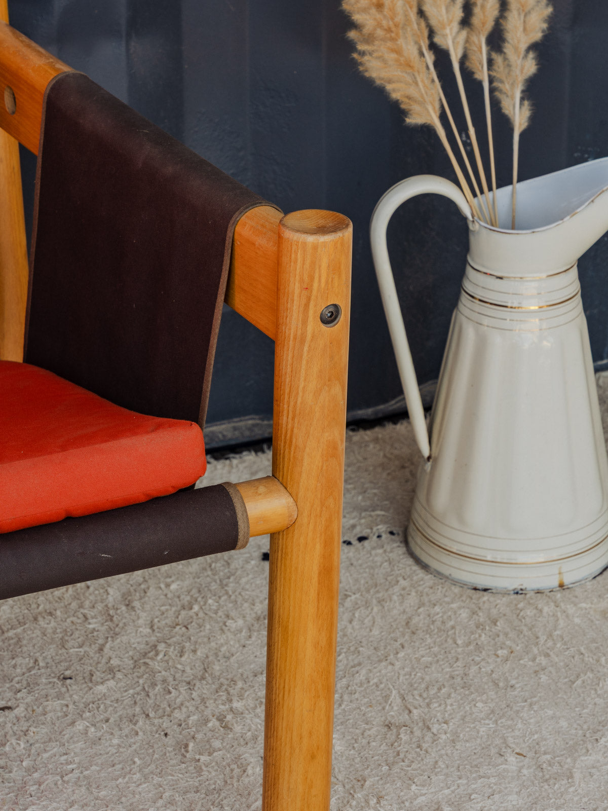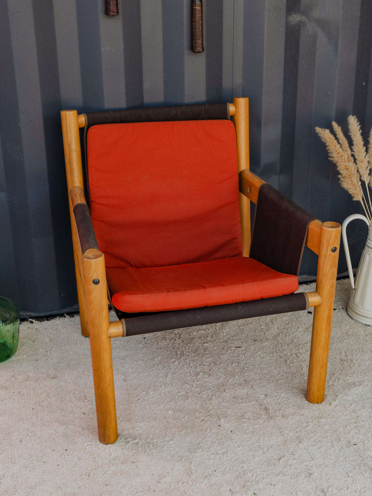 Adopt this vintage Italian armchair by IBISCO with a warm and structured silhouette, where a wooden frame converses with a brown fabric seat and back for an elegant yet comfortable look. Its extra orange cushion adds a touch of color and enlivens a reading nook or a neutral-toned living room, while its proportions offer a generous and balanced seating experience. Some signs of age are present.