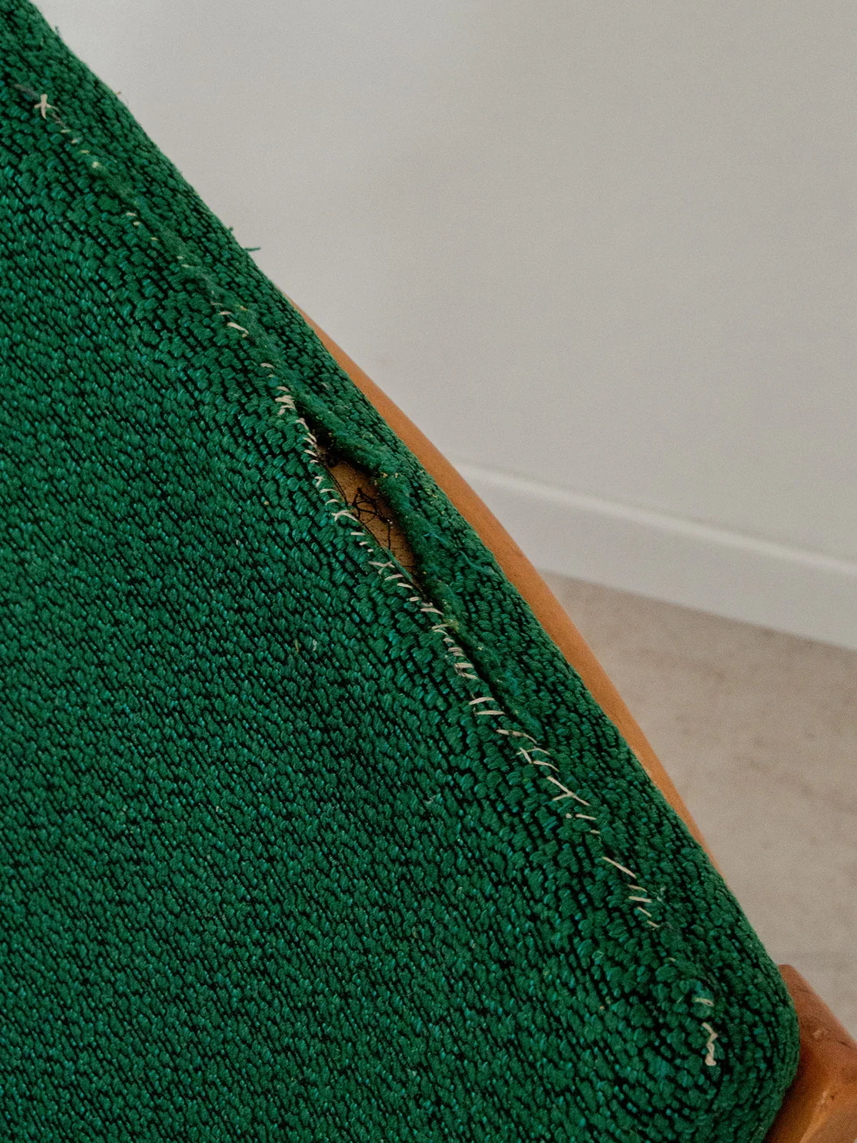 Add a touch of elegance and comfort to your home with this light wood armchair. Its curved back and dark green fabric seat offer a perfect balance between style and comfort, while its splayed legs add a refined retro touch. An ideal piece for creating a warm and inviting atmosphere. Fabric stitching on the cushions. Some signs of wear are visible.