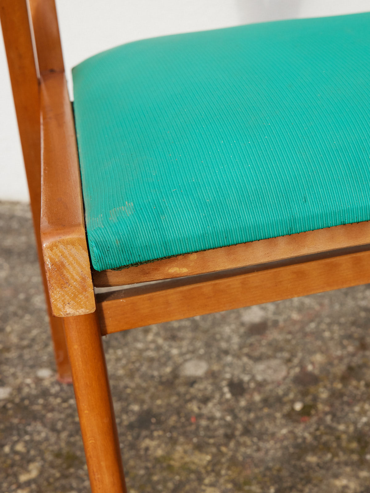 Adopt this 1950s armchair in wood and green faux leather, with its retro profile and welcoming presence. Sold as is, it offers an inviting seat and comfortable height, perfect for a reading nook, living room, or office with a vintage and elegant feel. The studded details on the back and the wooden frame highlight its authenticity and add a touch of character. Minor signs of age are present.