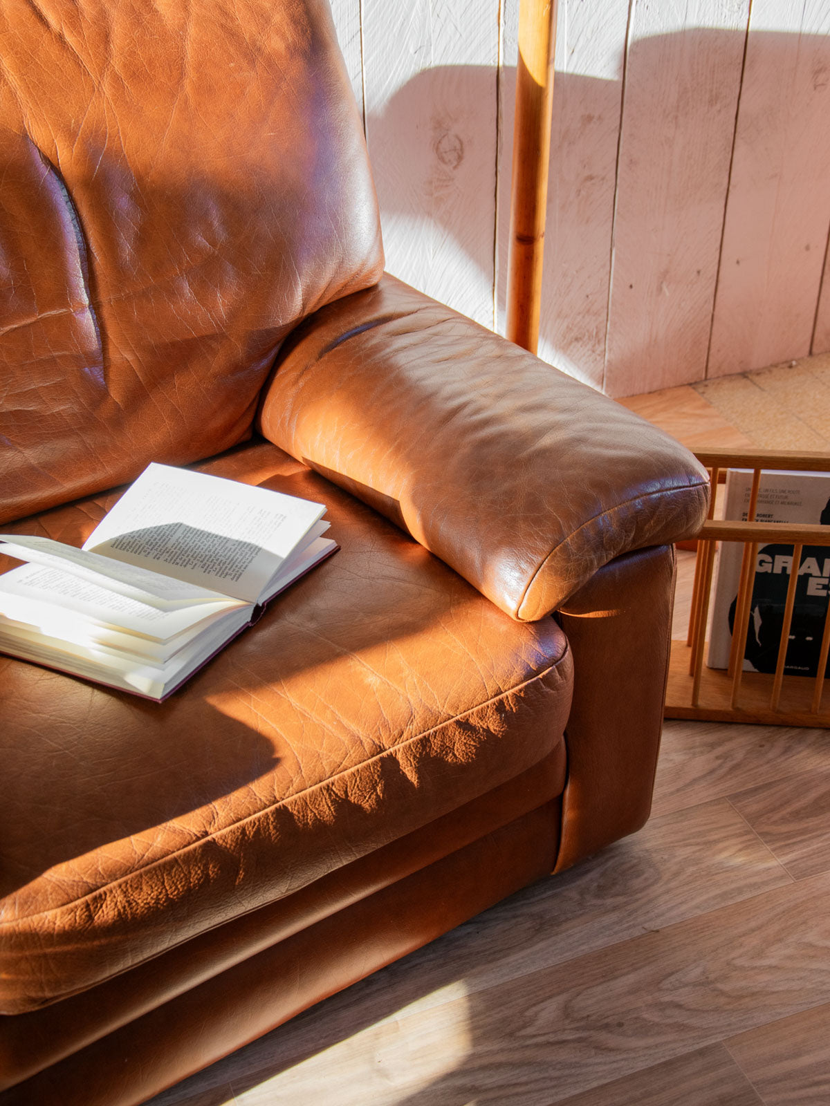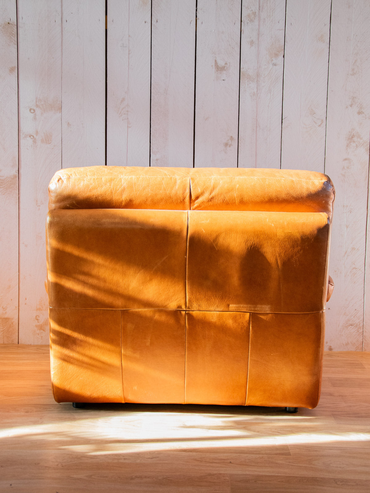 Embrace this camel leather armchair, with its supple, patinated leather that brings a warm and elegant touch to your interior. Its generous seat and balanced proportions offer immediate comfort, ideal for a reading nook or a living room where you want to create a calming atmosphere. The rich, natural leather blends easily with raw materials or neutral tones to create a contemporary and inviting ambiance. Minor, discreet discoloration at the front corners.