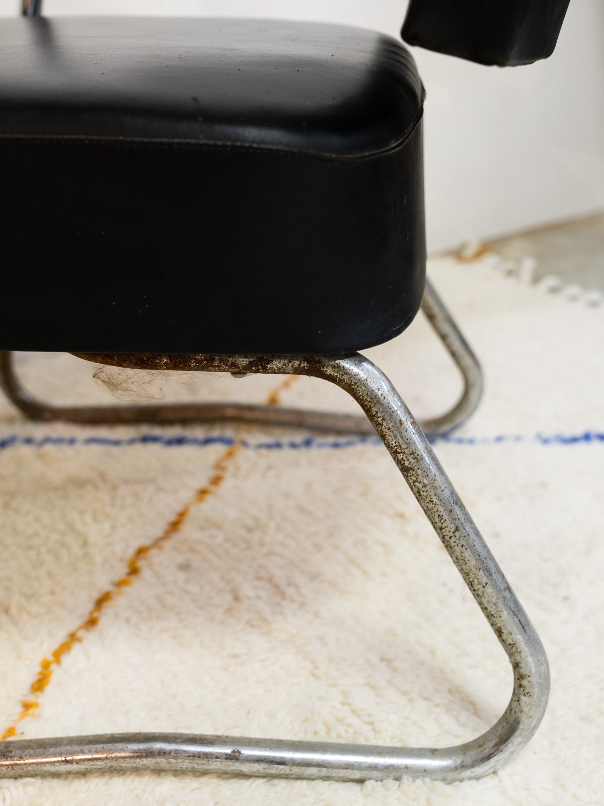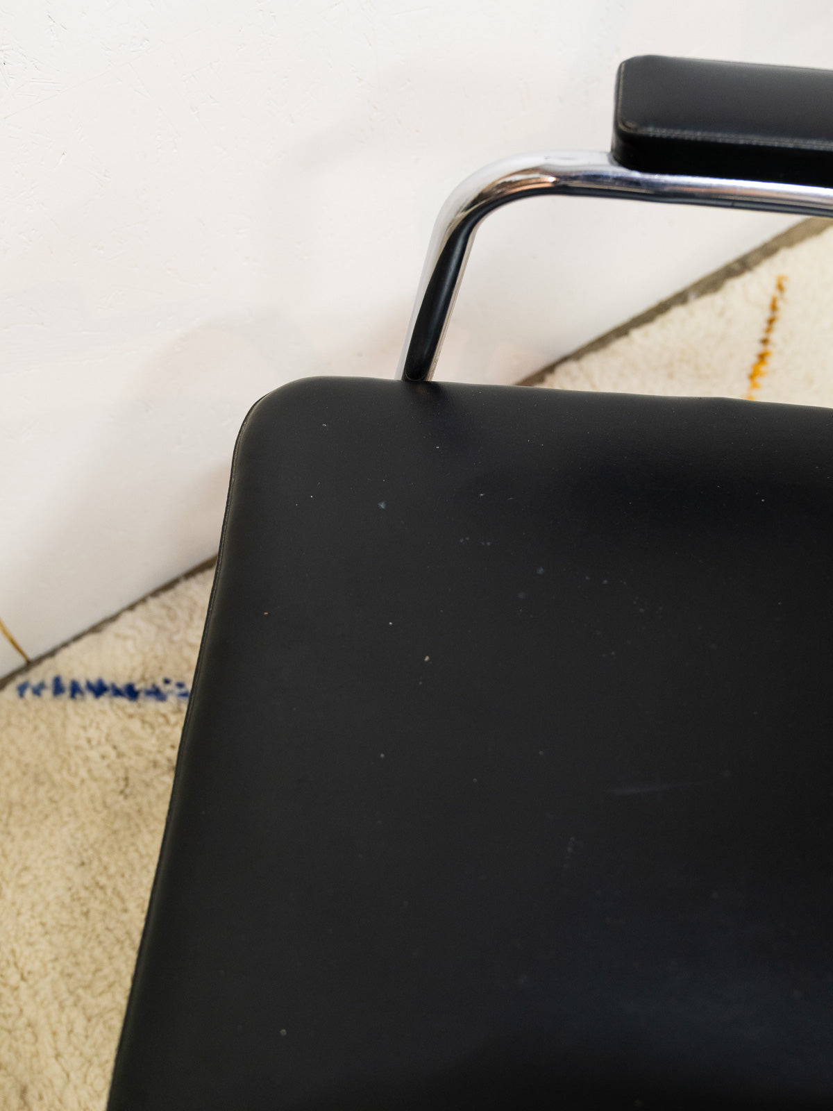 Embrace this set of two black leather armchairs with chrome legs, inspired by vintage barber chairs, which blend vintage character with industrial lines. Their understated style brings a warm and structured presence to your interior. The patinated leather and metallic finish create a retro, elegant, and inviting atmosphere. A few signs of age tell their story.