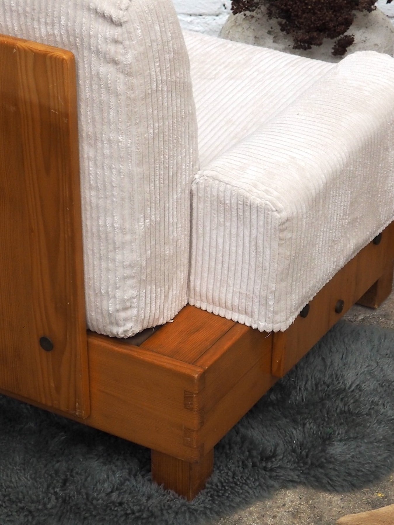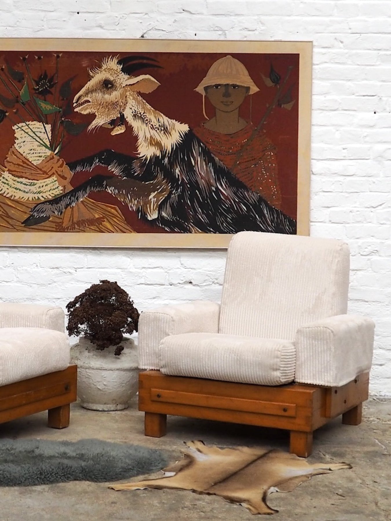 Adoptez cette paire de fauteuils des années 1970 en pin, où la silhouette brutaliste dialogue avec un velours côtelé écru au toucher chaleureux. Les détails en laiton, qui dissimulent les vis, apportent une note graphique et soignée, tandis que l'assise généreuse et les proportions affirmées conviennent parfaitement à un salon ou un coin lecture. Les housses ont été refaites en tissu Aquaclean, traitées et déhoussables grâce à des fermetures éclair pour un entretien facile, conjuguant caractère vintage et confort contemporain.