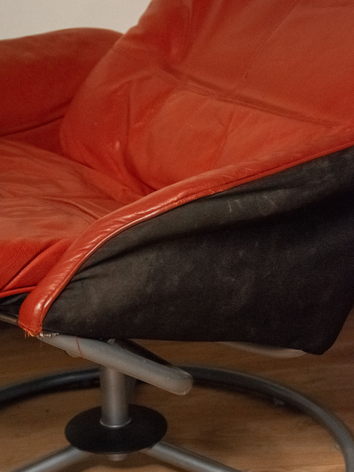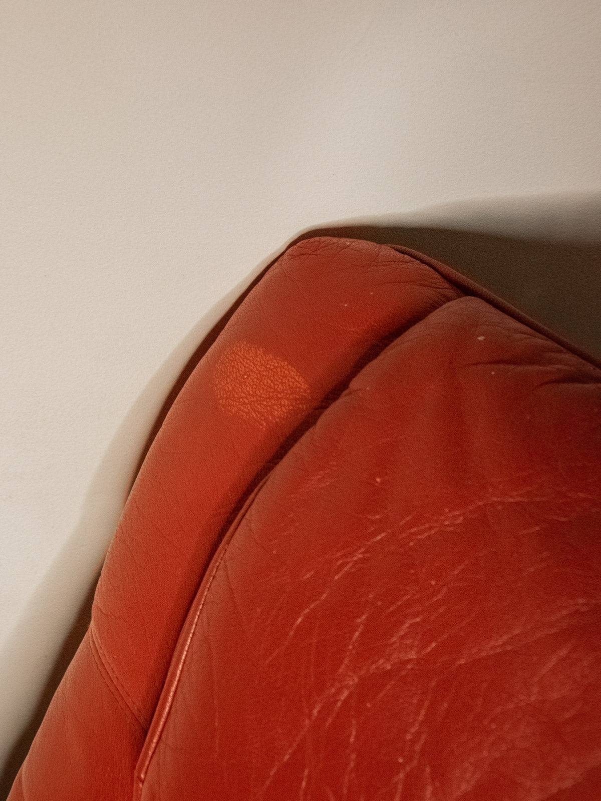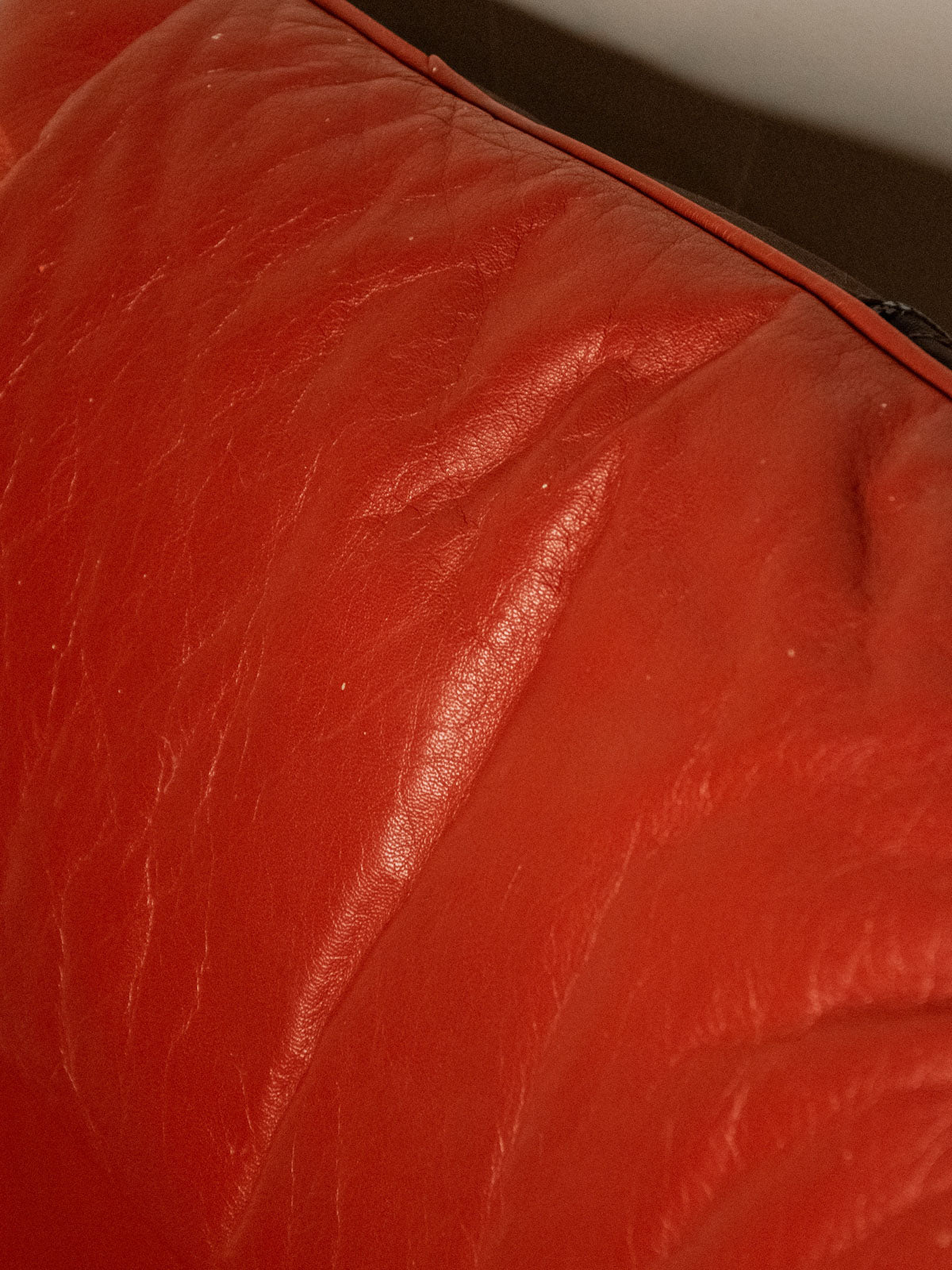 A red faux leather armchair with vintage charm, accompanied by a matching ottoman. Its chic design and simple lines bring a beautiful touch to your space. Easy to unfold for lounging, it invites you to relax in comfort. A few signs of age reinforce its authenticity. A piece full of character, perfect for dressing up a living room or cozy corner.