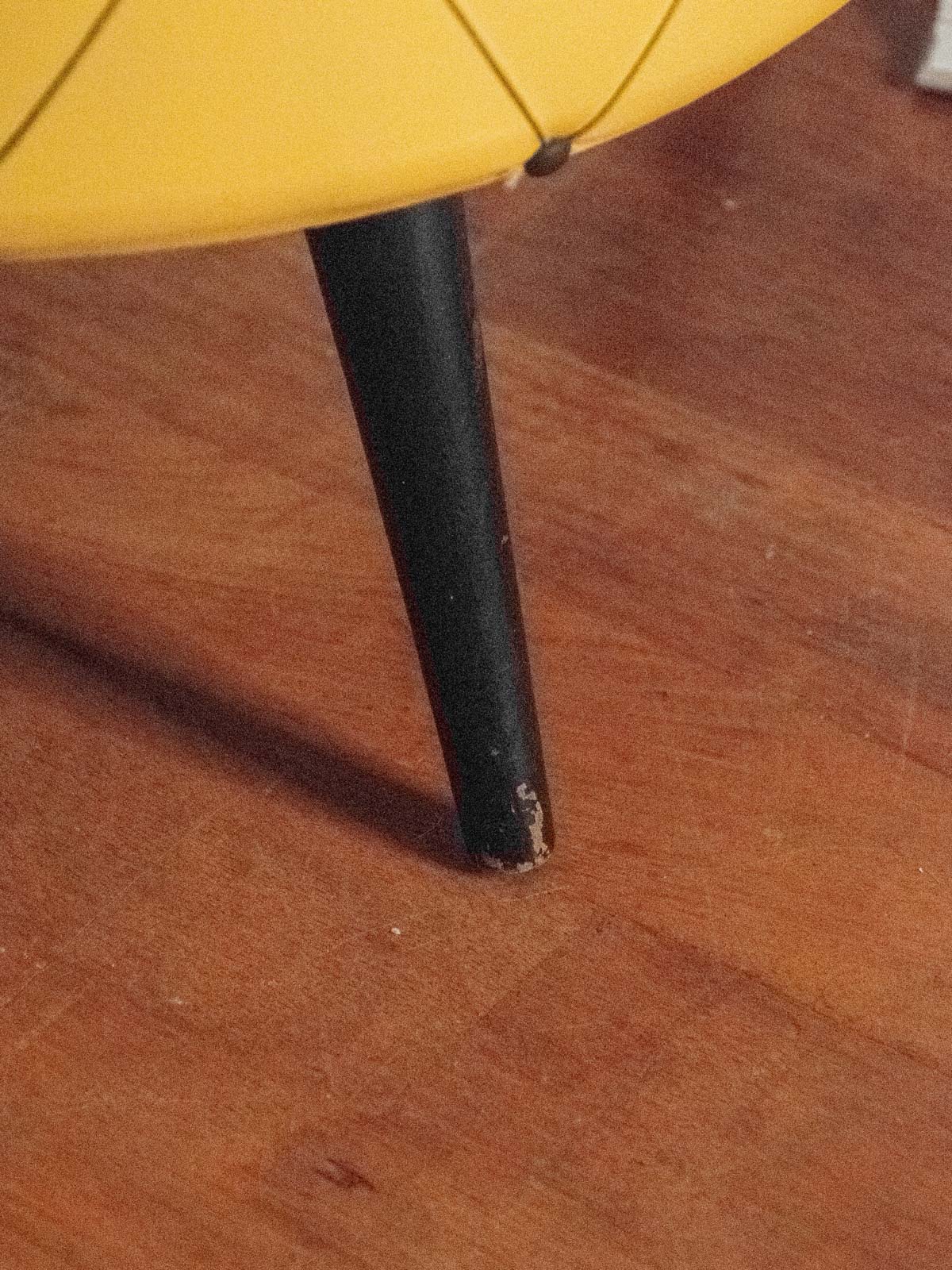 Discover this 1950s storage stool in quilted faux leather, combining a comfortable seat with discreet storage thanks to its compartmentalized interior. Its compact size and storage compartment under the lid make it practical for an entryway, bedroom, or living room, while its splayed legs add a touch of elegant retro style. The contrasting textures create a warm and graphic atmosphere. Minor mark visible.