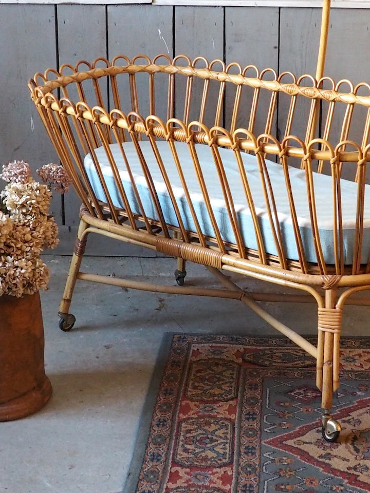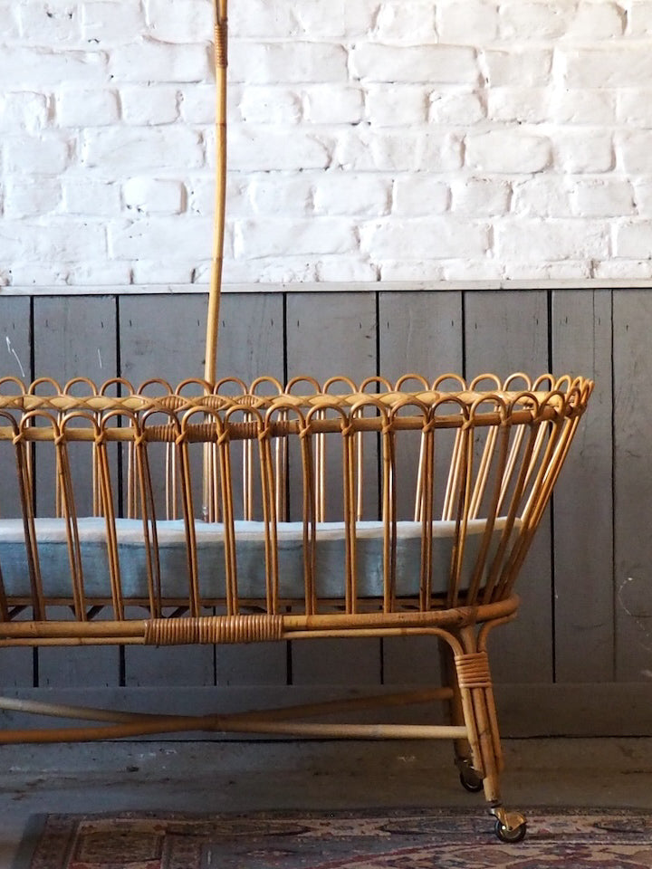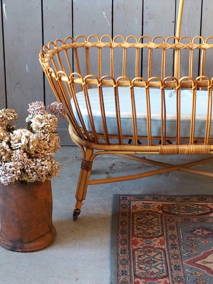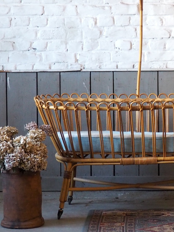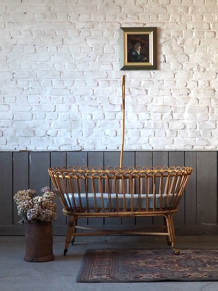Add a touch of warmth and natural charm to your home with this beautifully preserved wicker cradle. Complete with its elegant frame and original mattress, it brings a soft and romantic feel to any bedroom or living room. Its antique lines create a gentle and romantic atmosphere. Its delicate proportions make it a lovely decorative piece, ideal for photo displays, storing lightweight textiles, or displaying dolls and other objects. For decorative use only: not for use as a crib. (No longer meets current EN 716 standards)