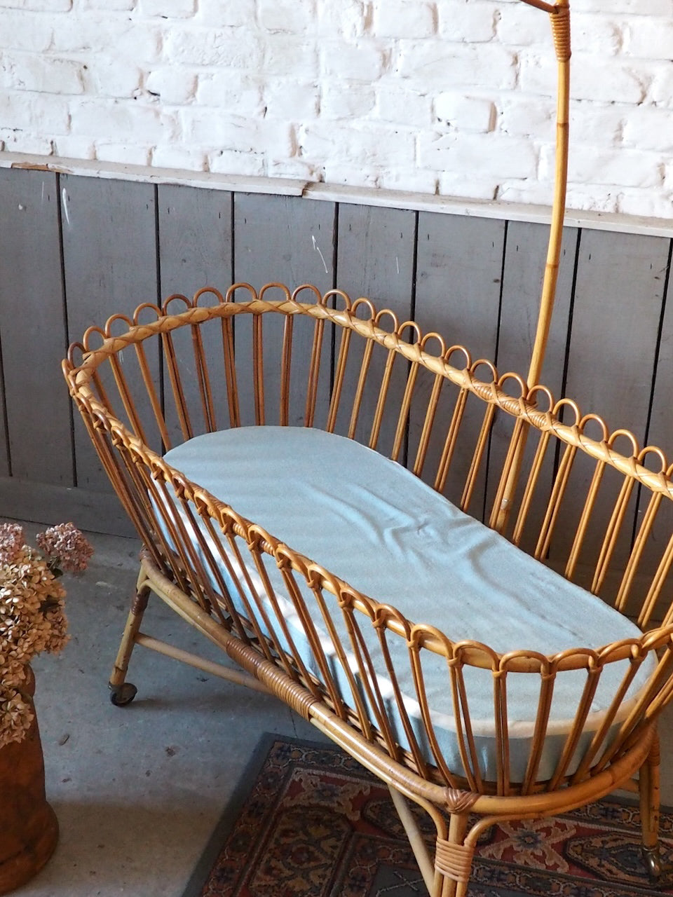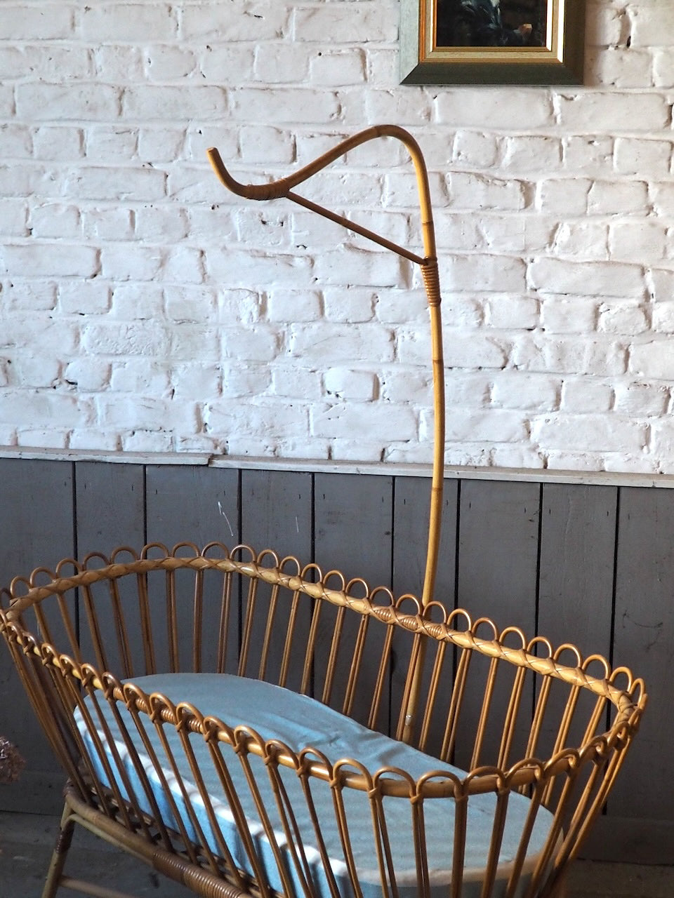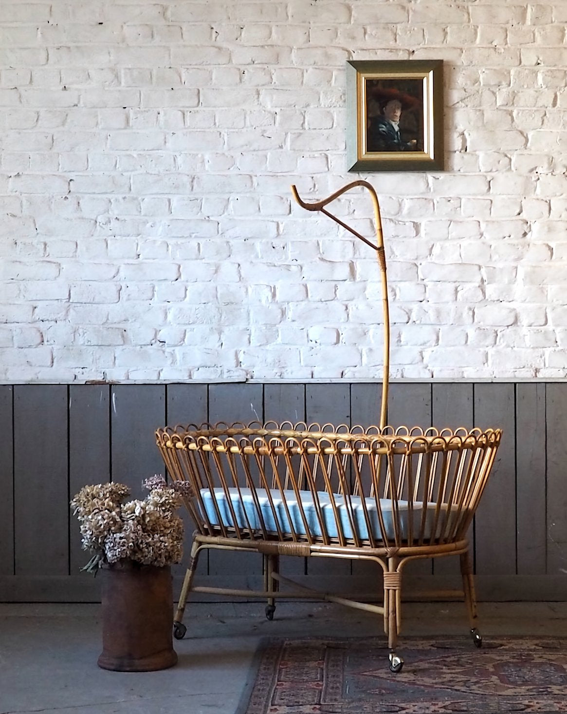 Add a touch of warmth and natural charm to your home with this beautifully preserved wicker cradle. Complete with its elegant frame and original mattress, it brings a soft and romantic feel to any bedroom or living room. Its antique lines create a gentle and romantic atmosphere. Its delicate proportions make it a lovely decorative piece, ideal for photo displays, storing lightweight textiles, or displaying dolls and other objects. For decorative use only: not for use as a crib. (No longer meets current EN 716 standards)