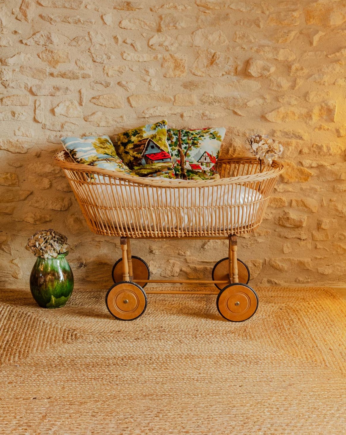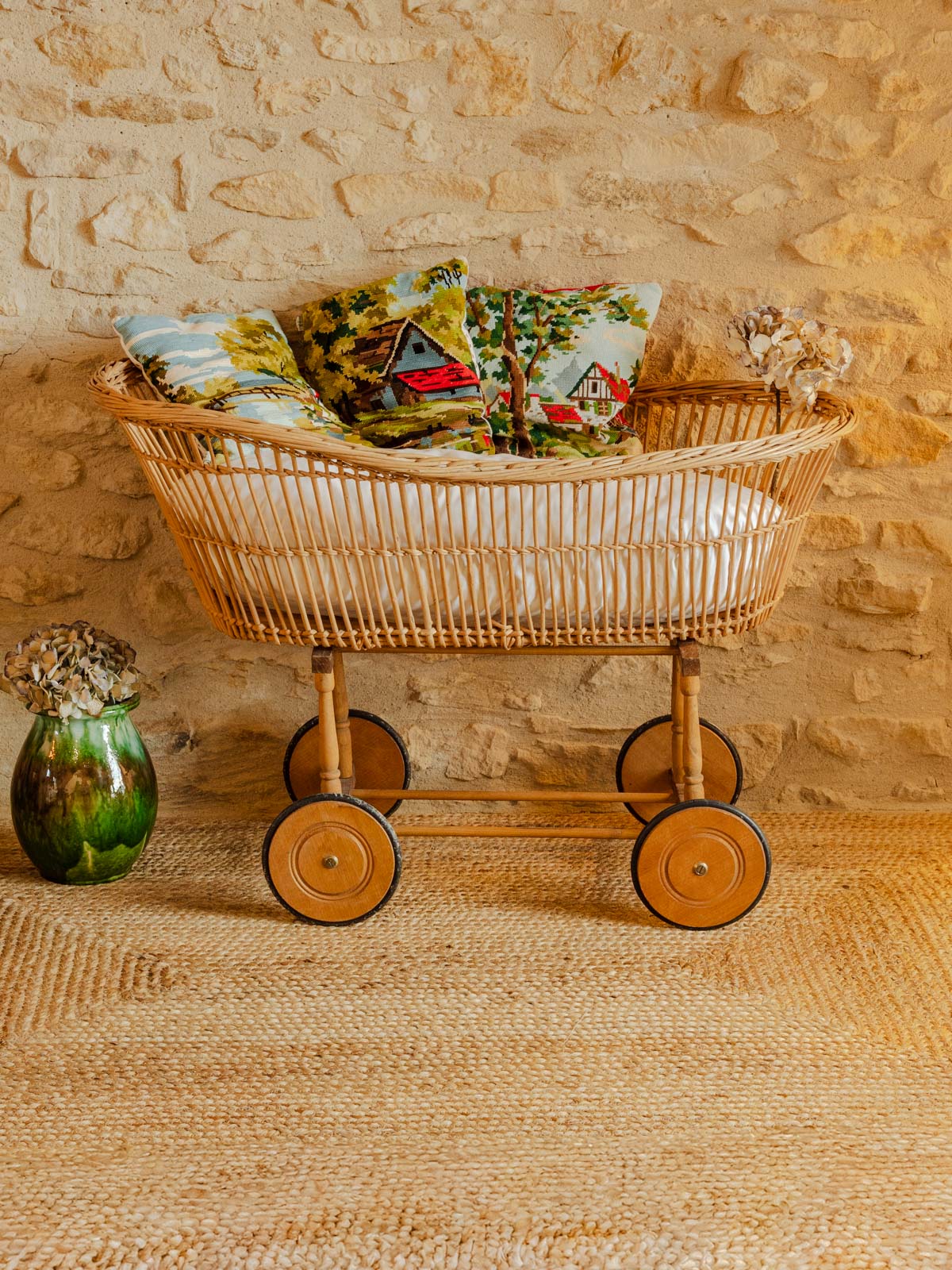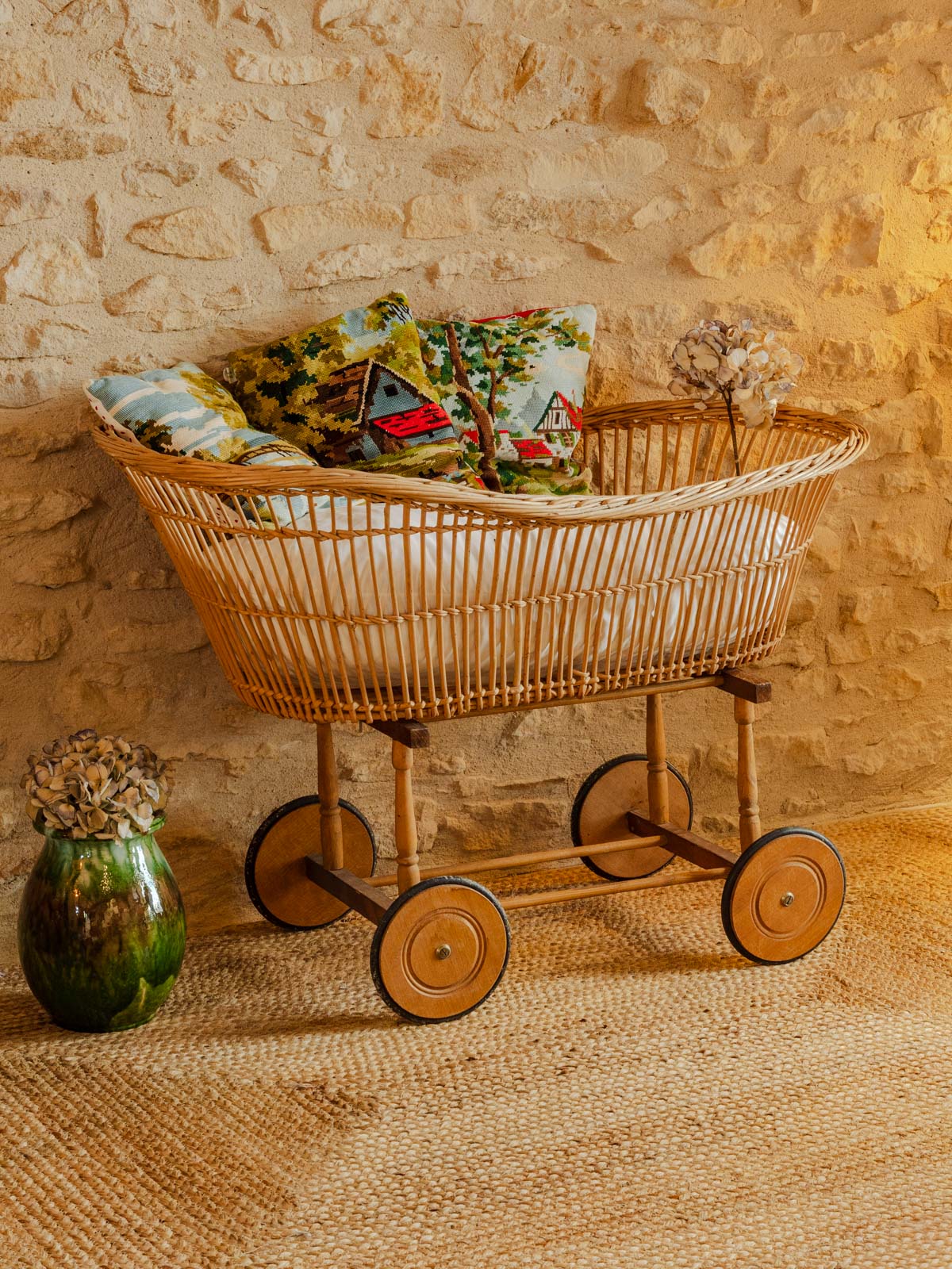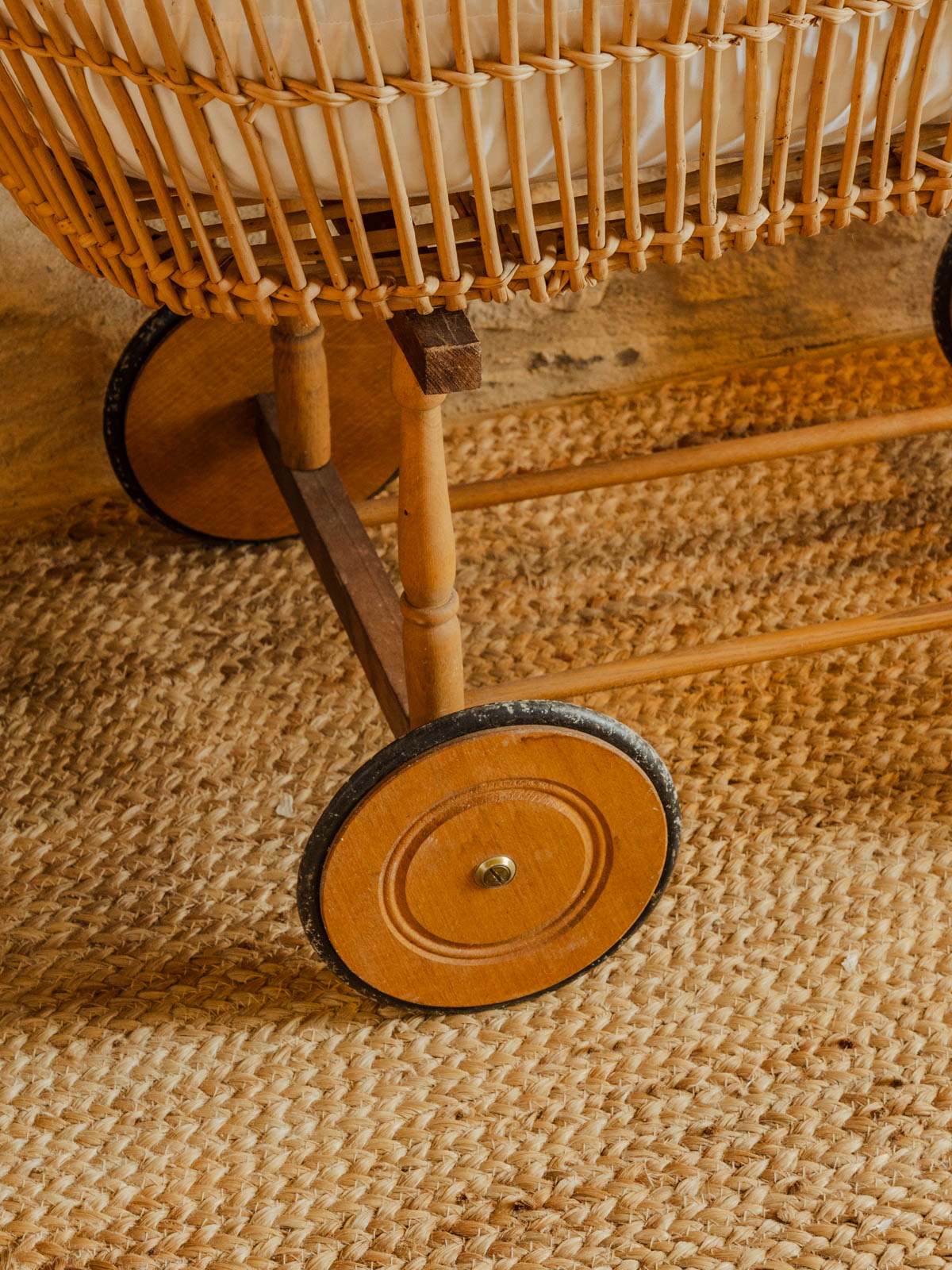 Discover this vintage rattan cradle, supported by a wooden frame that combines natural elegance and sturdiness. An iconic piece that blends elegance and softness. The flat, swiveling latch system ensures easy assembly, while the warm rattan material creates a soothing and authentic atmosphere. This cradle does not meet current safety standards (EN 716) and should not be used for a baby's sleep.
