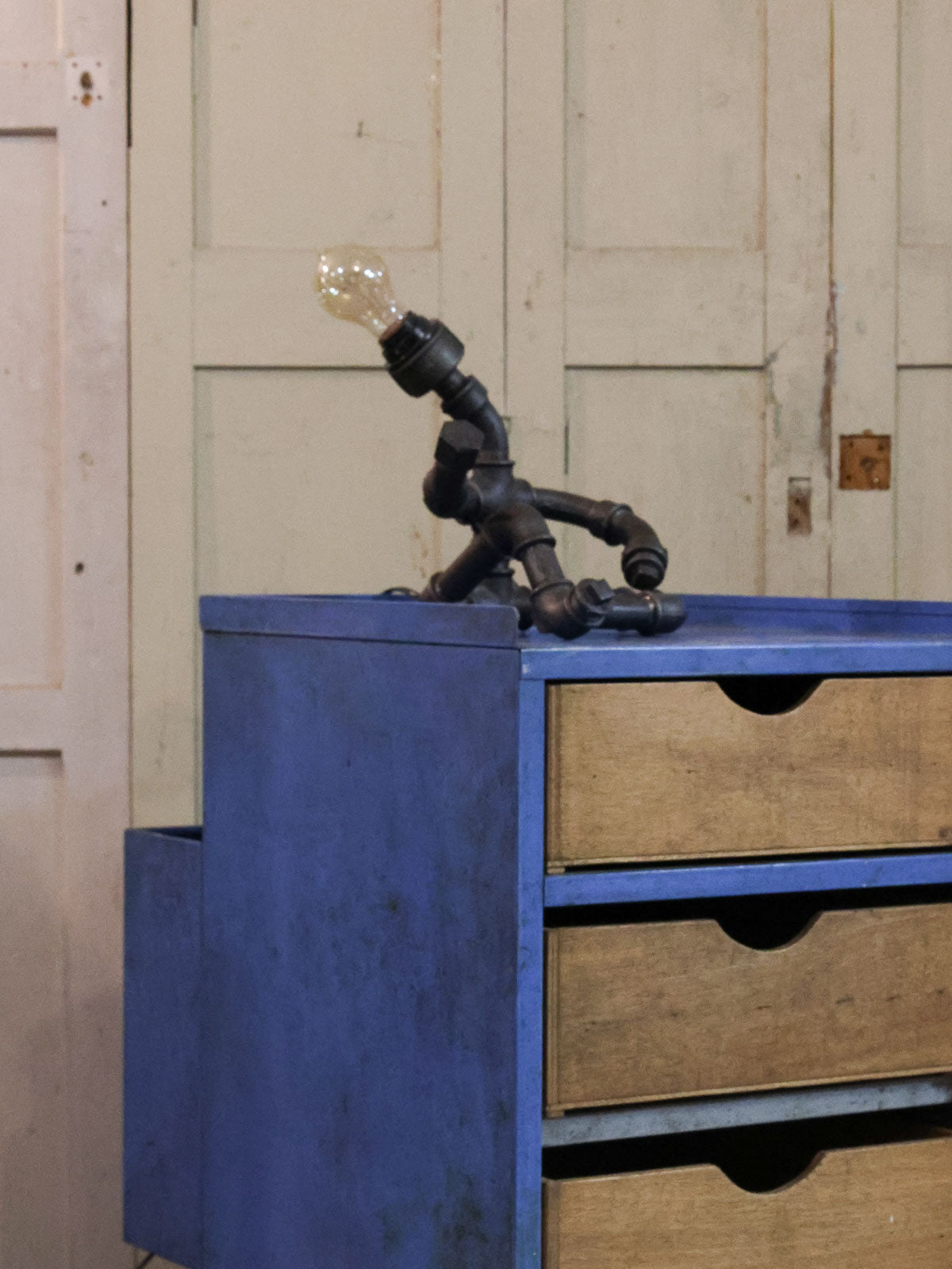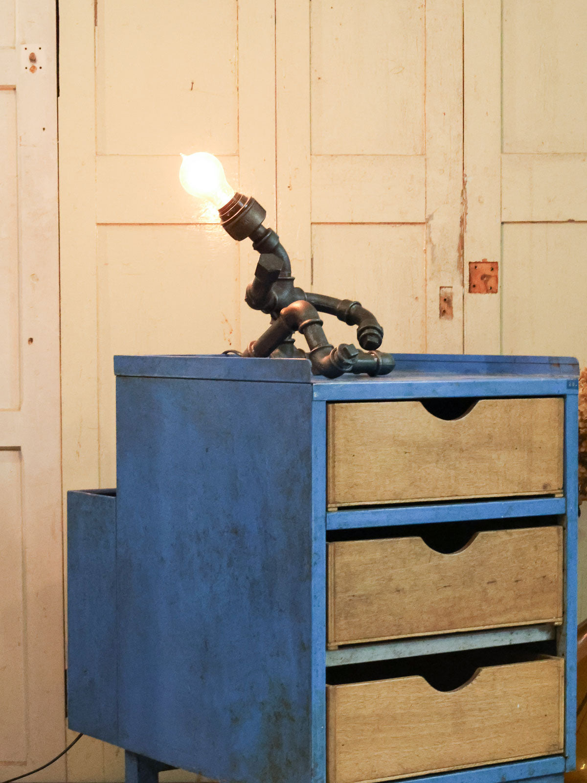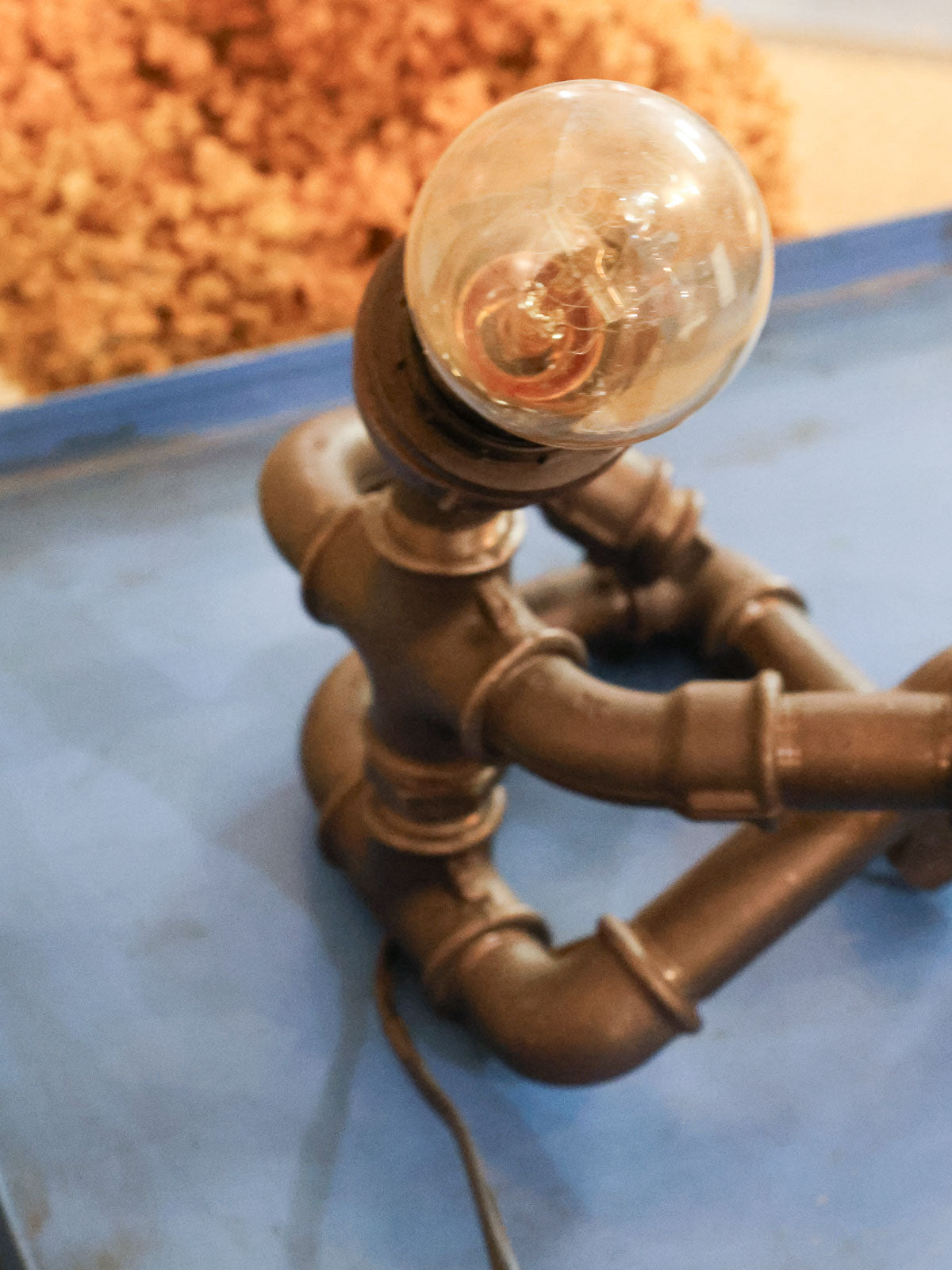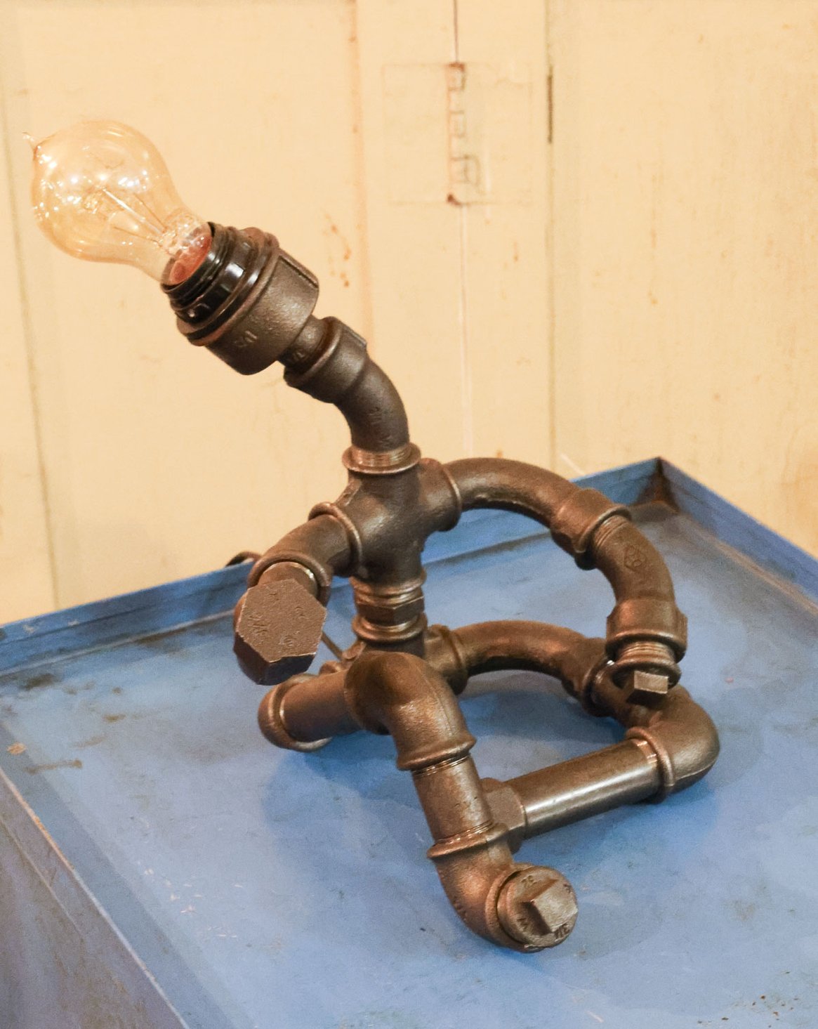 Découvrez cette lampe-sculpture industrielle figurant un bonhomme assis, façonnée à partir de tubes de plomberie au rendu brut et graphique. Son gabarit contenu lui confère une présence affirmée mais discrète, parfaite pour animer un bureau, une table de chevet ou une étagère sans encombrer l'espace. Le métal patiné diffuse une lumière douce qui souligne volumes et ombres, créant une atmosphère chaleureuse et atelier. Pièce à la fois fonctionnelle et décorative, elle s'intègre aisément à un intérieur contemporain ou industriel.