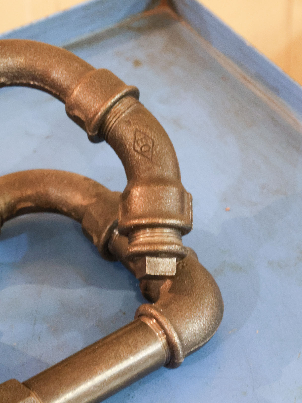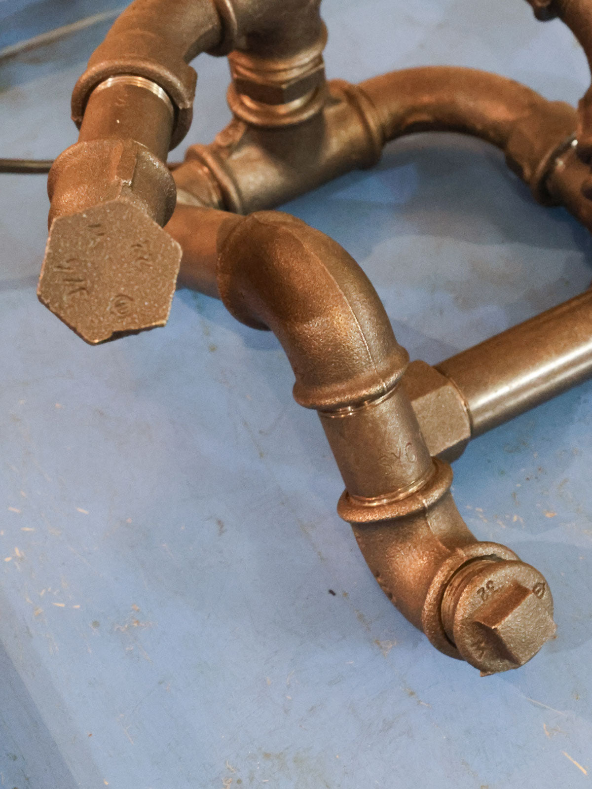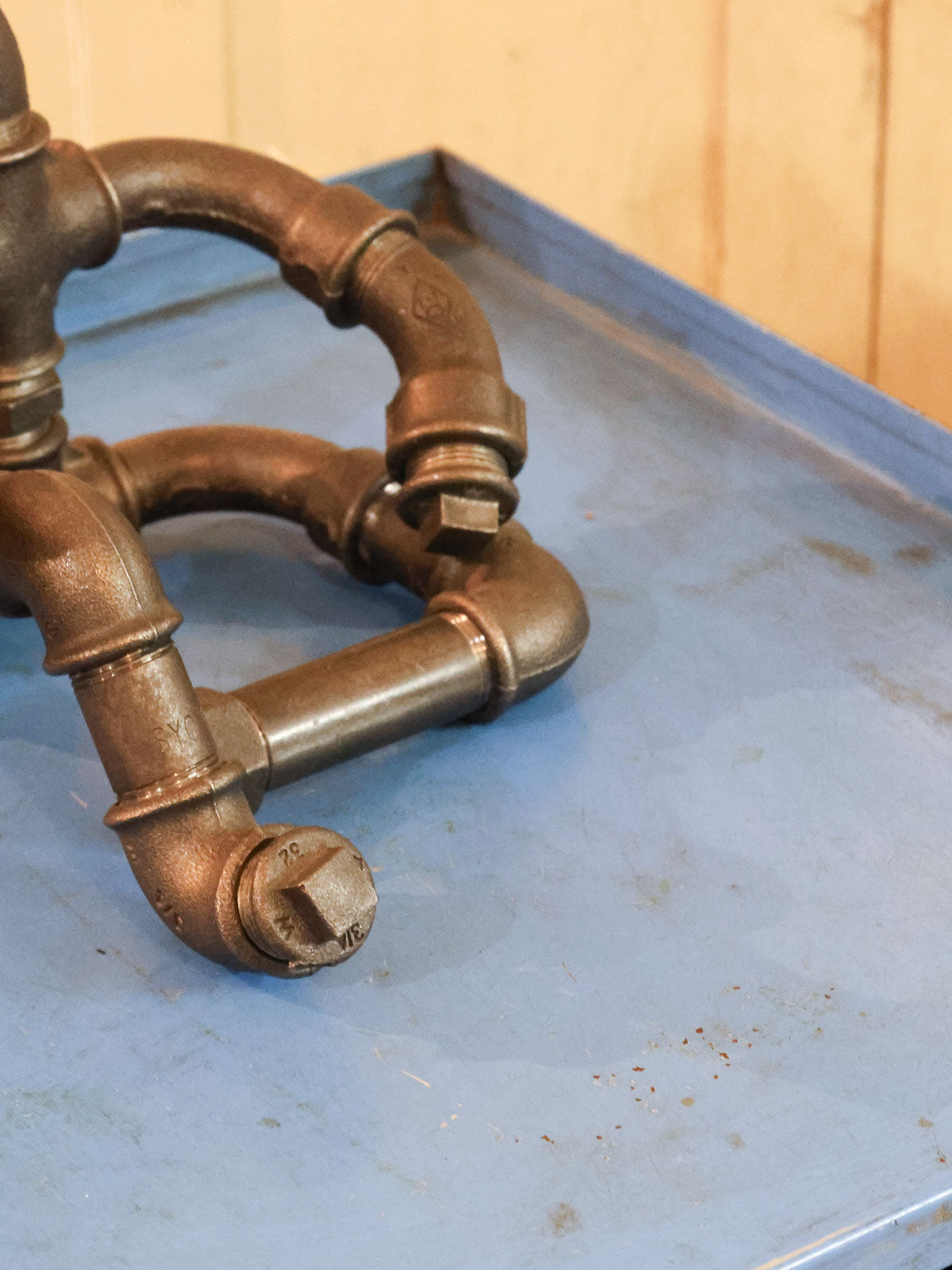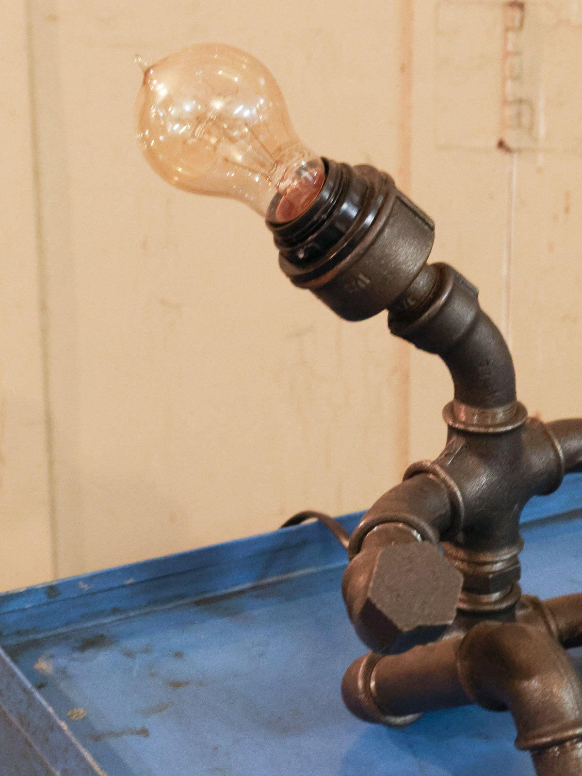 Découvrez cette lampe-sculpture industrielle figurant un bonhomme assis, façonnée à partir de tubes de plomberie au rendu brut et graphique. Son gabarit contenu lui confère une présence affirmée mais discrète, parfaite pour animer un bureau, une table de chevet ou une étagère sans encombrer l'espace. Le métal patiné diffuse une lumière douce qui souligne volumes et ombres, créant une atmosphère chaleureuse et atelier. Pièce à la fois fonctionnelle et décorative, elle s'intègre aisément à un intérieur contemporain ou industriel.