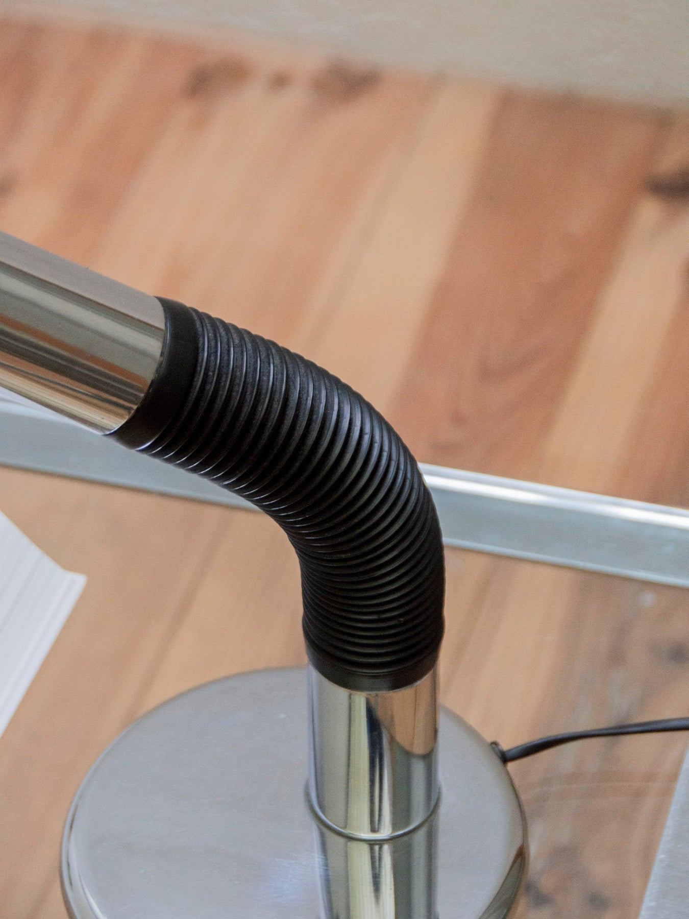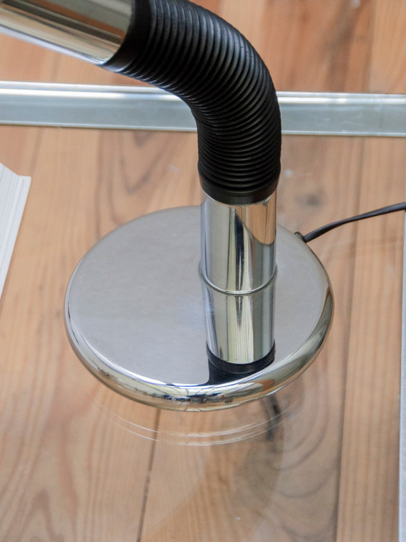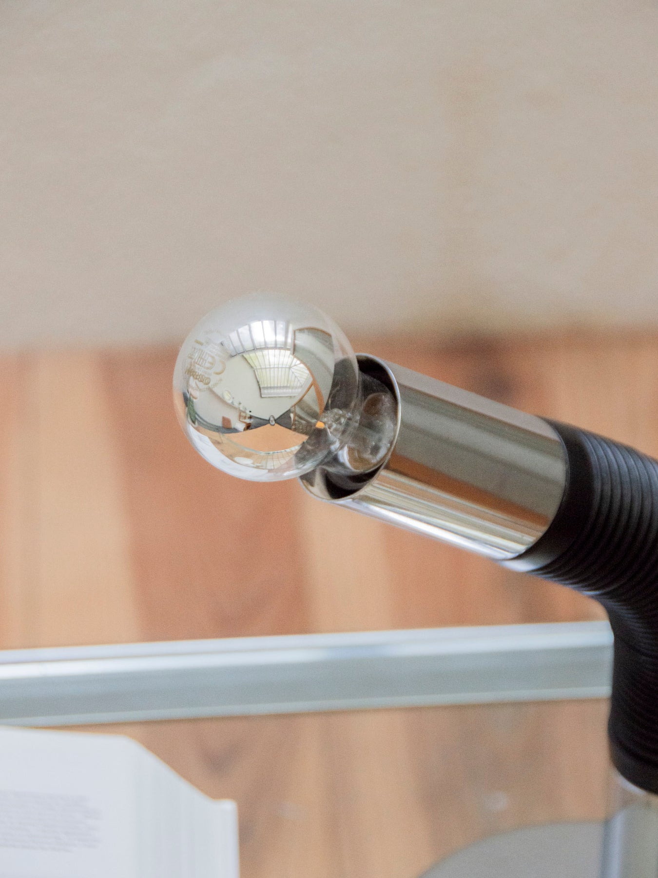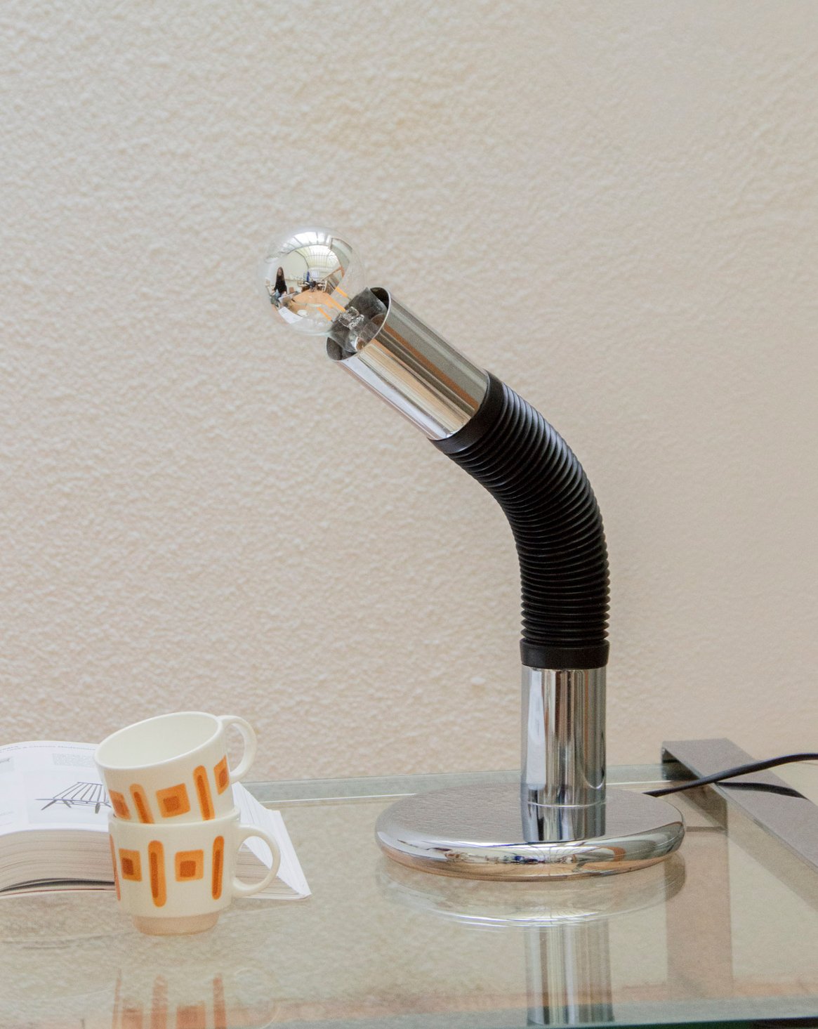 Choose the Elbow table lamp designed by E. Bellini for Targetti Sankey, an Italian creation from the 1970s with a clean, graphic design. Its black metal structure, enhanced with chrome elements, gives it a simple and refined look, while the adjustable arm allows you to precisely direct the beam for work or reading light. The compact base ensures a discreet presence on a desk or bedside table, creating a contemporary workshop atmosphere.