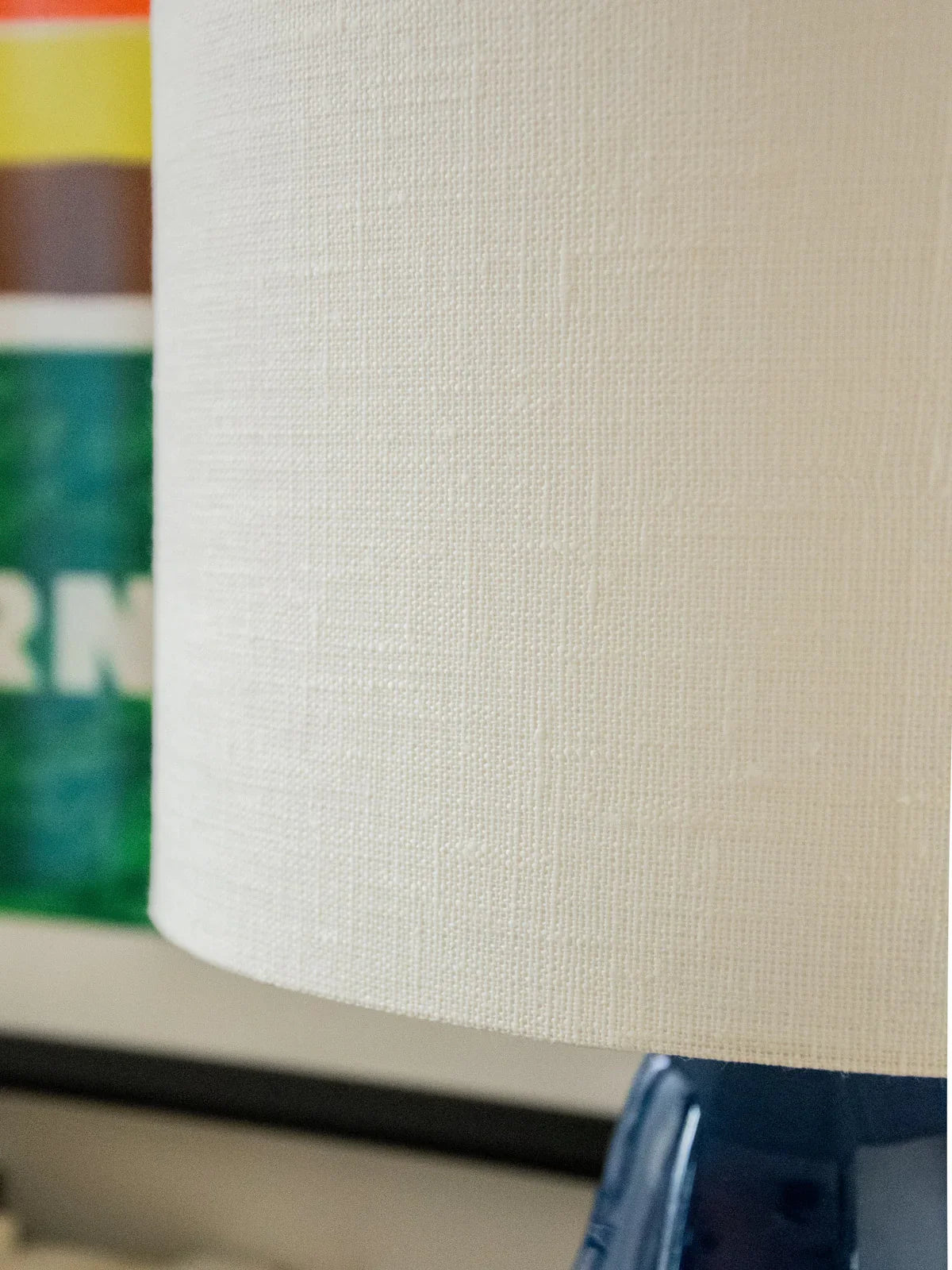 Enhance your interior with this ceramic lamp featuring a tall base and a deep blue glaze that accentuates its elegant silhouette. The round fabric shade diffuses a soft, enveloping light, ideal for creating a warm atmosphere in a living room, bedroom, or entryway. Sized to sit comfortably on a console table or bedside table without taking up too much space, it is designed for a standard bulb, allowing you to adjust the light intensity to your liking.