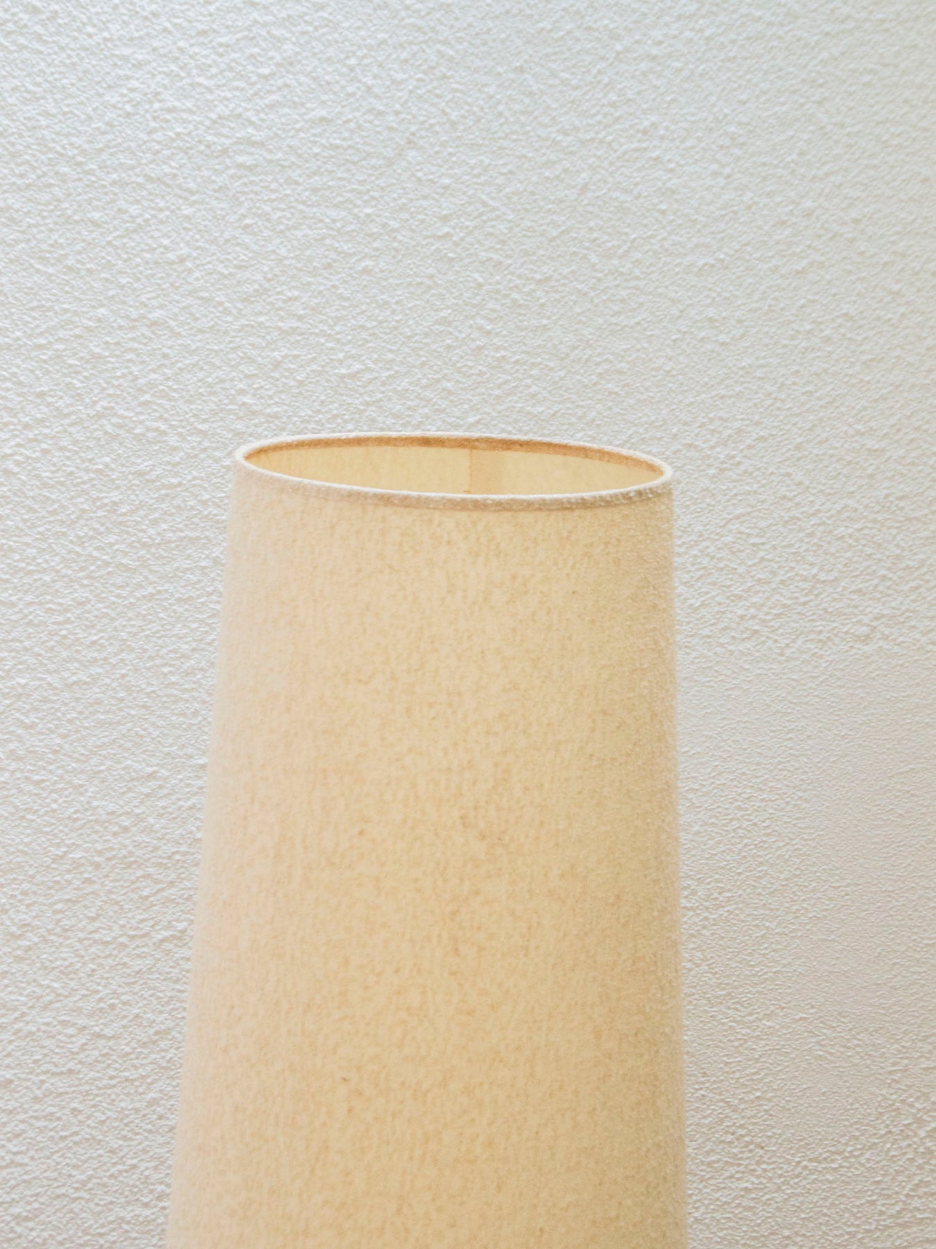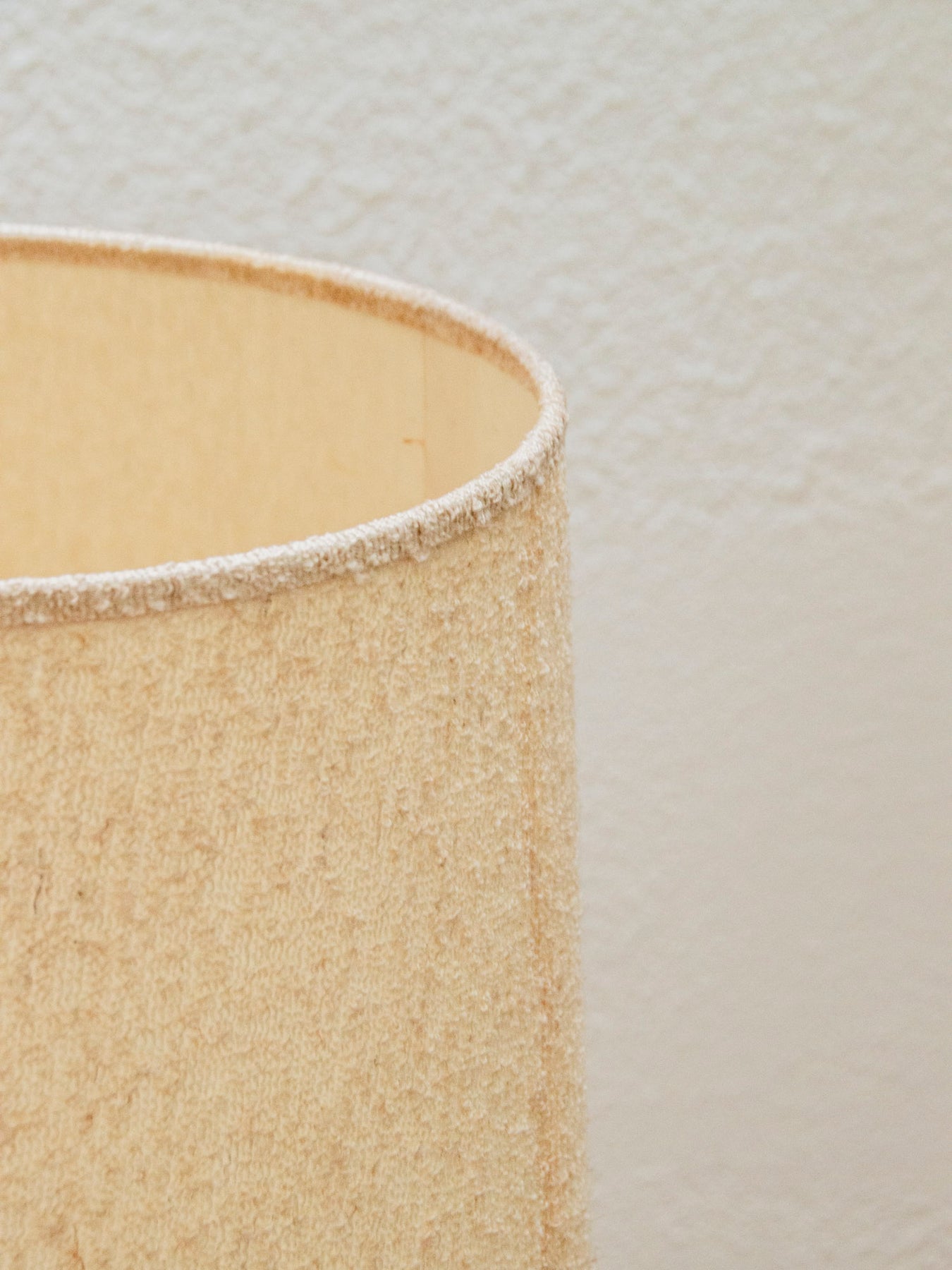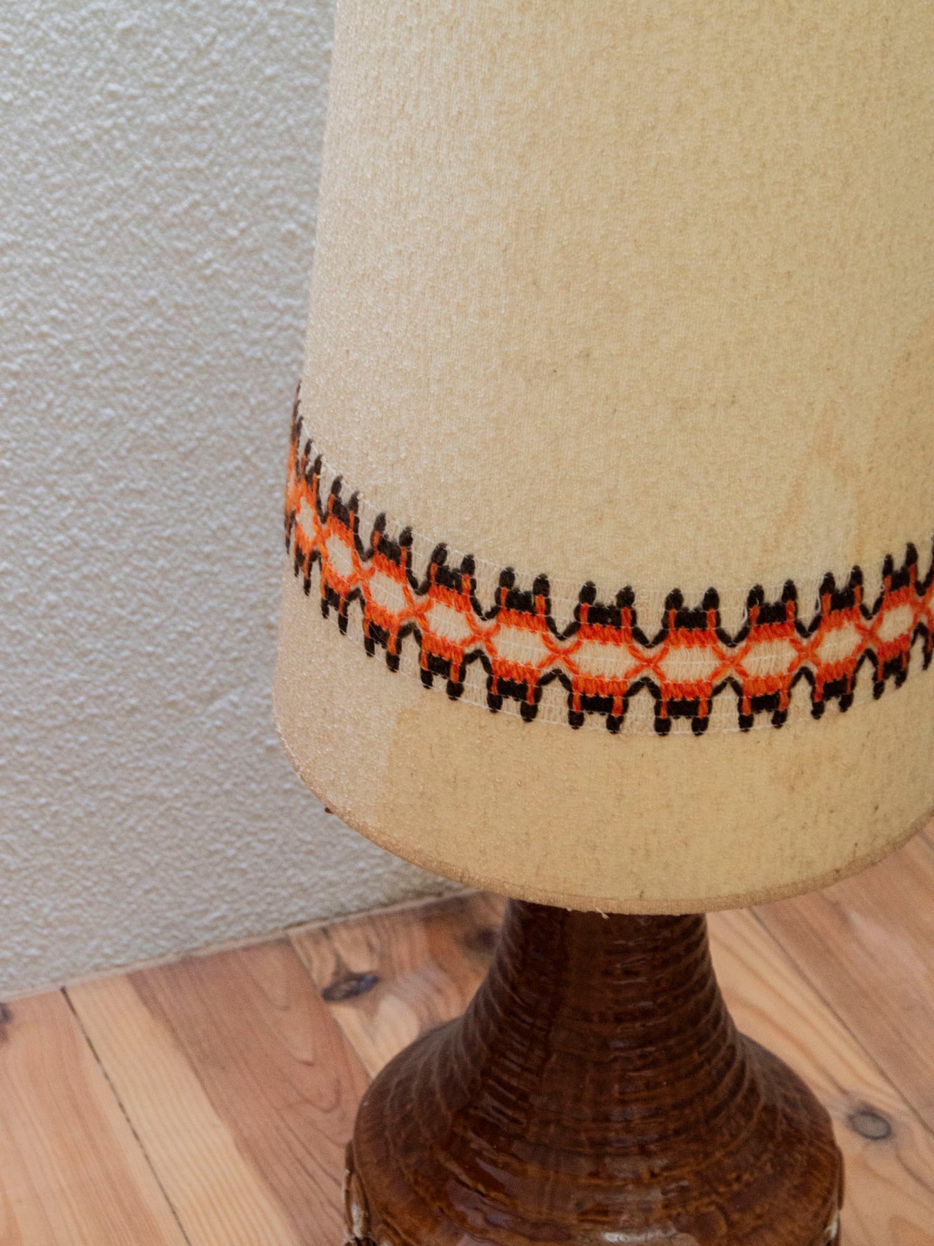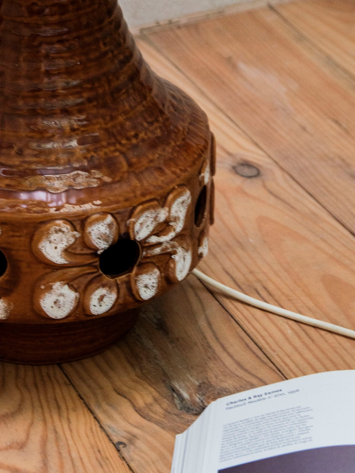 Enhance your interior with this 1970s brown ceramic table lamp, boasting a generous size and sculptural appeal. Its perforated base filters a soft light, creating beautiful plays of shadow, while the double switch allows you to adjust the ambiance to suit your mood. A small handle and the terracotta finish reinforce its retro character, ideal for a living room or bedroom seeking a presence that is both discreet and expressive. (Small stain on the fabric.)