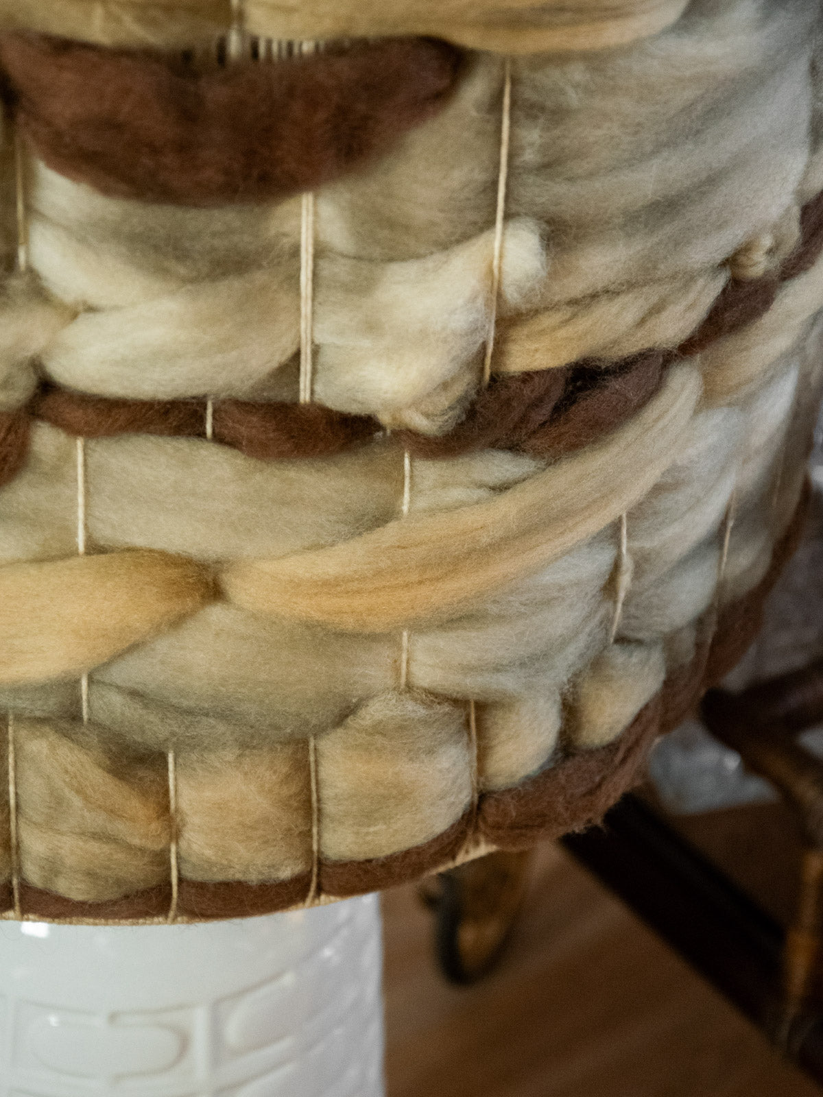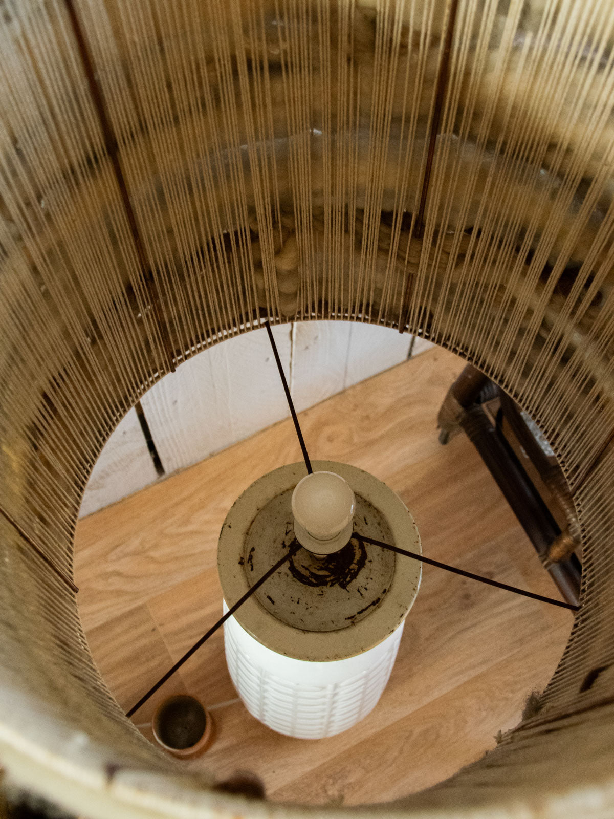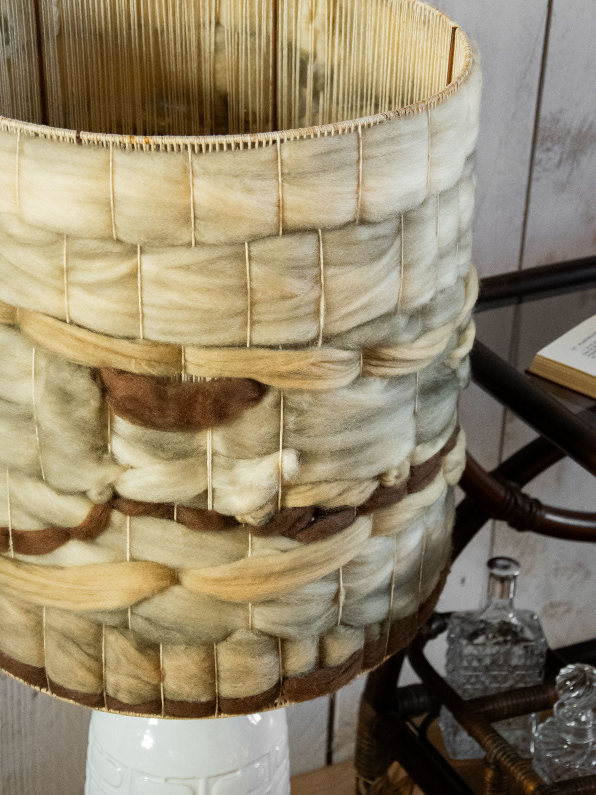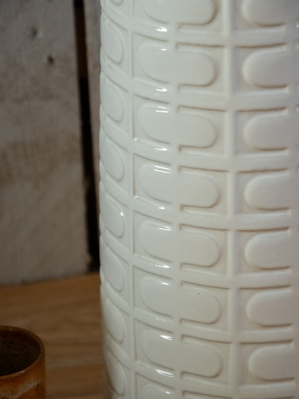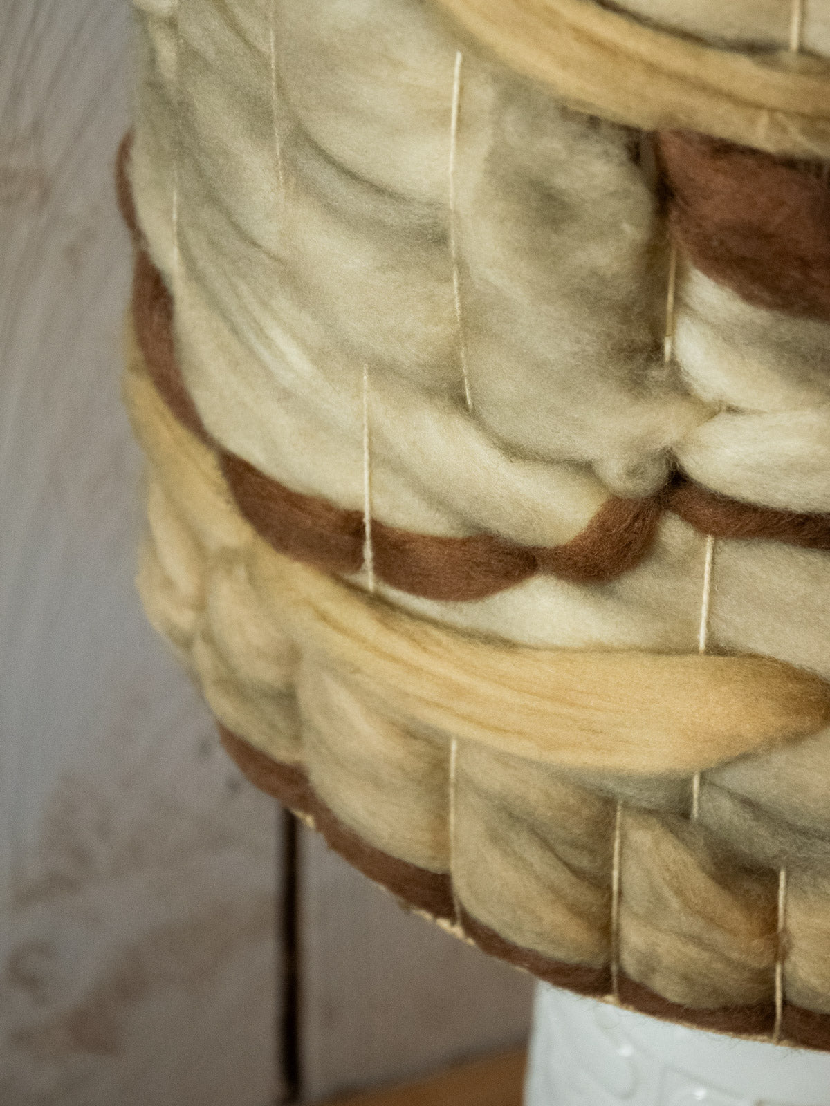 Enhance your interior with this large table lamp in wool and ceramic, a subtle reflection of 1960s West German design. Its generous size and balanced proportions make it an ideal accent piece for a reading nook or next to a sofa, adding an elegant presence without overwhelming the space. The wool shade diffuses a soft, enveloping light, while the ceramic base provides a warm, tactile texture; compatible with an E14 bulb for controlled lighting.