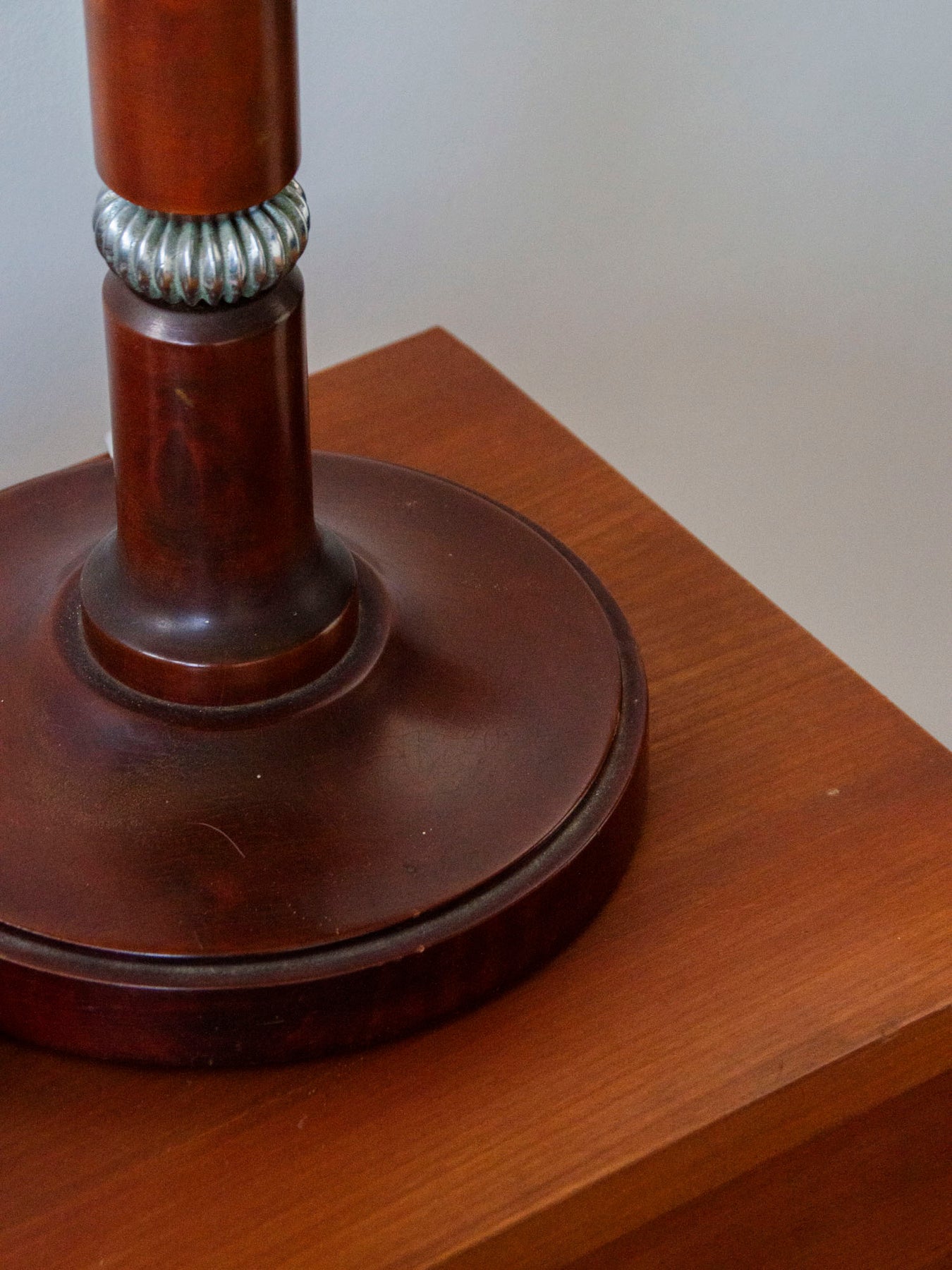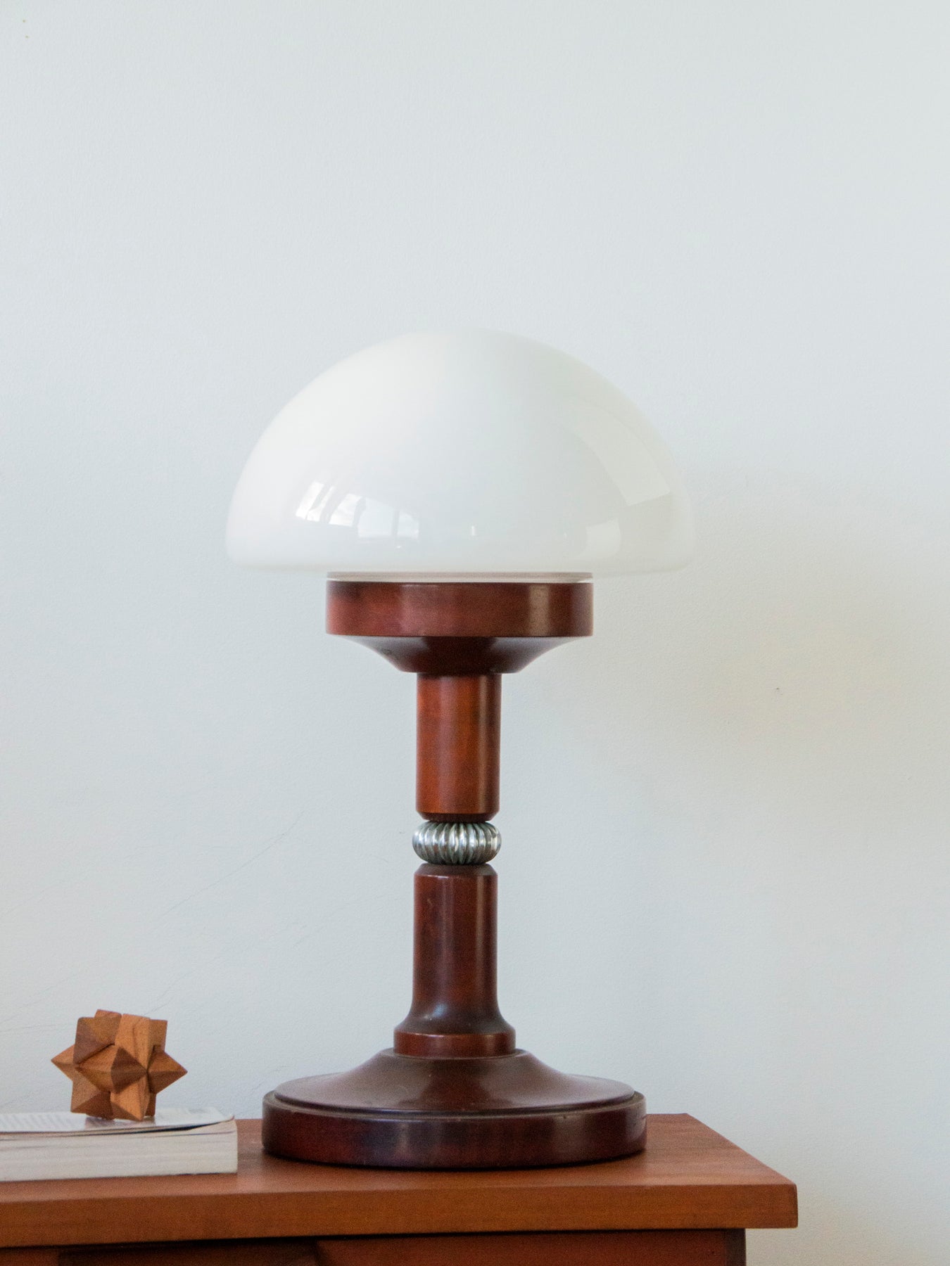 Elevate your interior with this 1970s mushroom lamp in solid teak and opaline glass, designed to add an elegant touch to a table or desk. Its clean lines and the use of fine materials—wood, glass, and sculpted metal at the center of the base—give it a character that is both understated and inviting. The opaline glass diffuses a soft light, ideal for a reading nook or for creating a cozy atmosphere. There is a very slight chip on the edge of the base, barely noticeable.