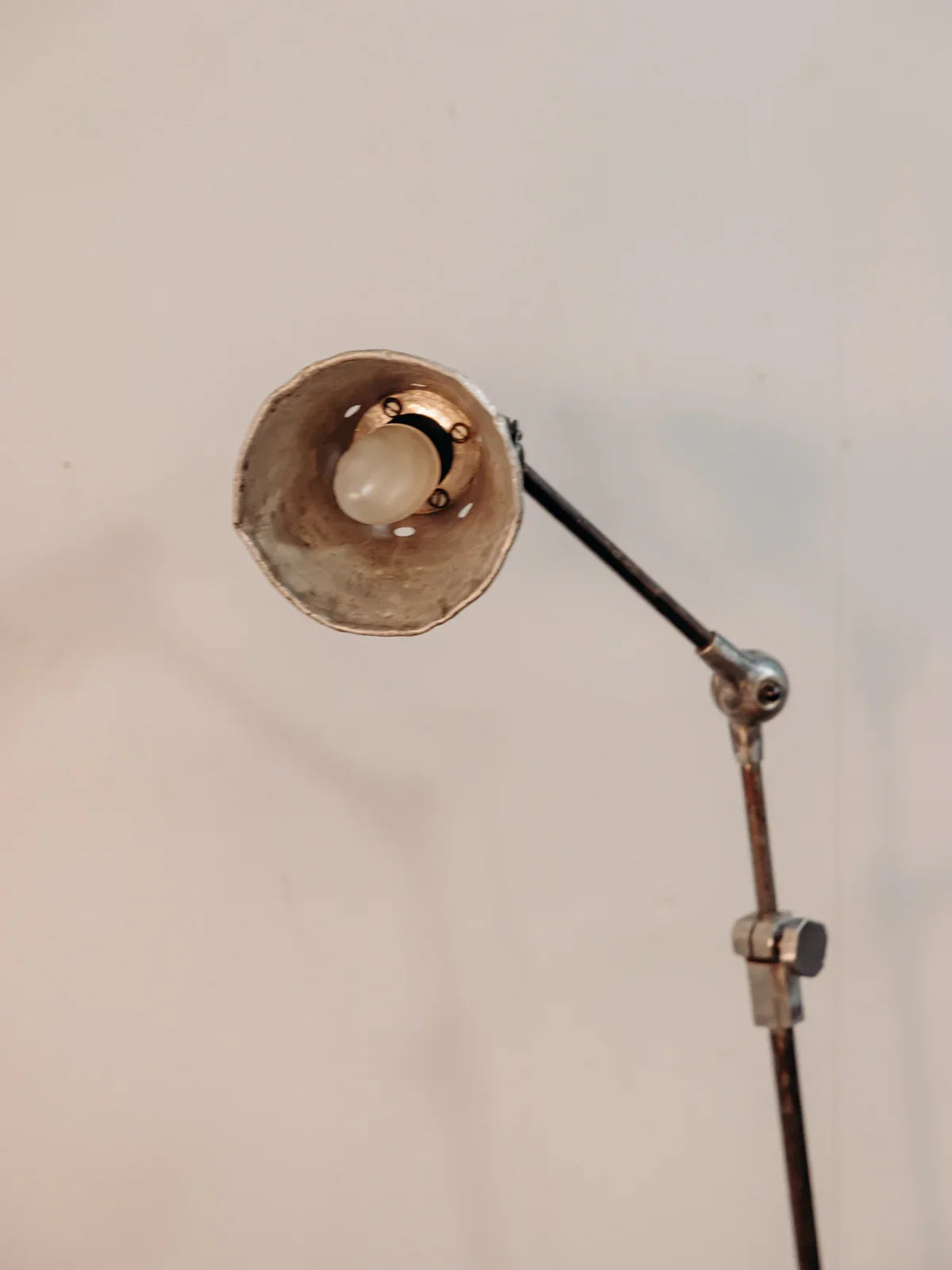 Embrace this handcrafted industrial metal lamp, entirely handmade, with a wide base that provides stability and an elegant presence. Its removable front allows for easy access and replacement of the E27 bulb, offering direct light perfect for a reading nook or work table. The patinated metal and raw lines create a warm, authentic, and contemporary atmosphere that enhances a loft-style interior or office. Minor signs of age are present.