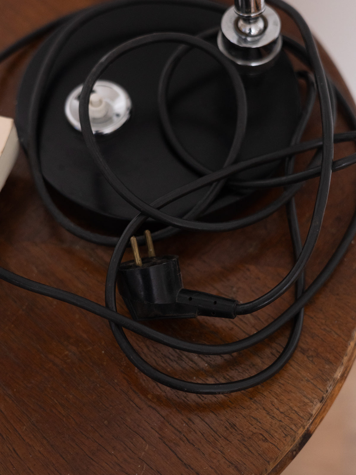 Add a touch of contemporary discretion to your interior with this table lamp featuring a black base and chrome stem, topped with a black and white adjustable round head. The base allows you to adjust the stem's angle, while the head directs the light for focused illumination, ideal near a desk or bedside table. The push button offers simple, tactile operation, and the combination of chrome and black creates an elegant and sophisticated ambiance. Minor signs of age.